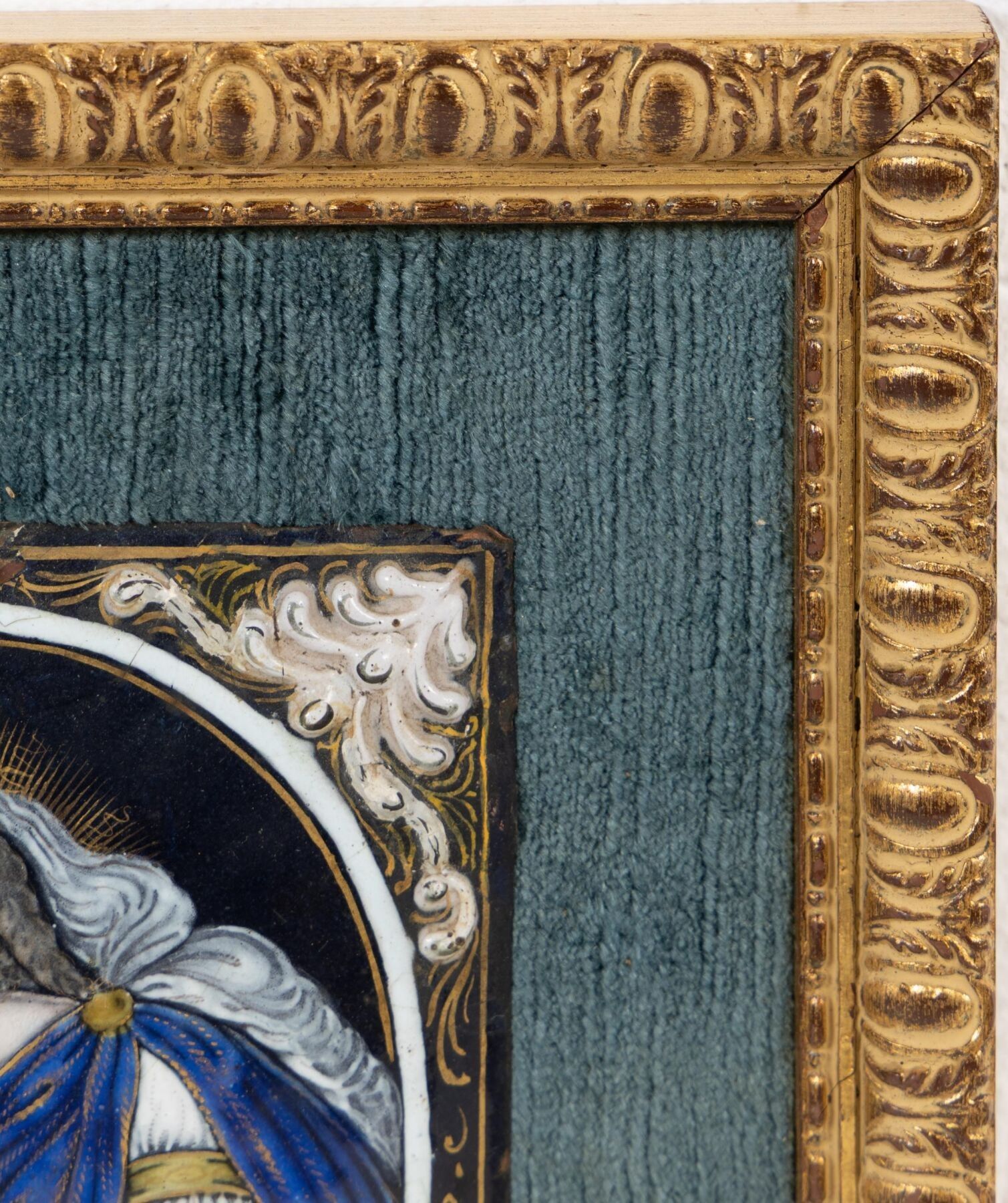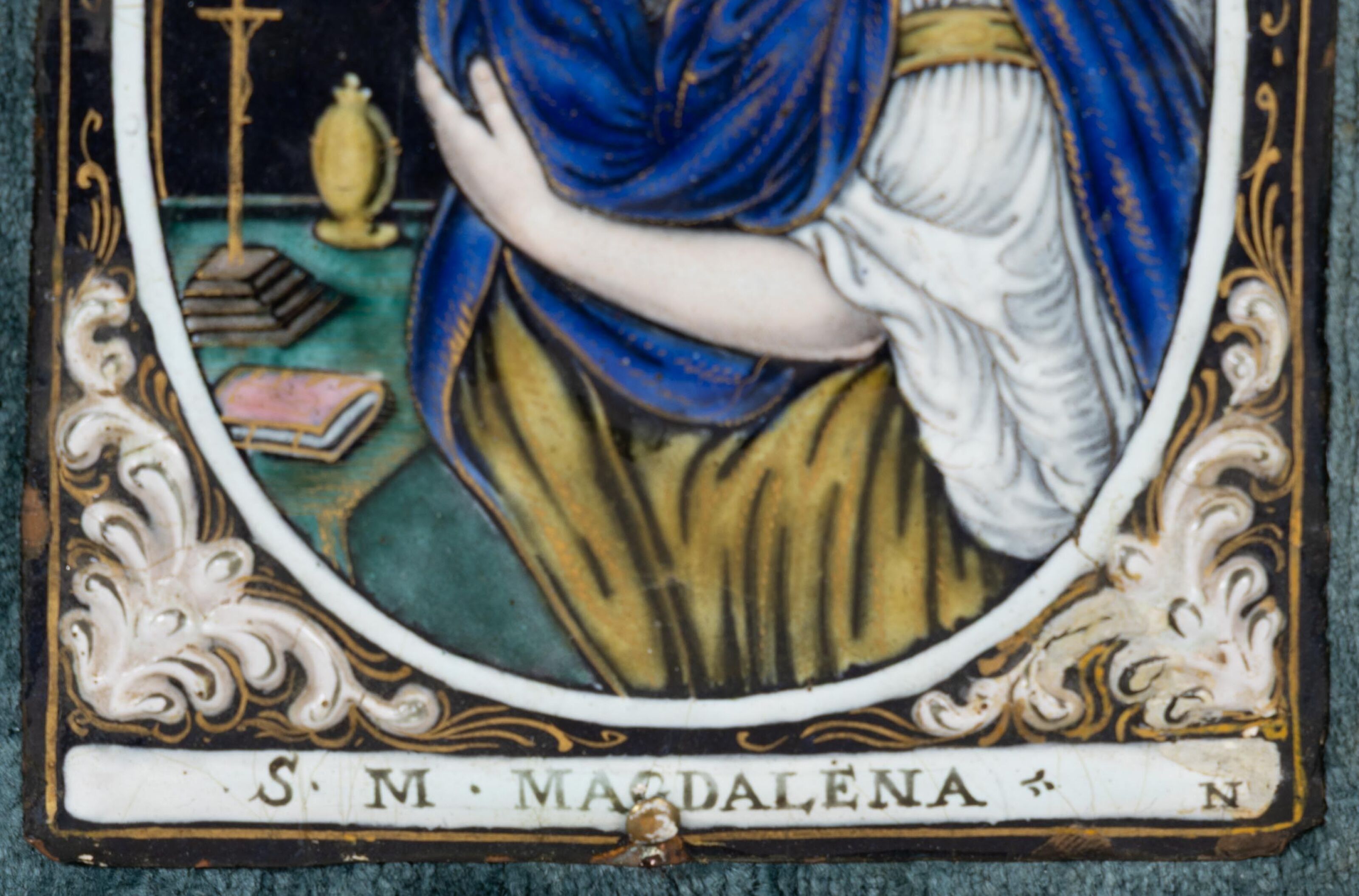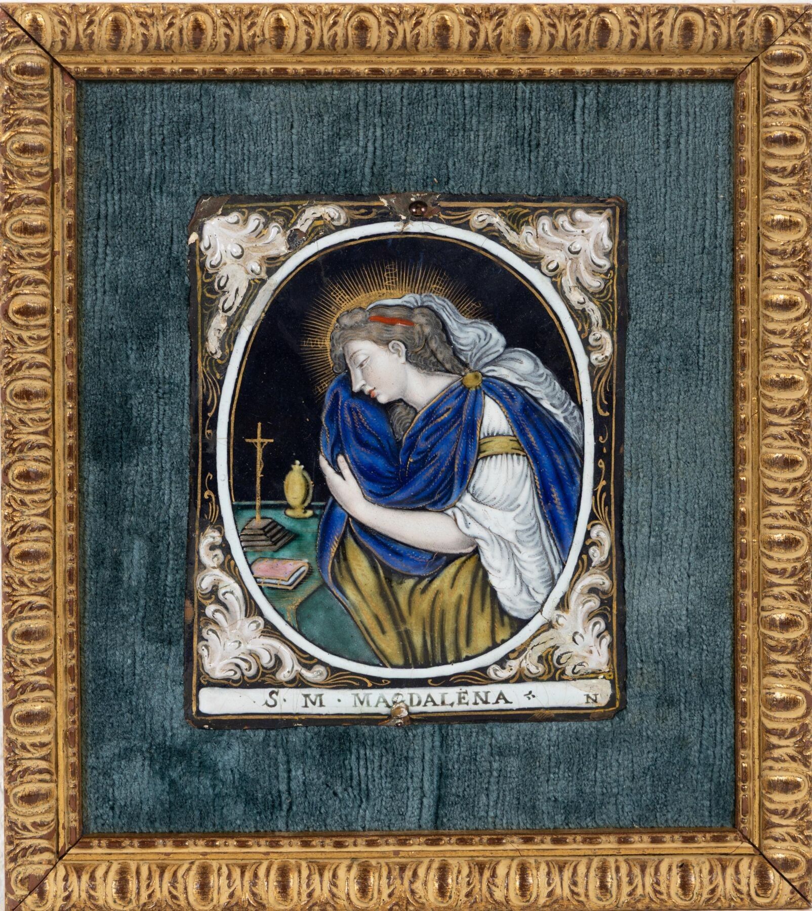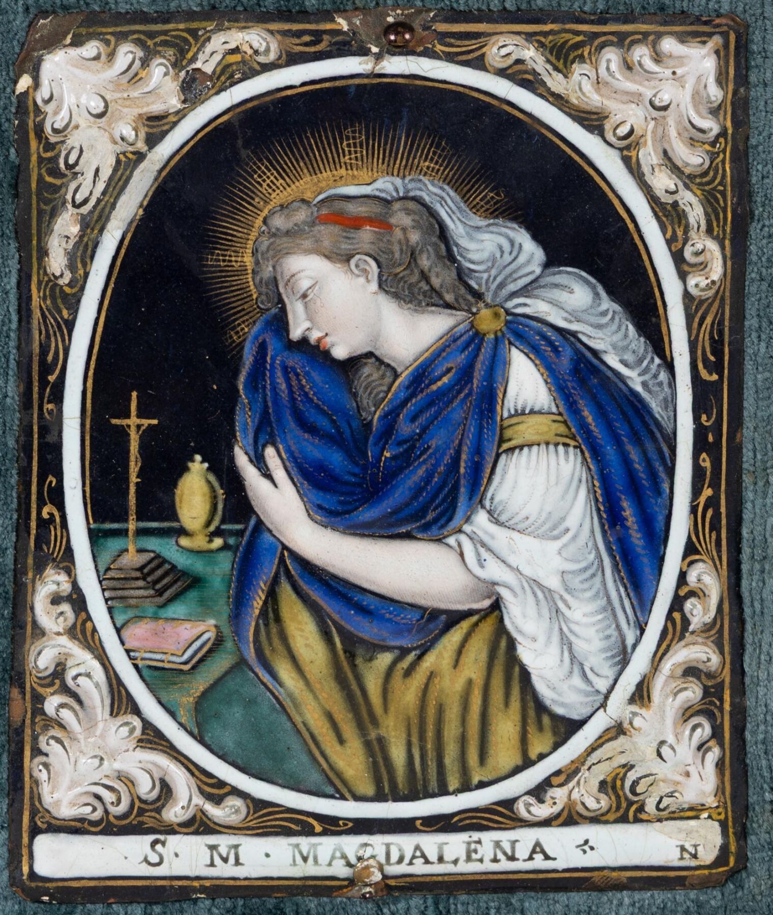 Polychrome painted enamel plate decorated with Saint Madeleine.