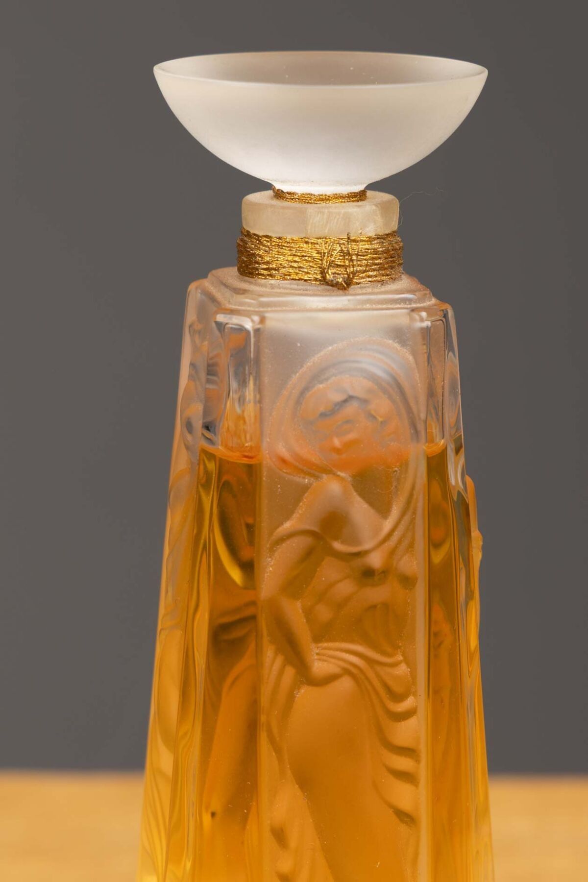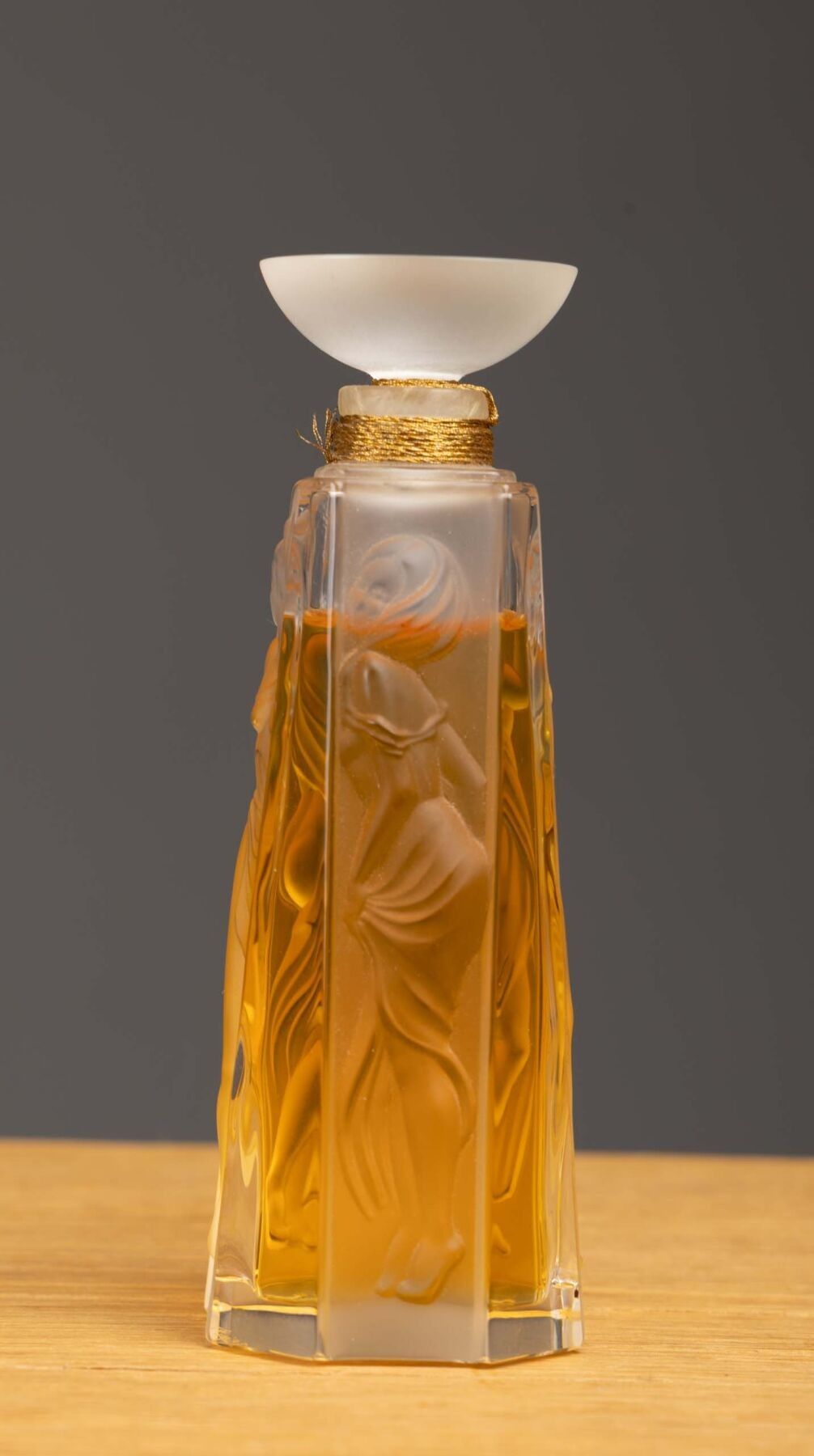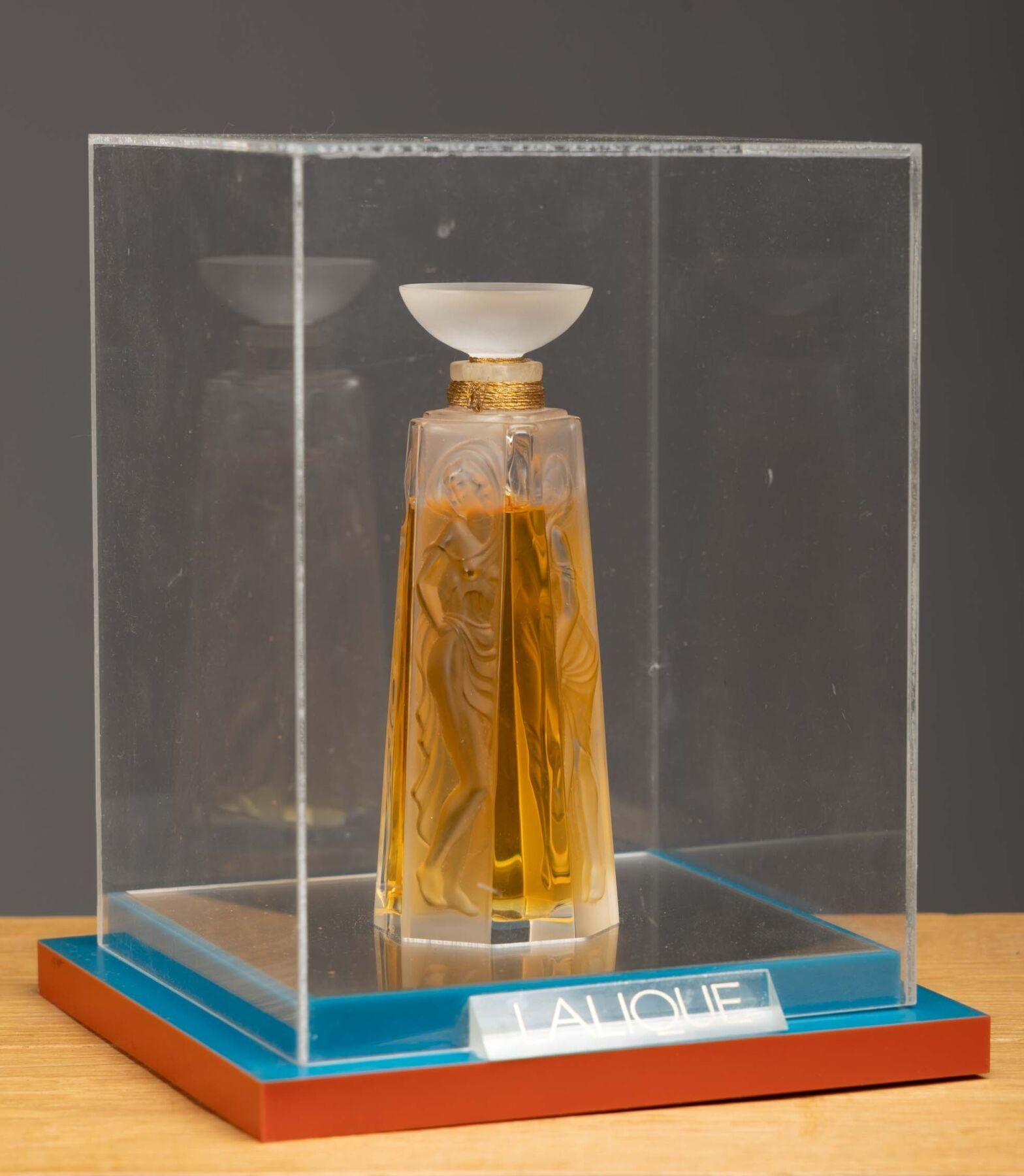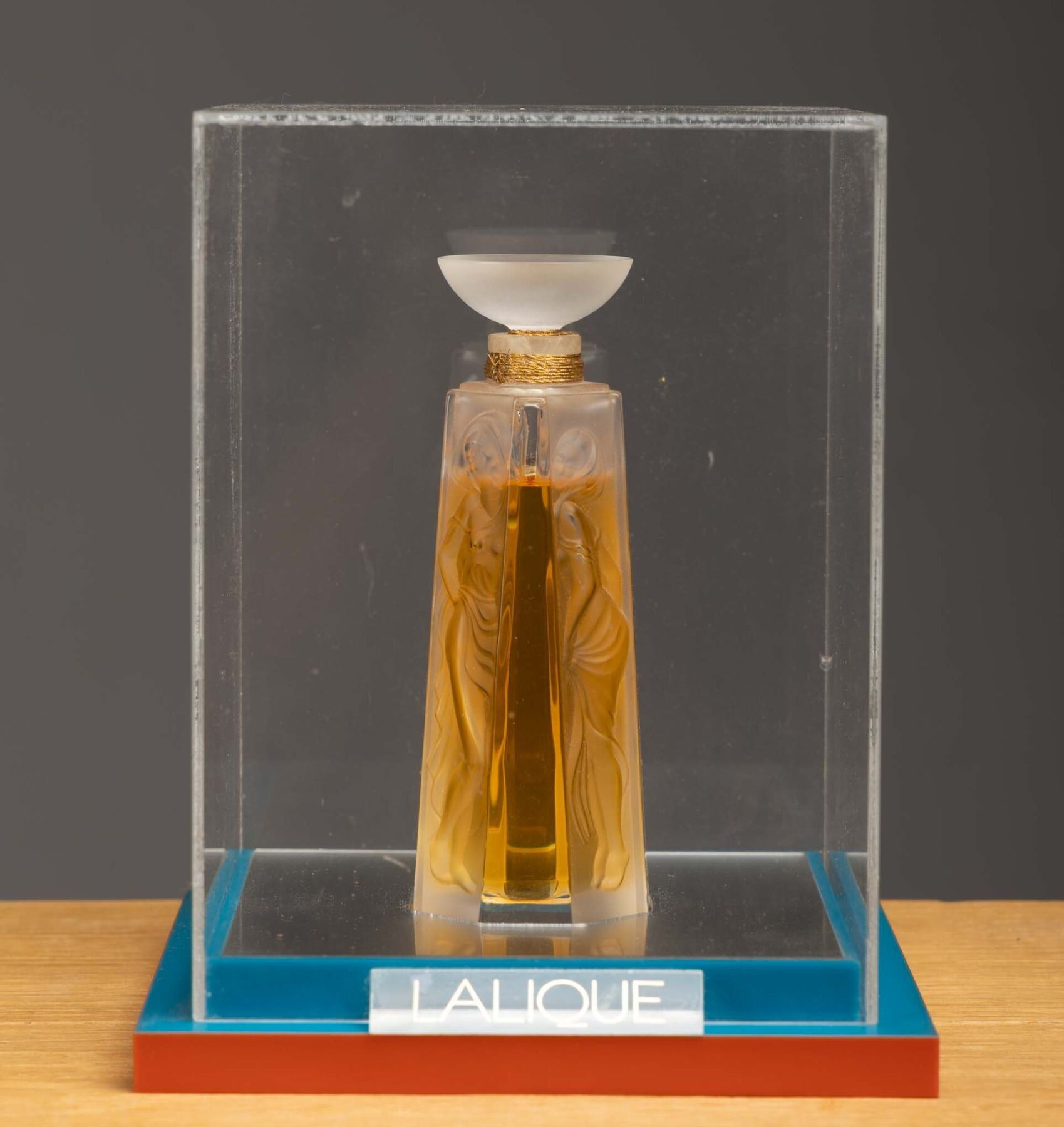Perfume bottle, presented under a plexiglass cloche with titling.