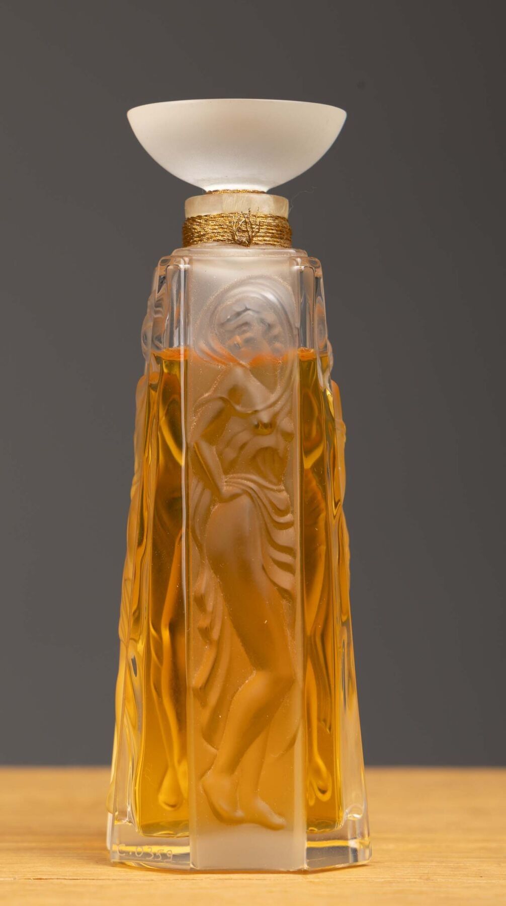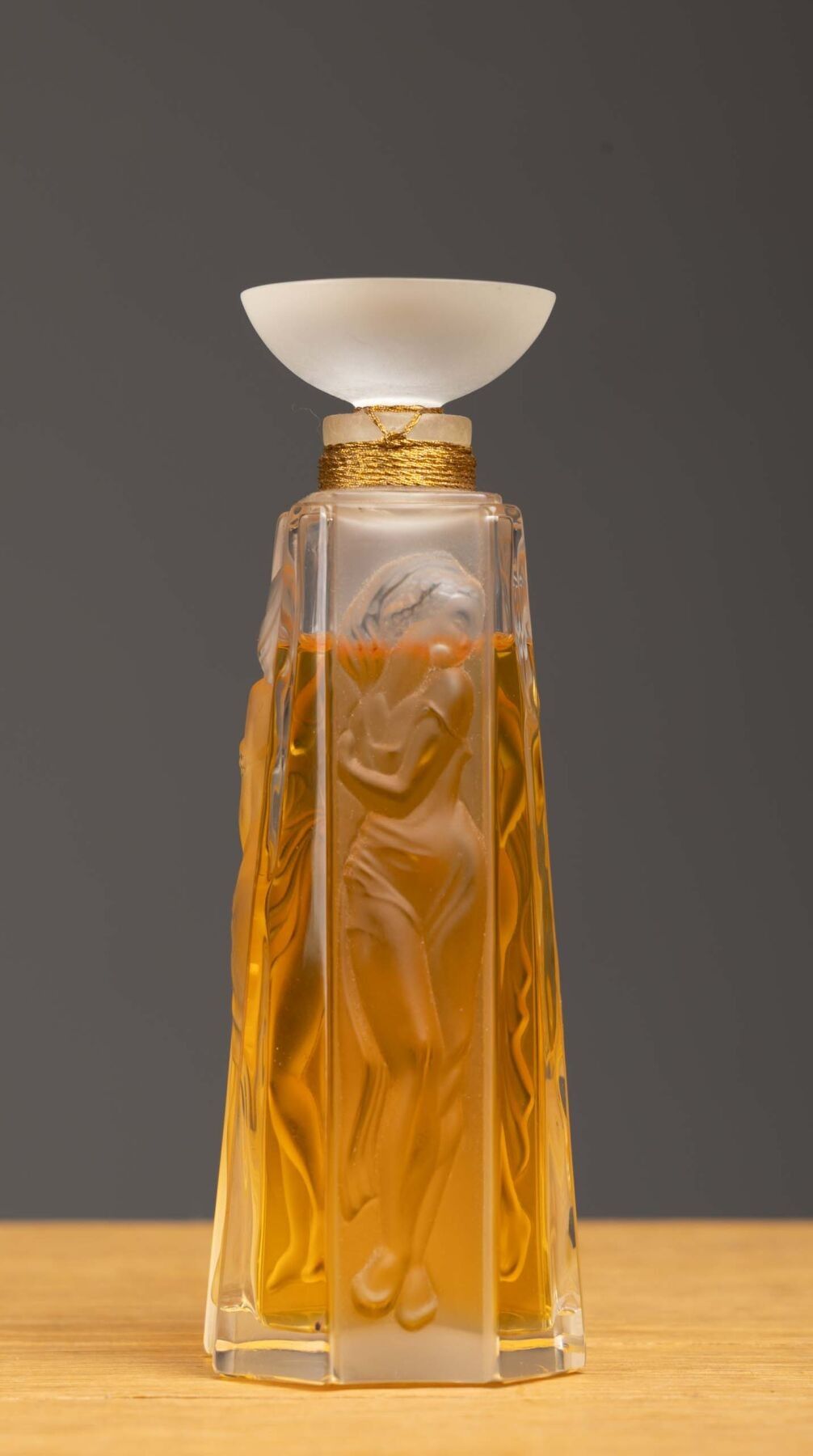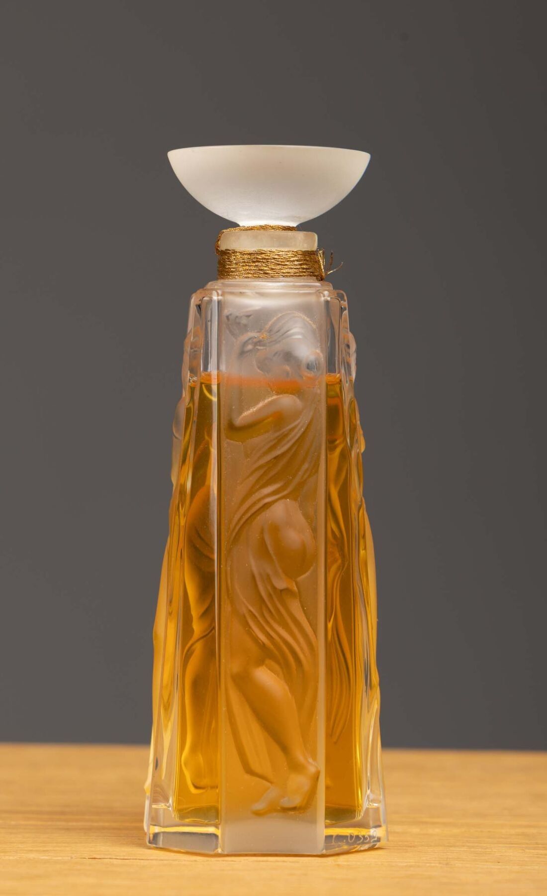 Perfume bottle, presented under a plexiglass cloche with titling.