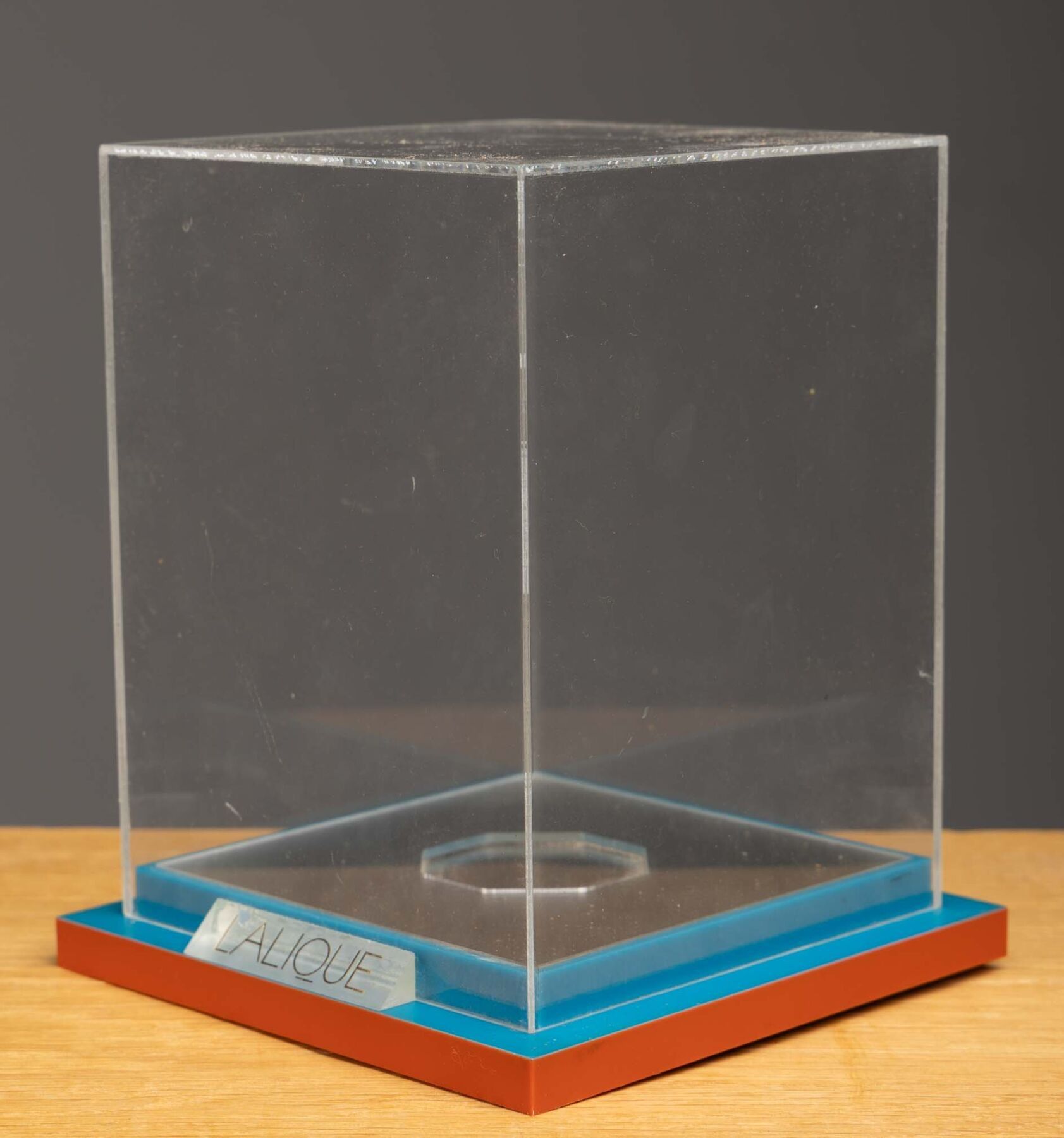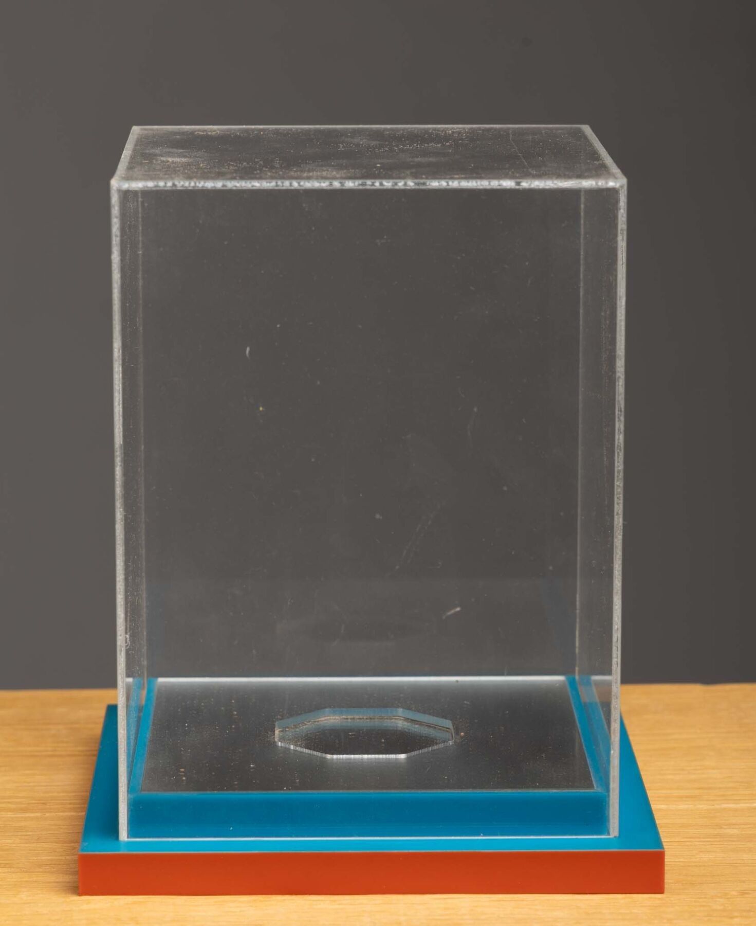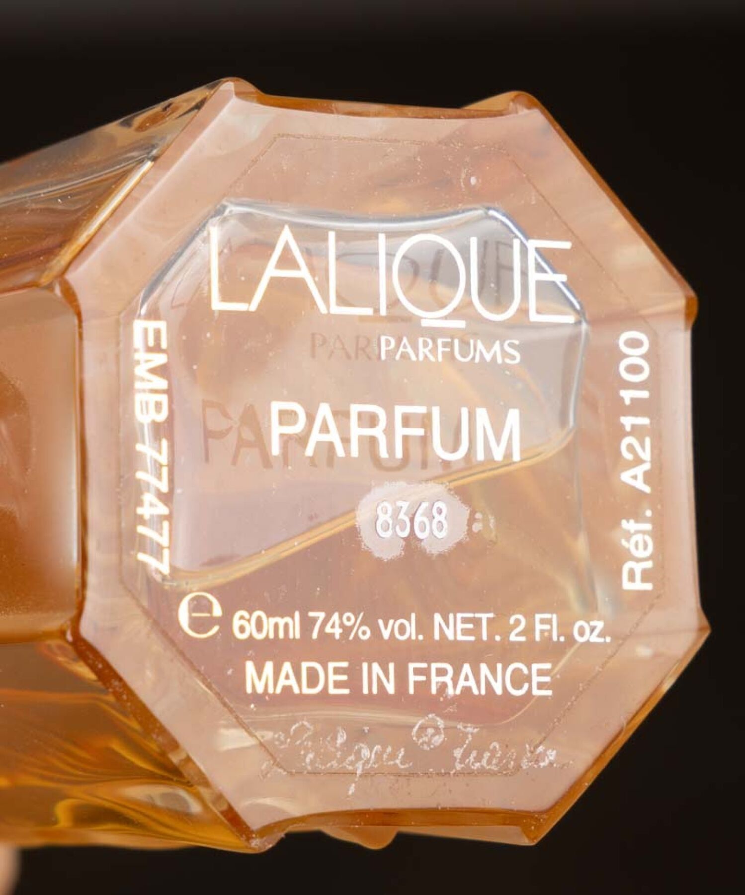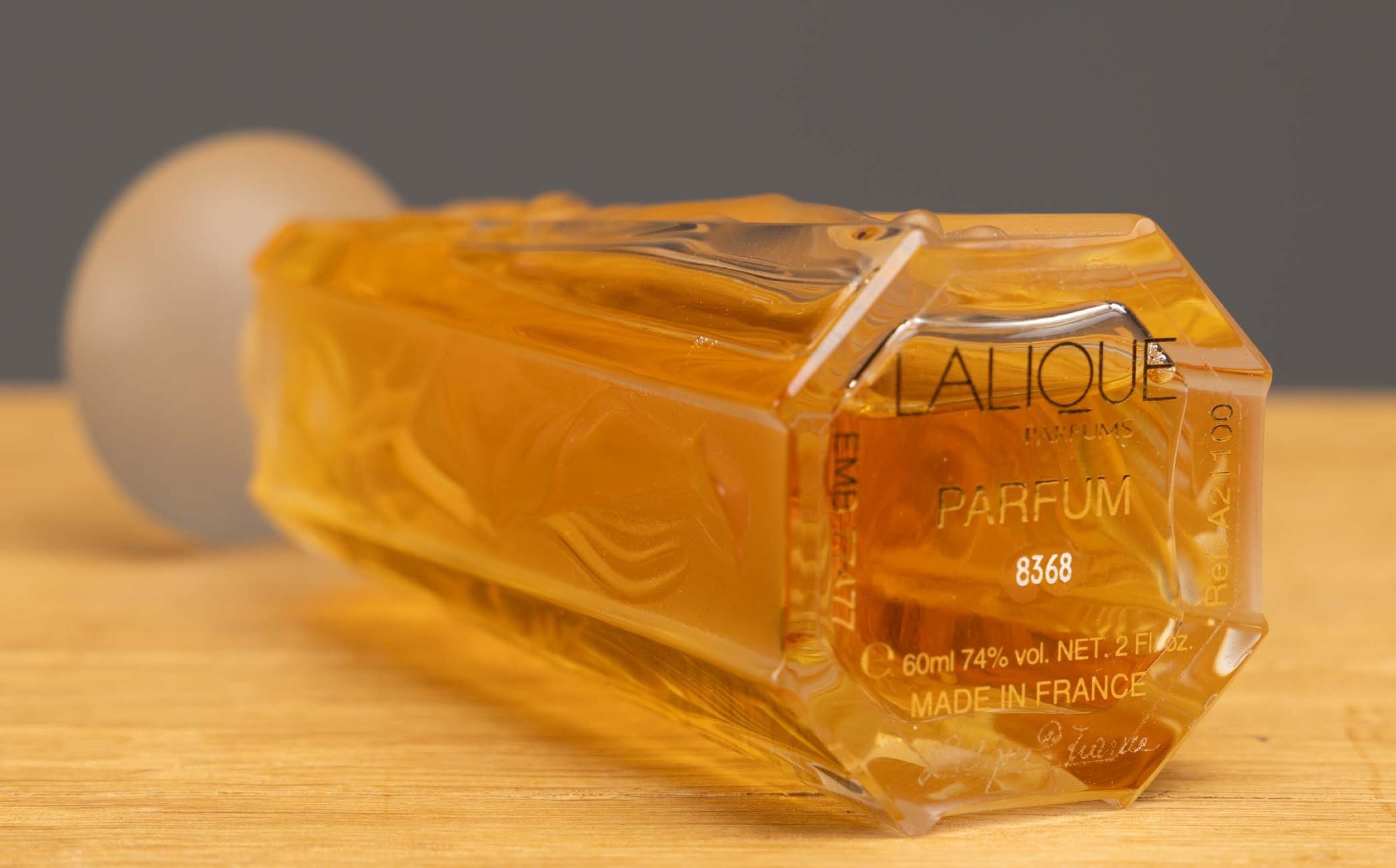 Perfume bottle, presented under a plexiglass cloche with titling.