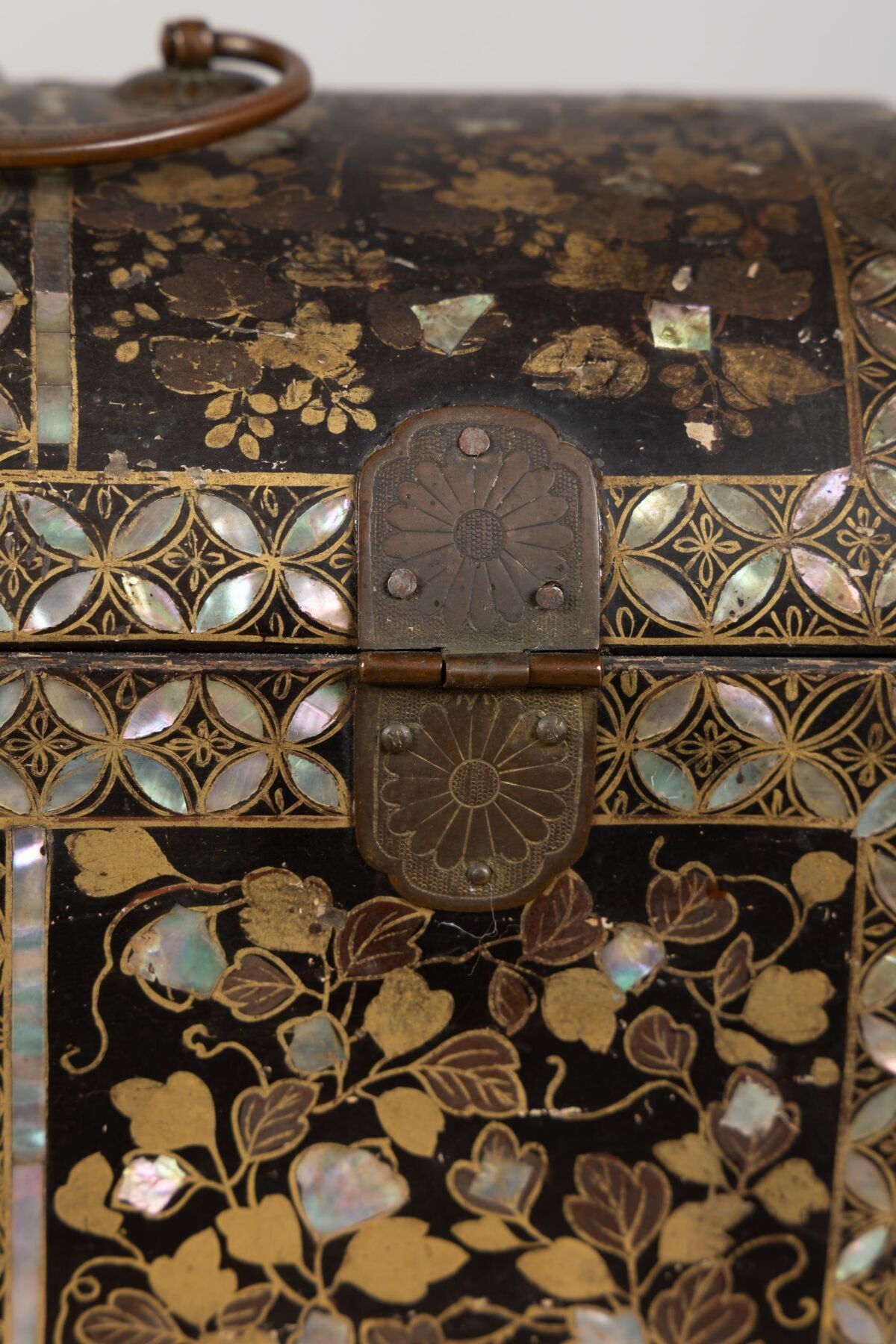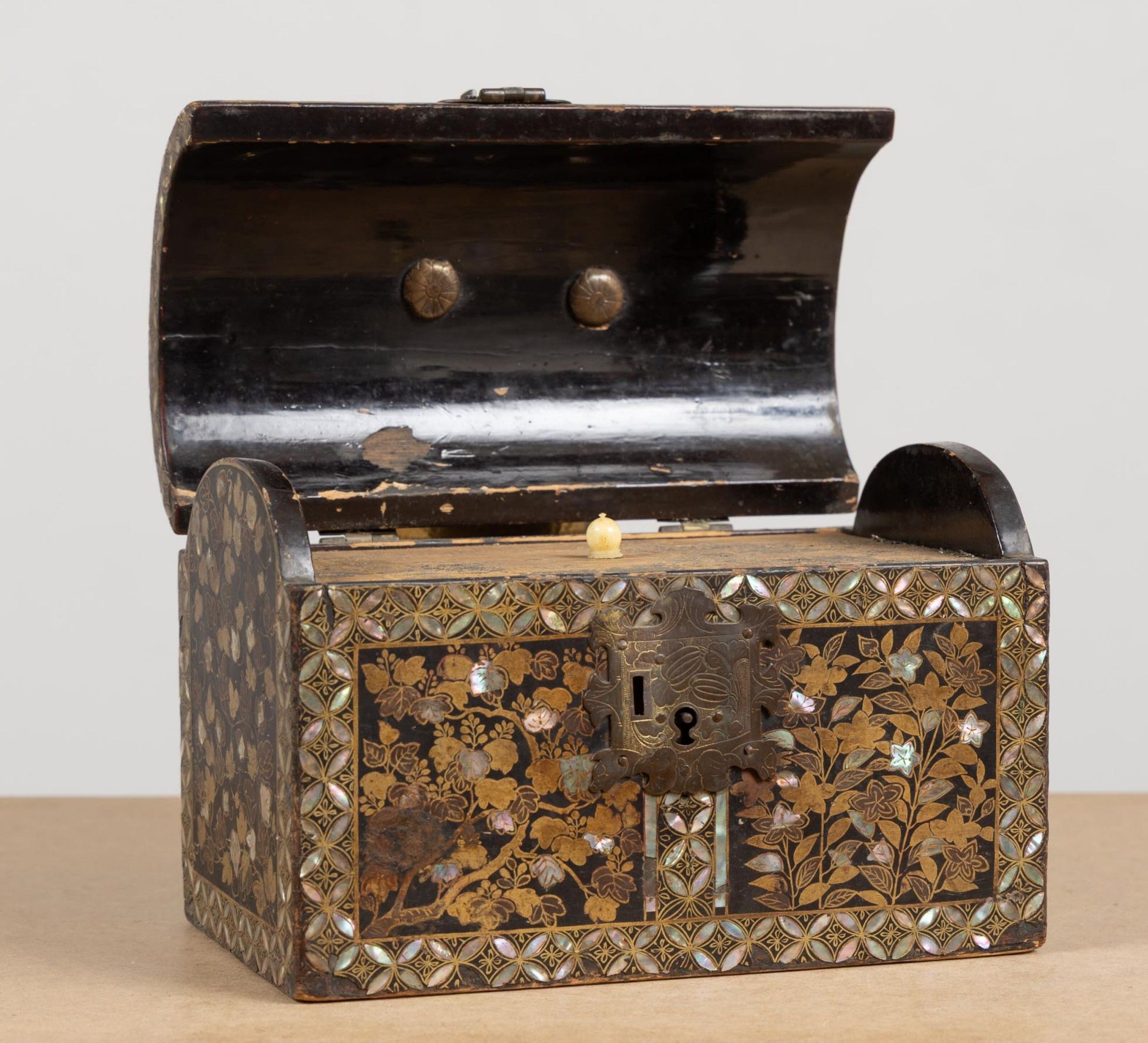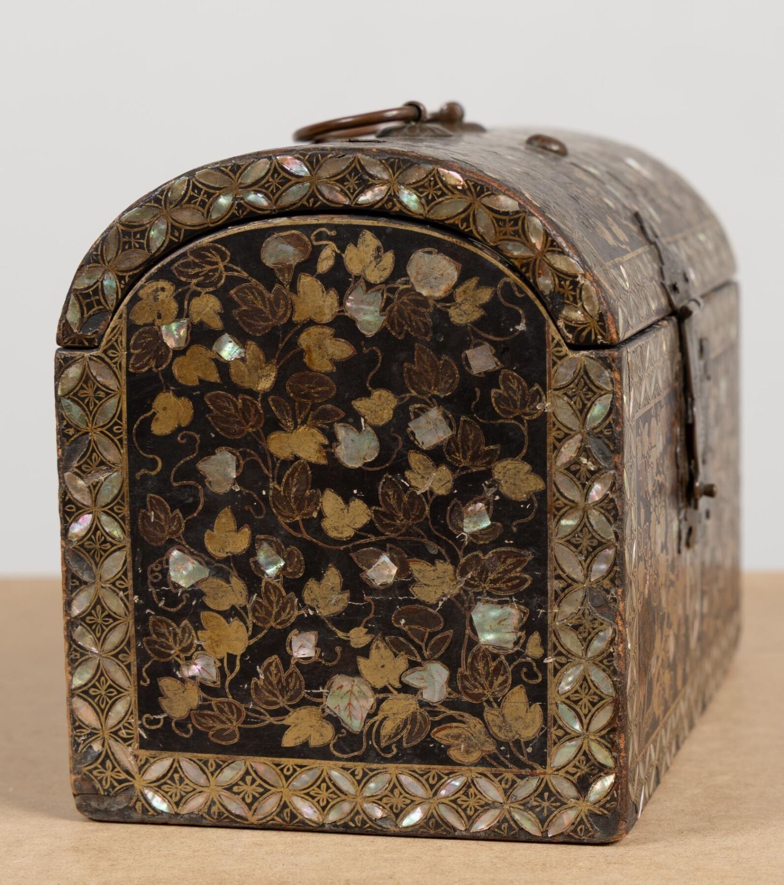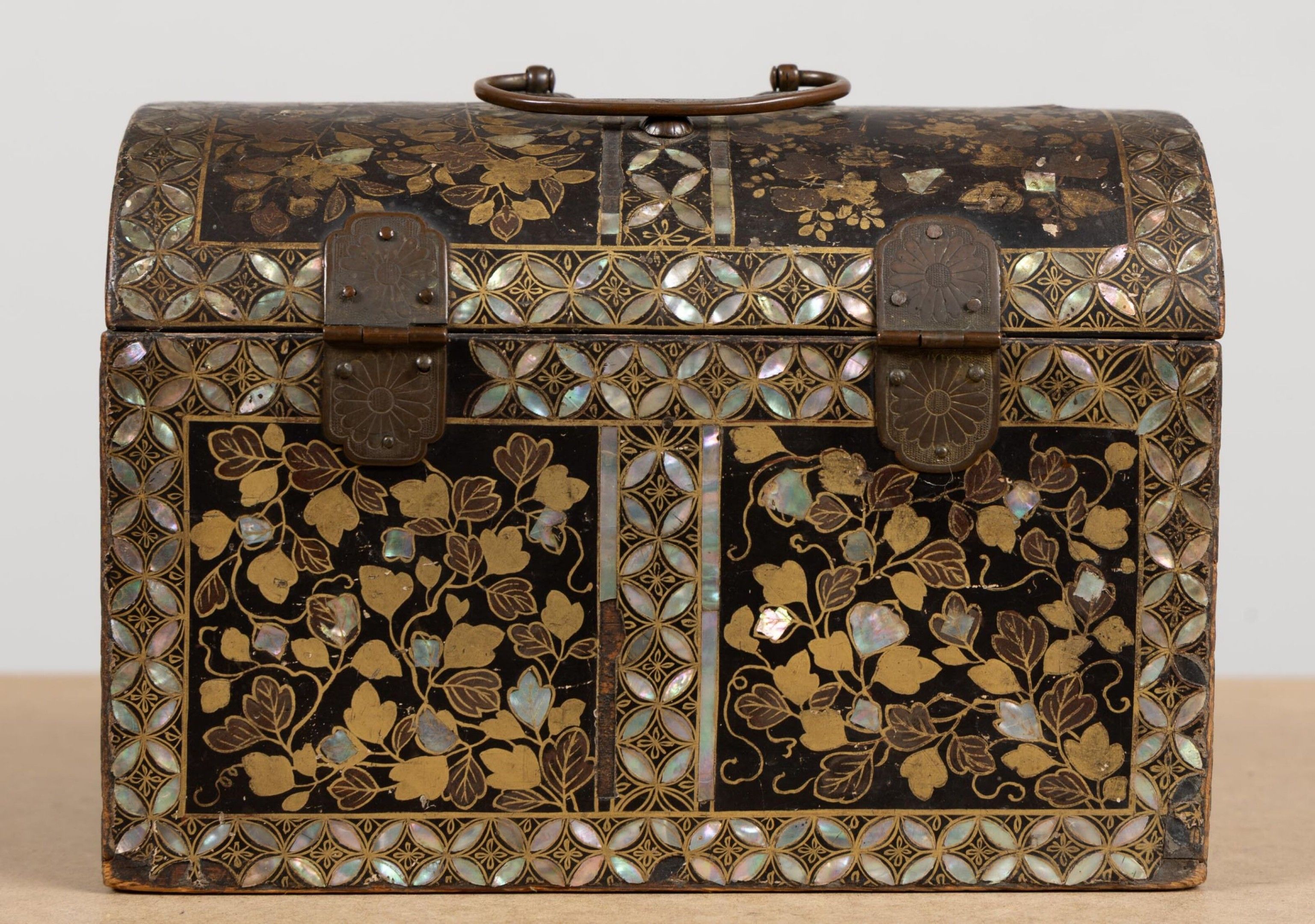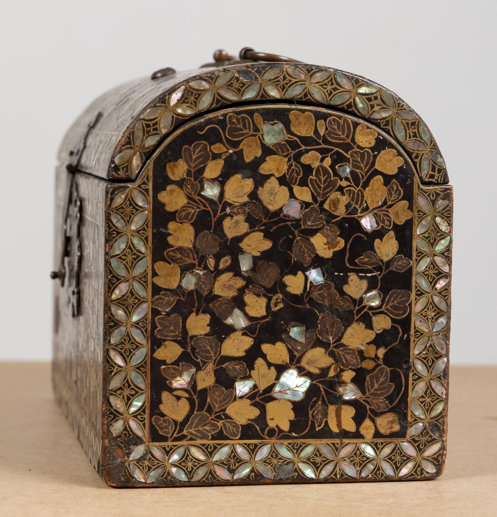 Small Namban chest in lacquered wood and mother-of-pearl inlays, the domed lid entirely decorated with flowering branches in cartouches, the borders decorated with rhombus friezes.