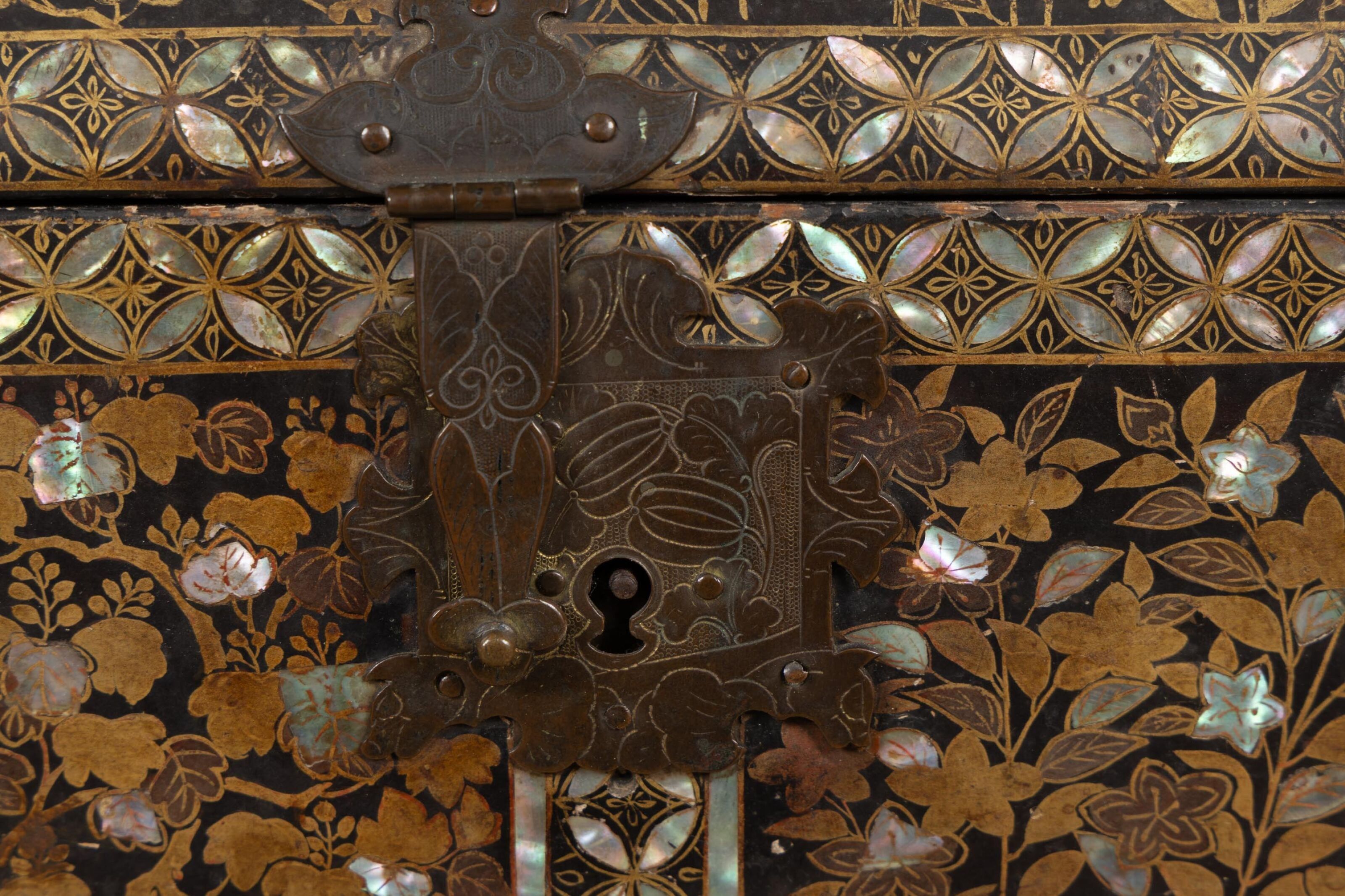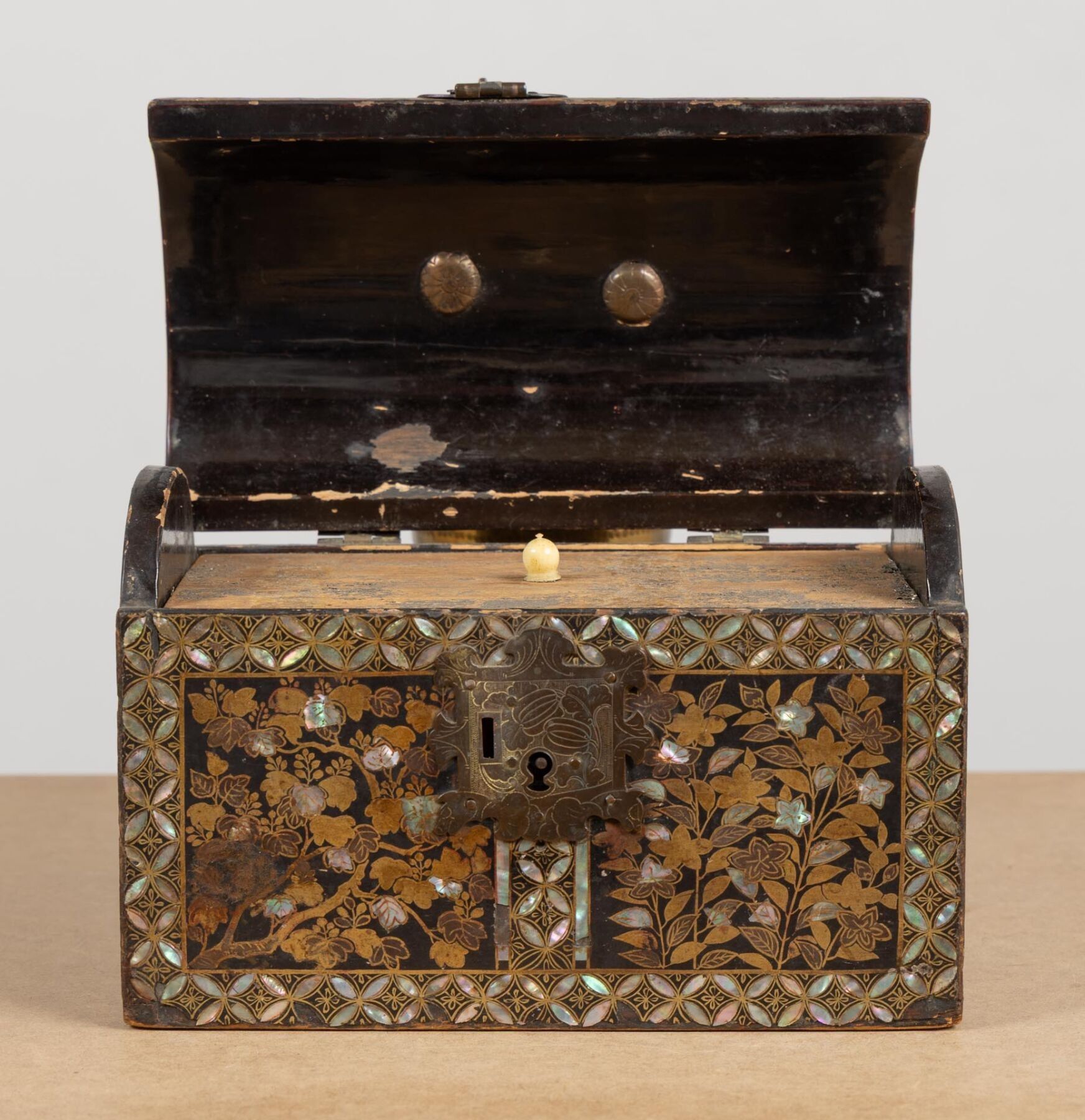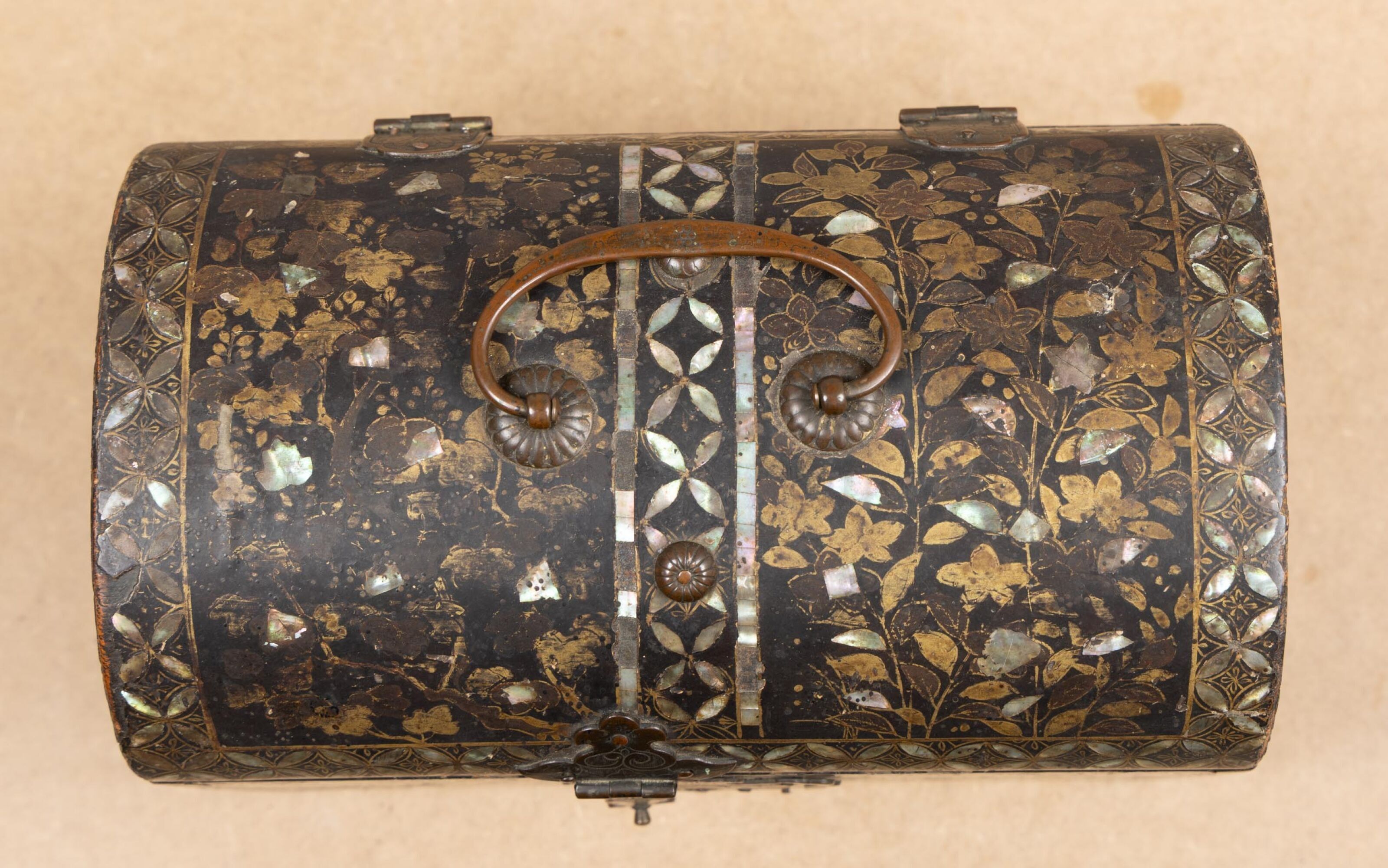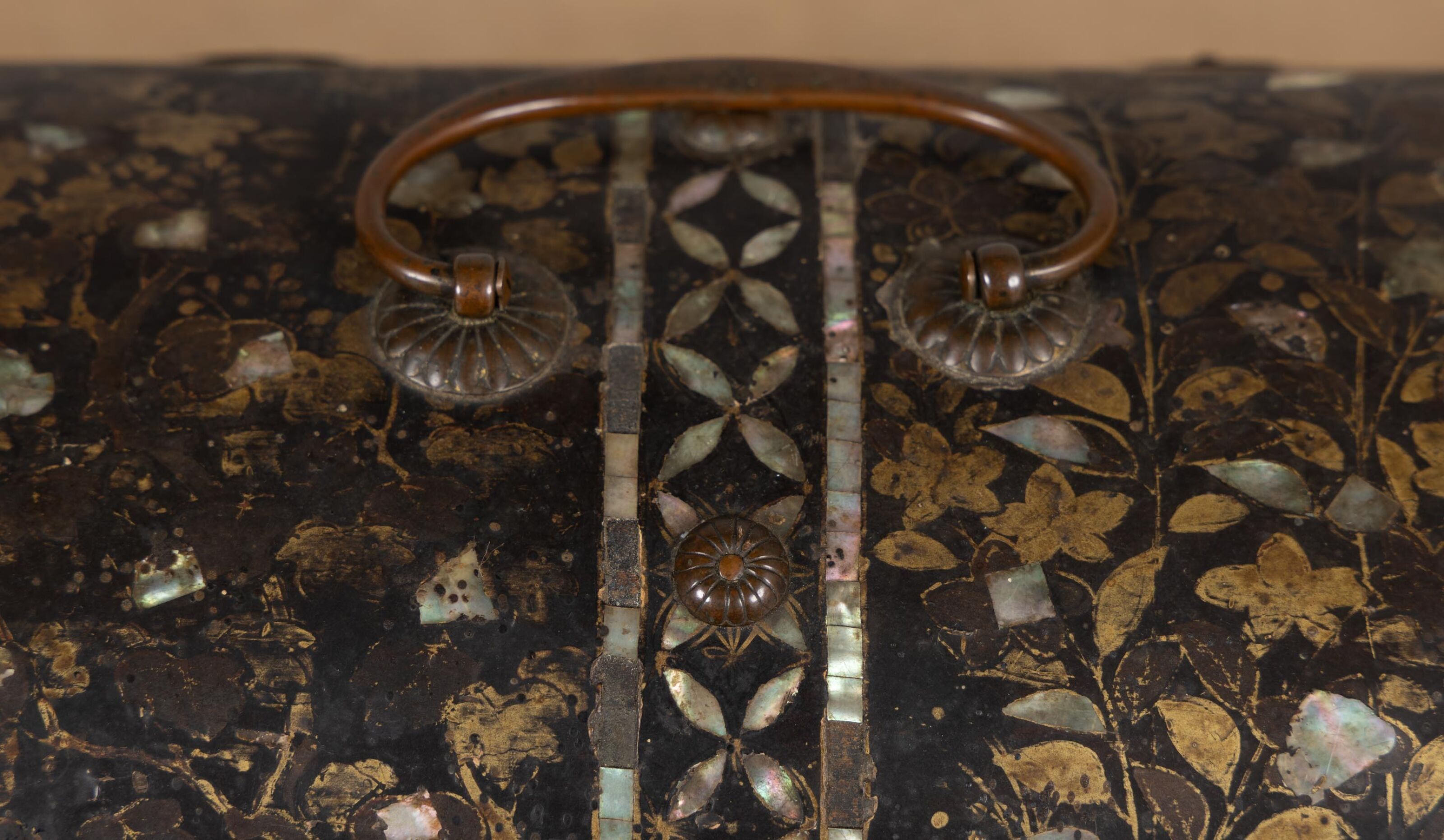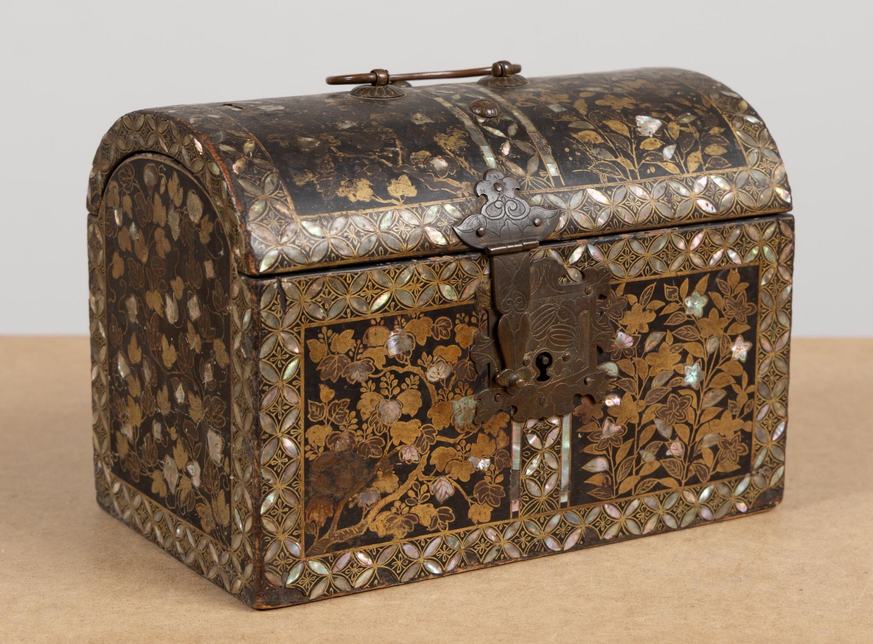 Small Namban chest in lacquered wood and mother-of-pearl inlays, the domed lid entirely decorated with flowering branches in cartouches, the borders decorated with rhombus friezes.