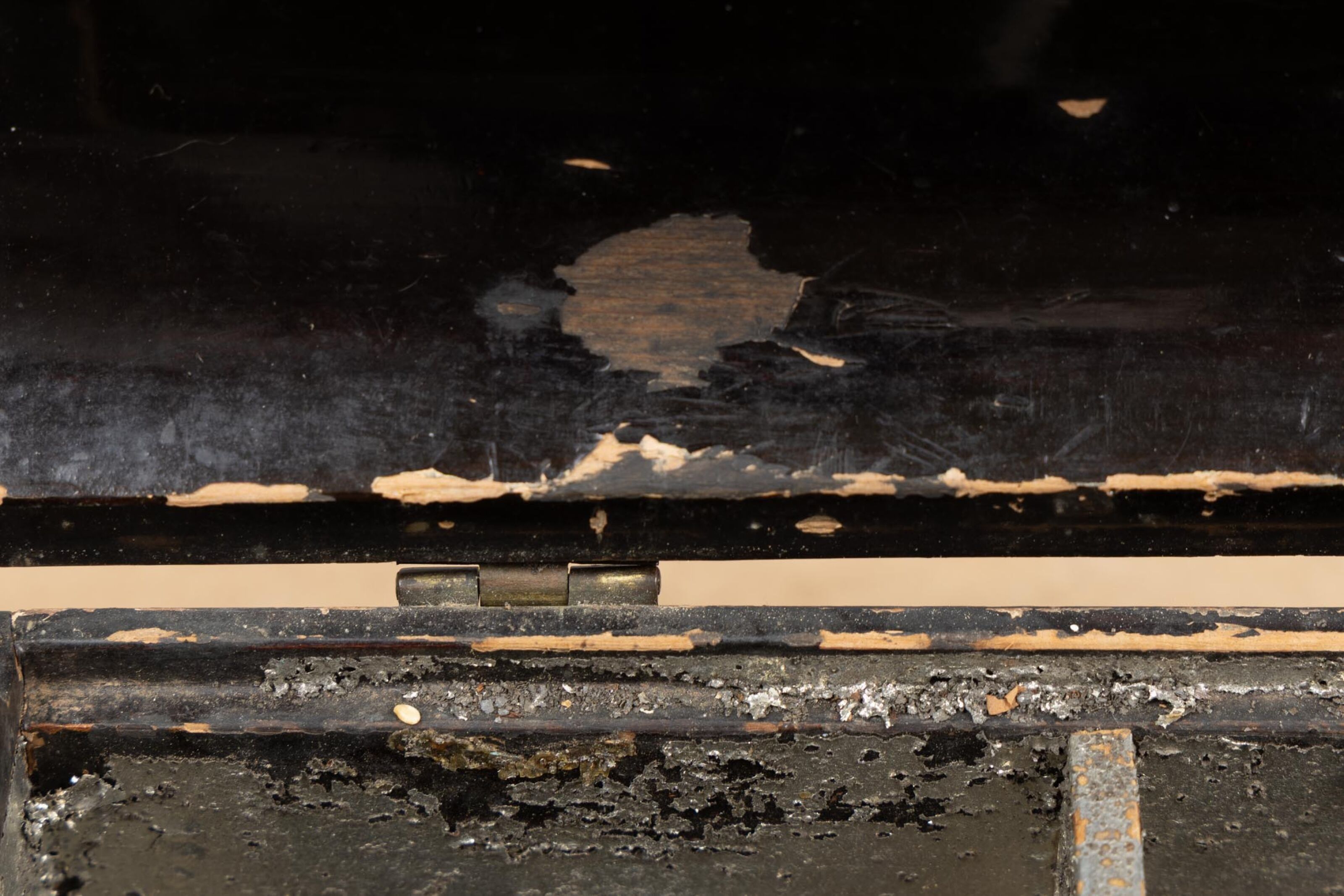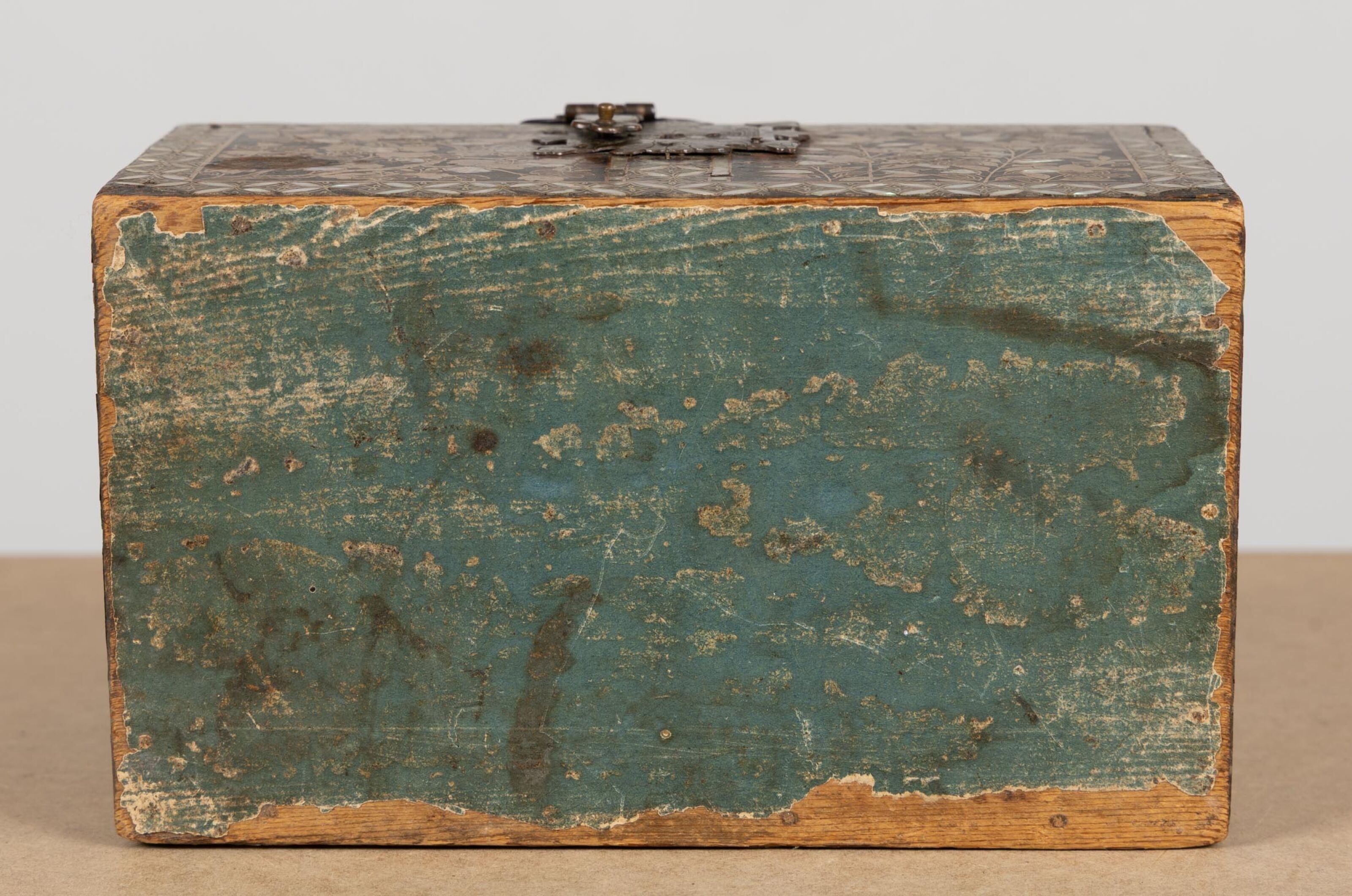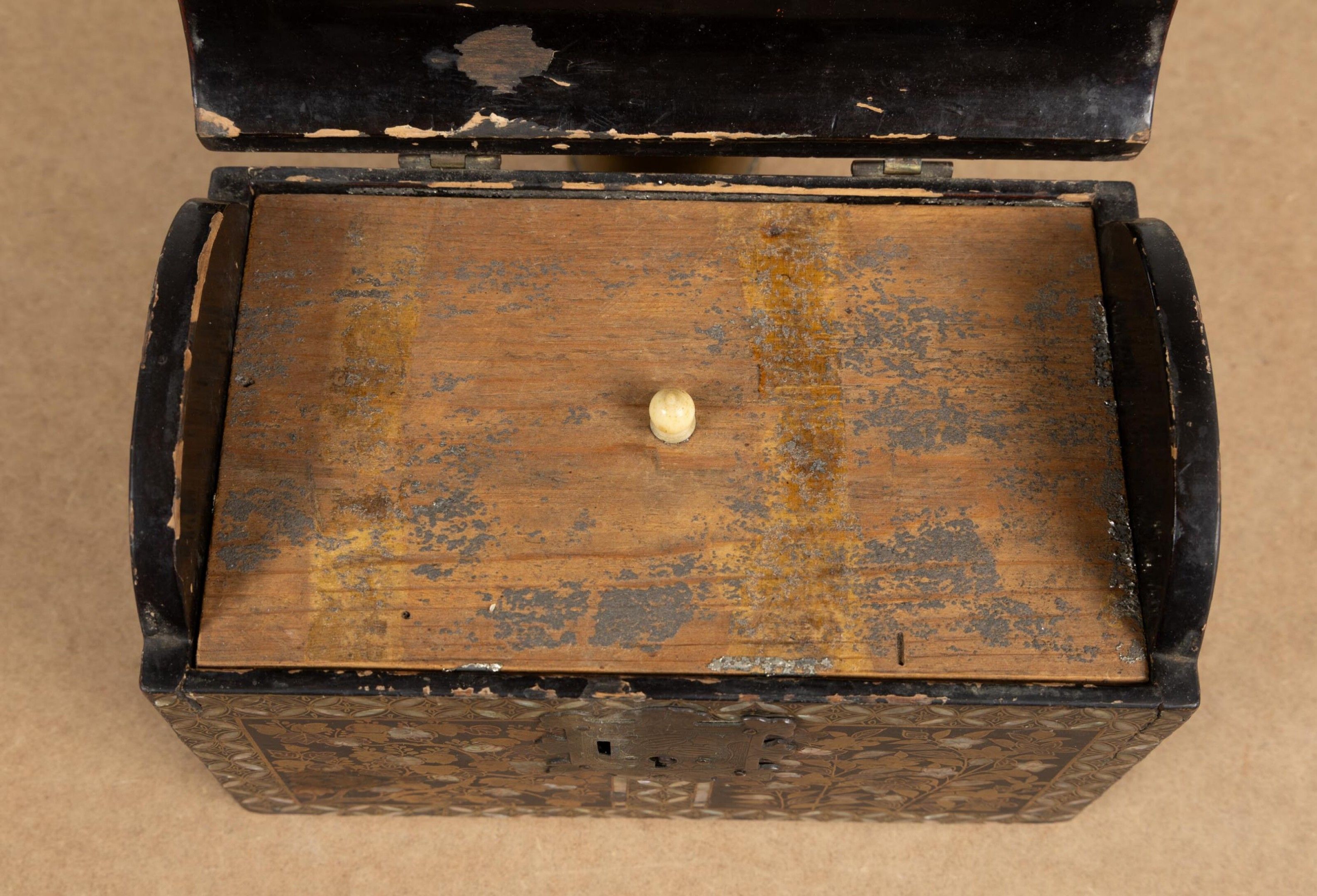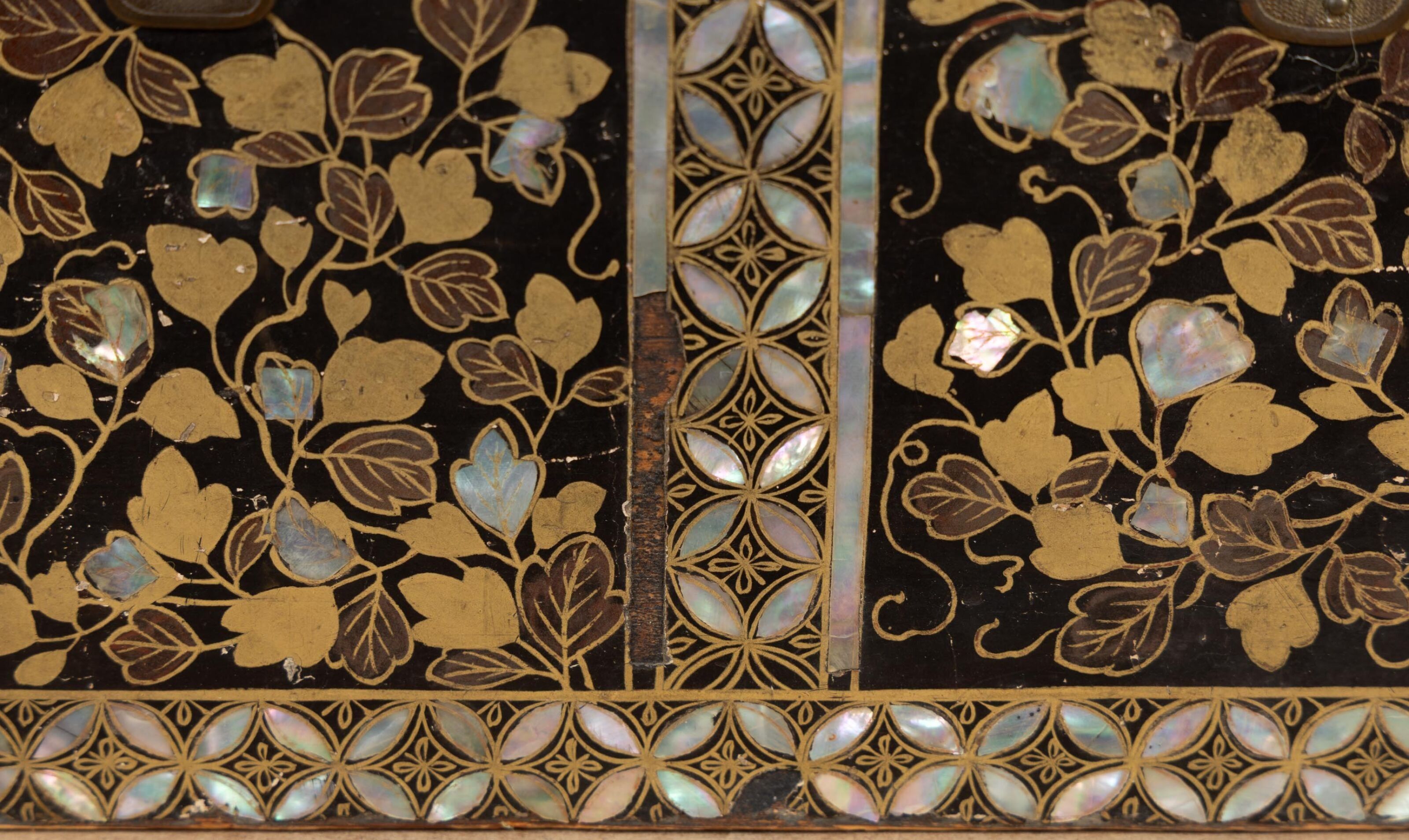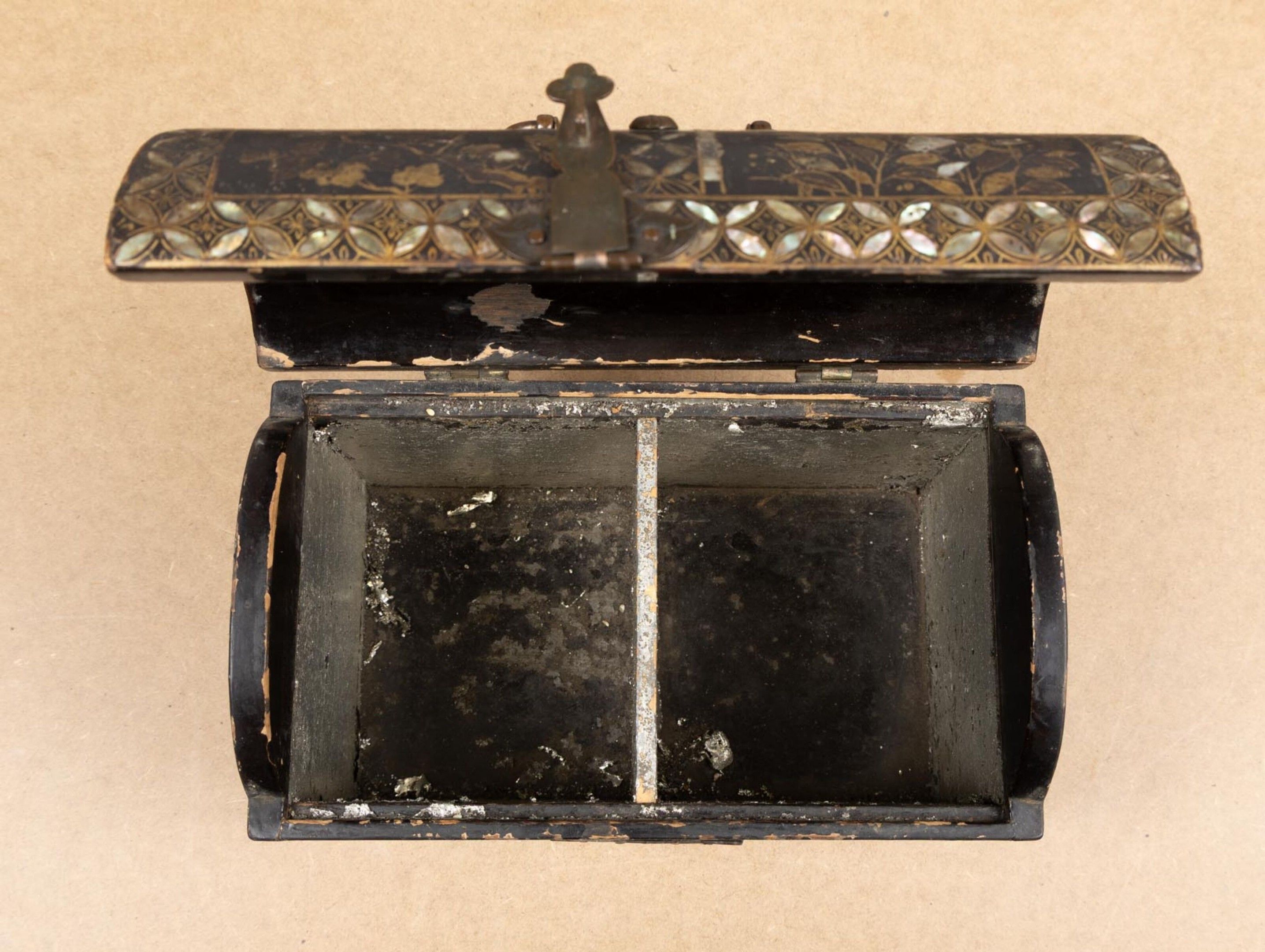Small Namban chest in lacquered wood and mother-of-pearl inlays, the domed lid entirely decorated with flowering branches in cartouches, the borders decorated with rhombus friezes.