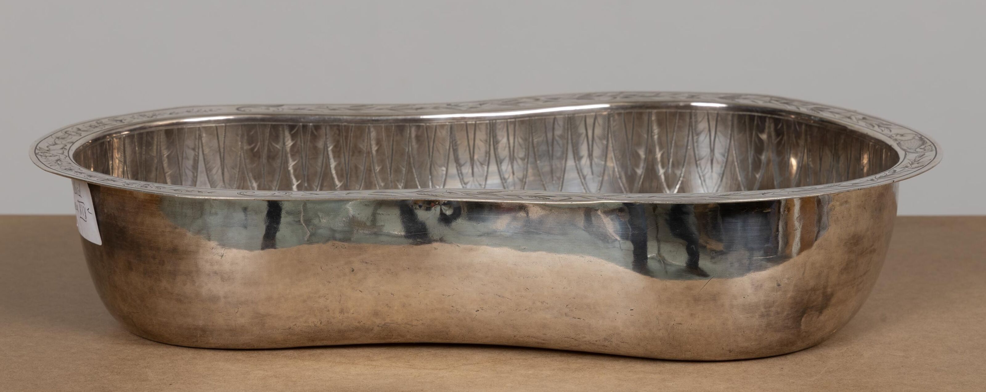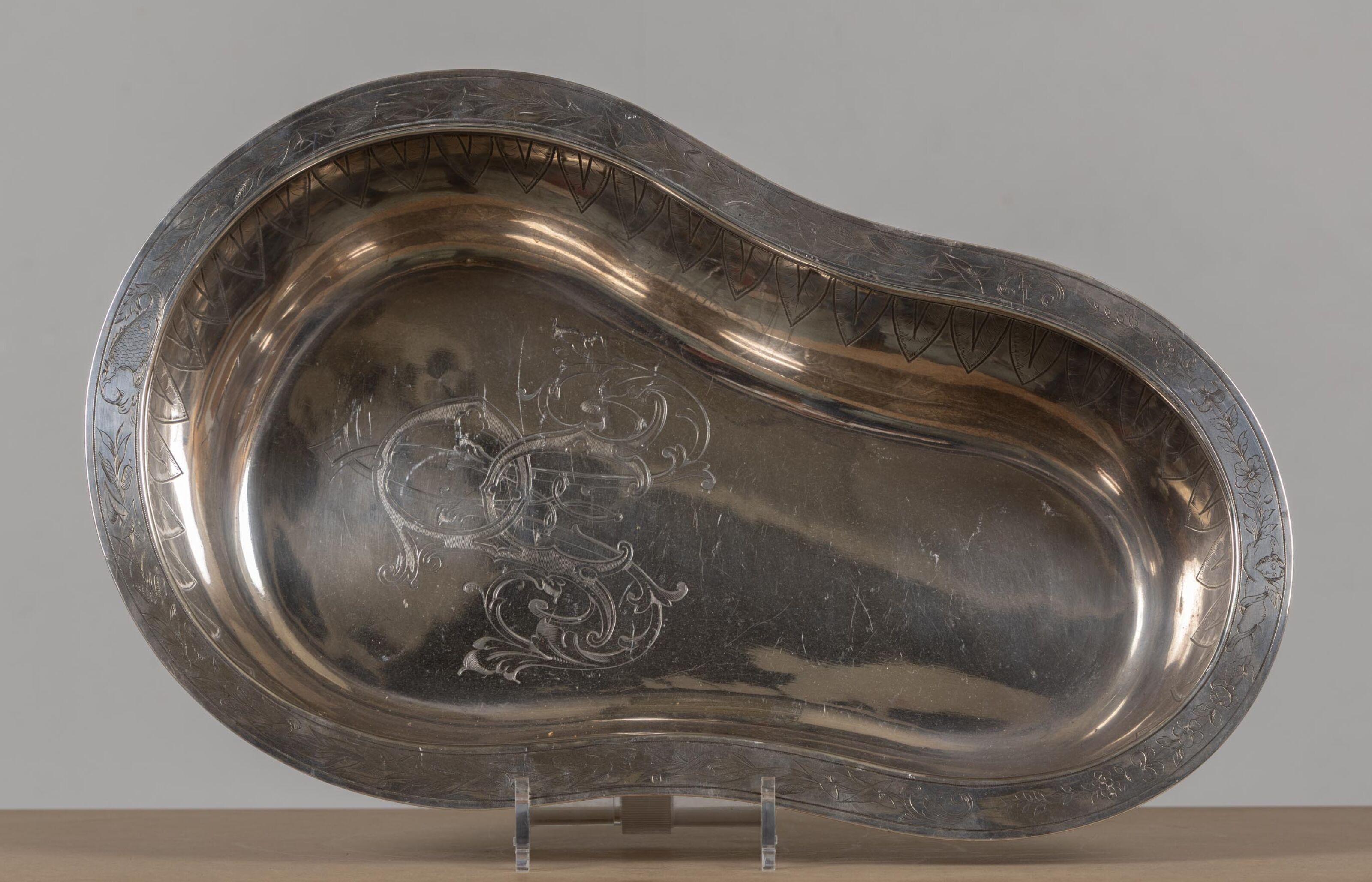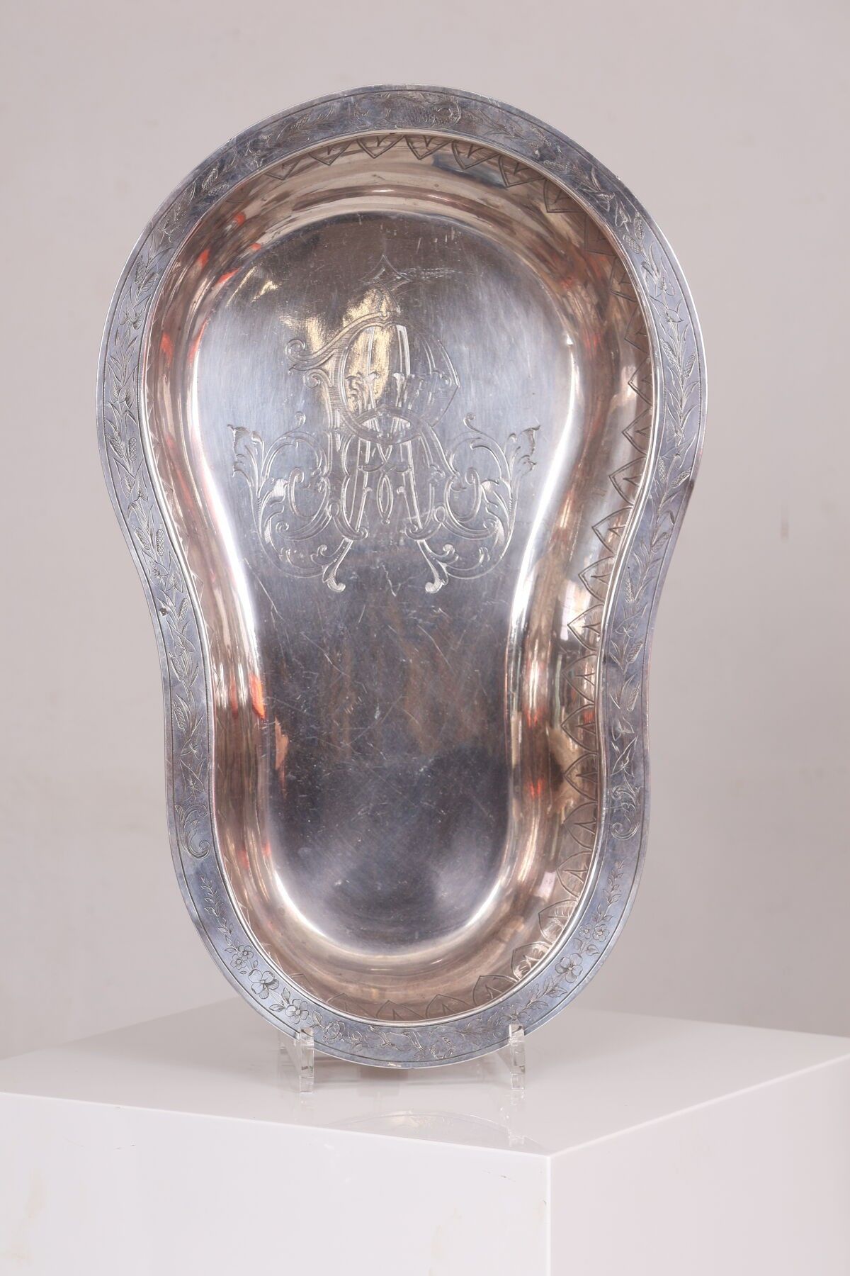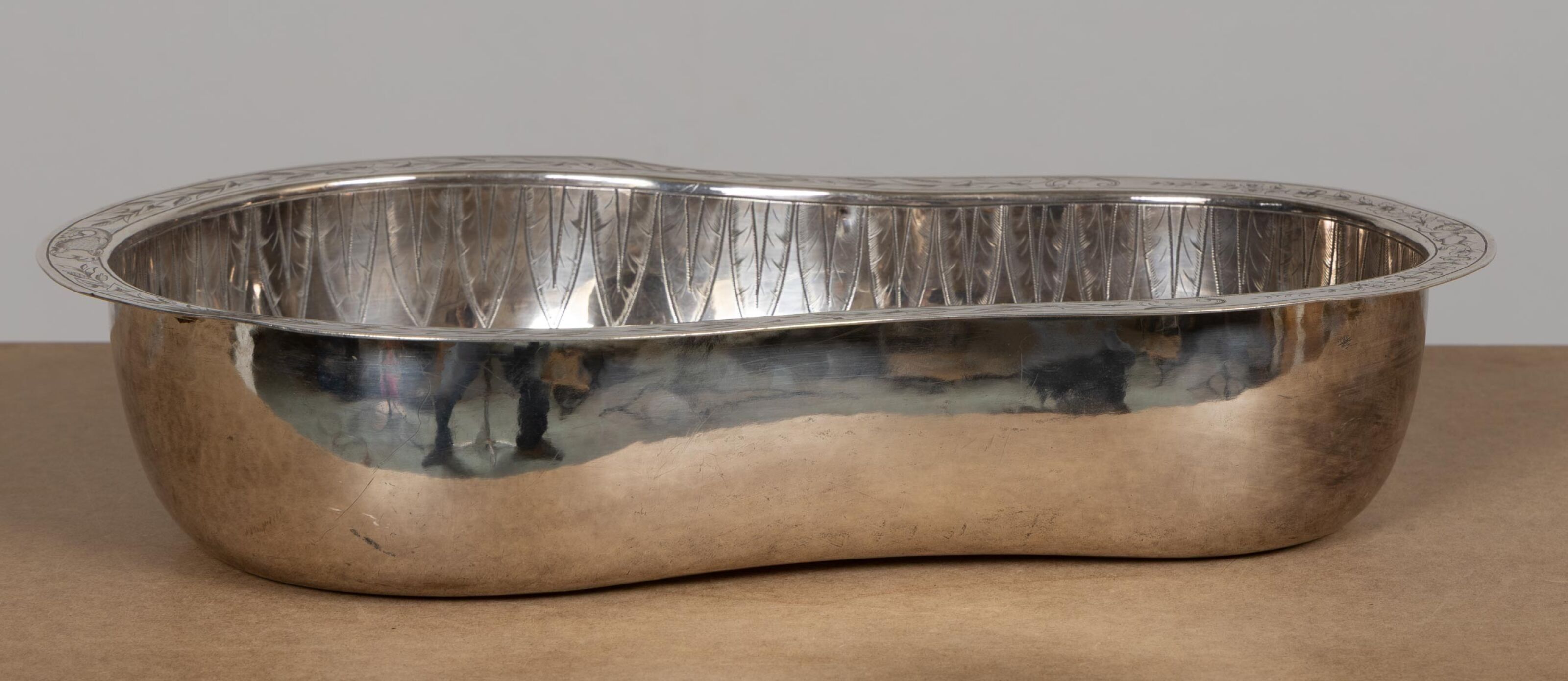 A silver-plated washbasin engraved with "A.R." and decorated with wheat leaves, palmettes and putti.