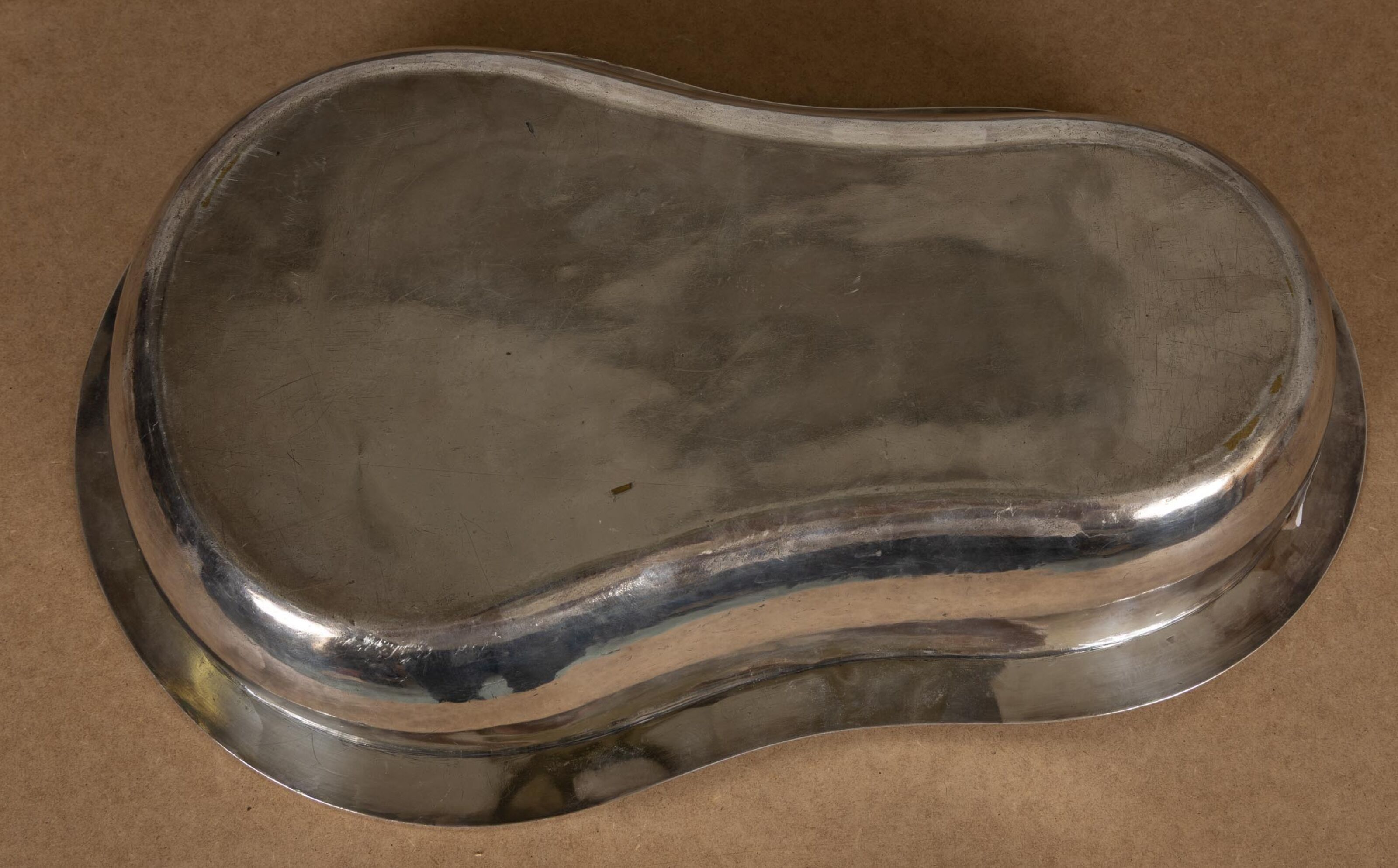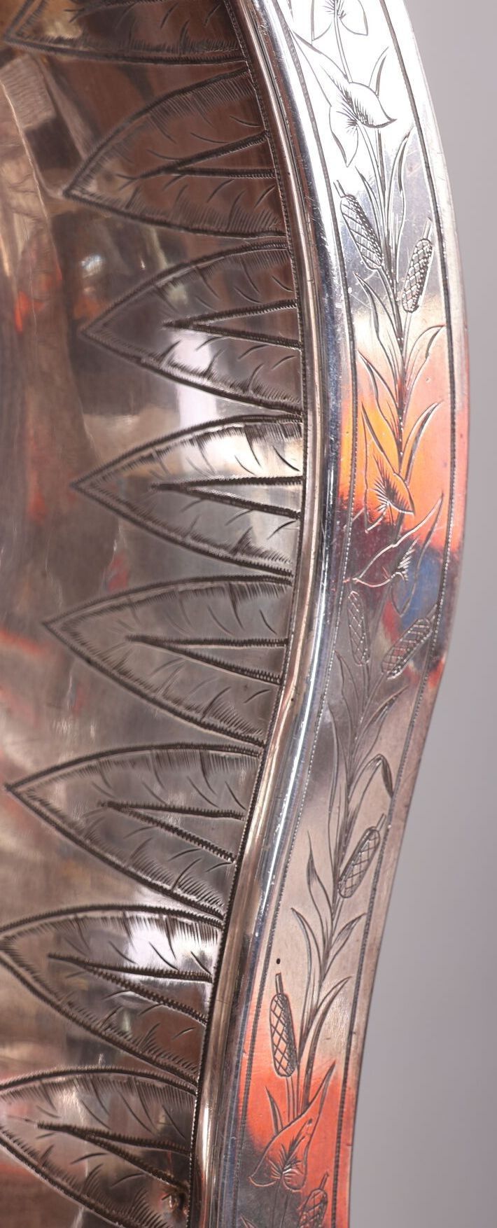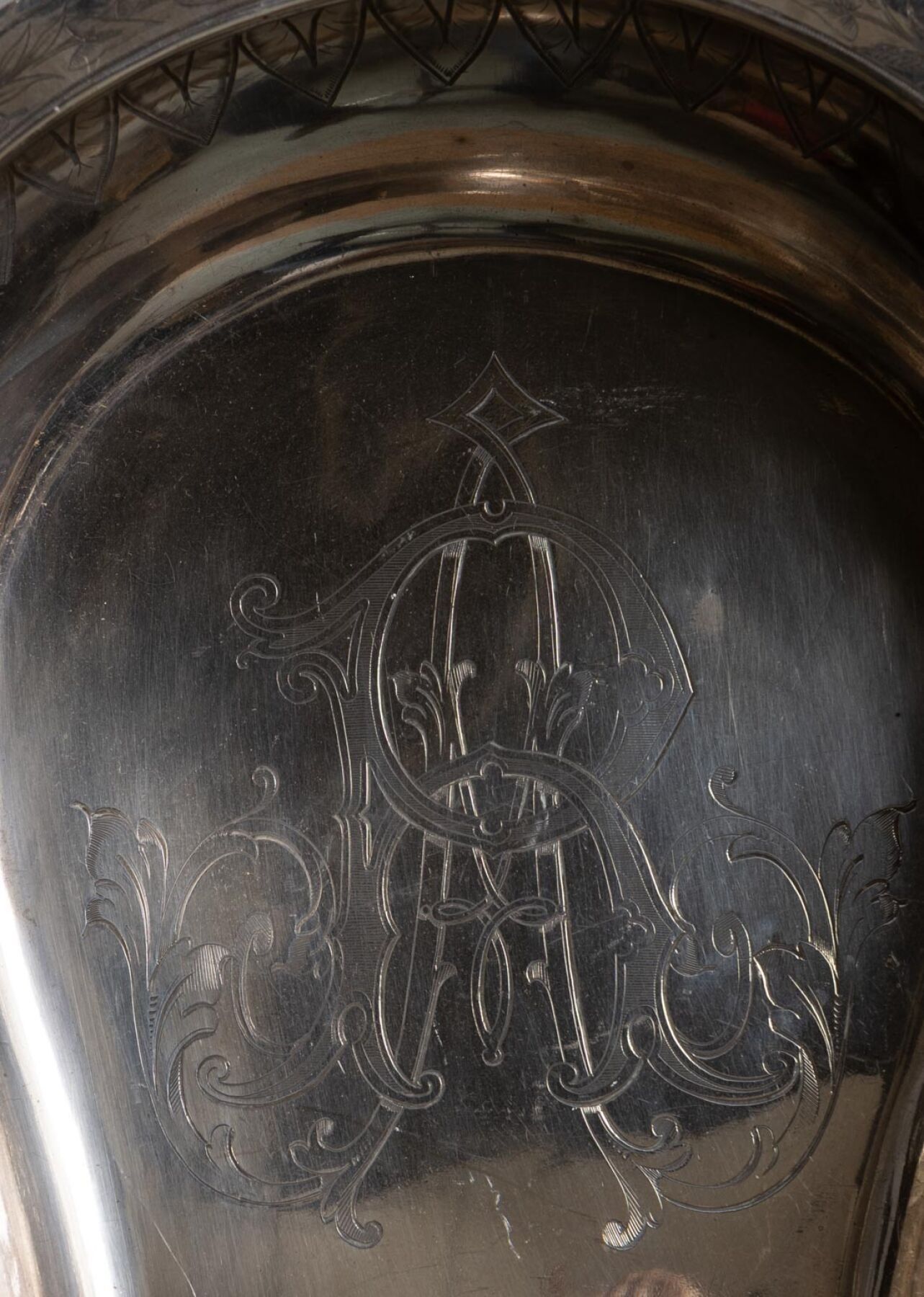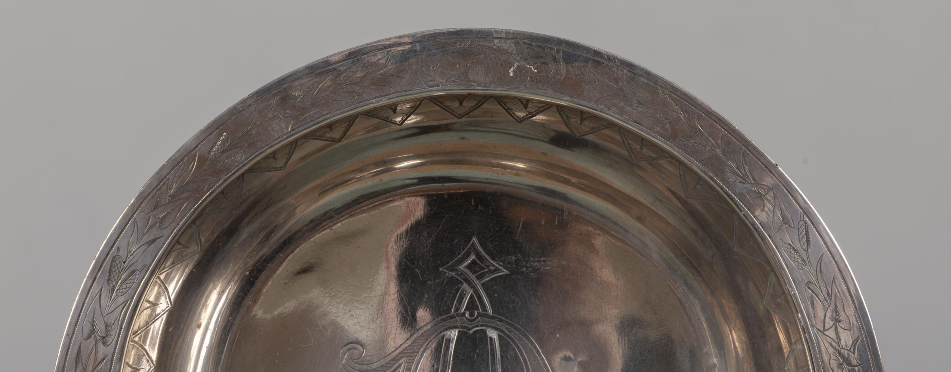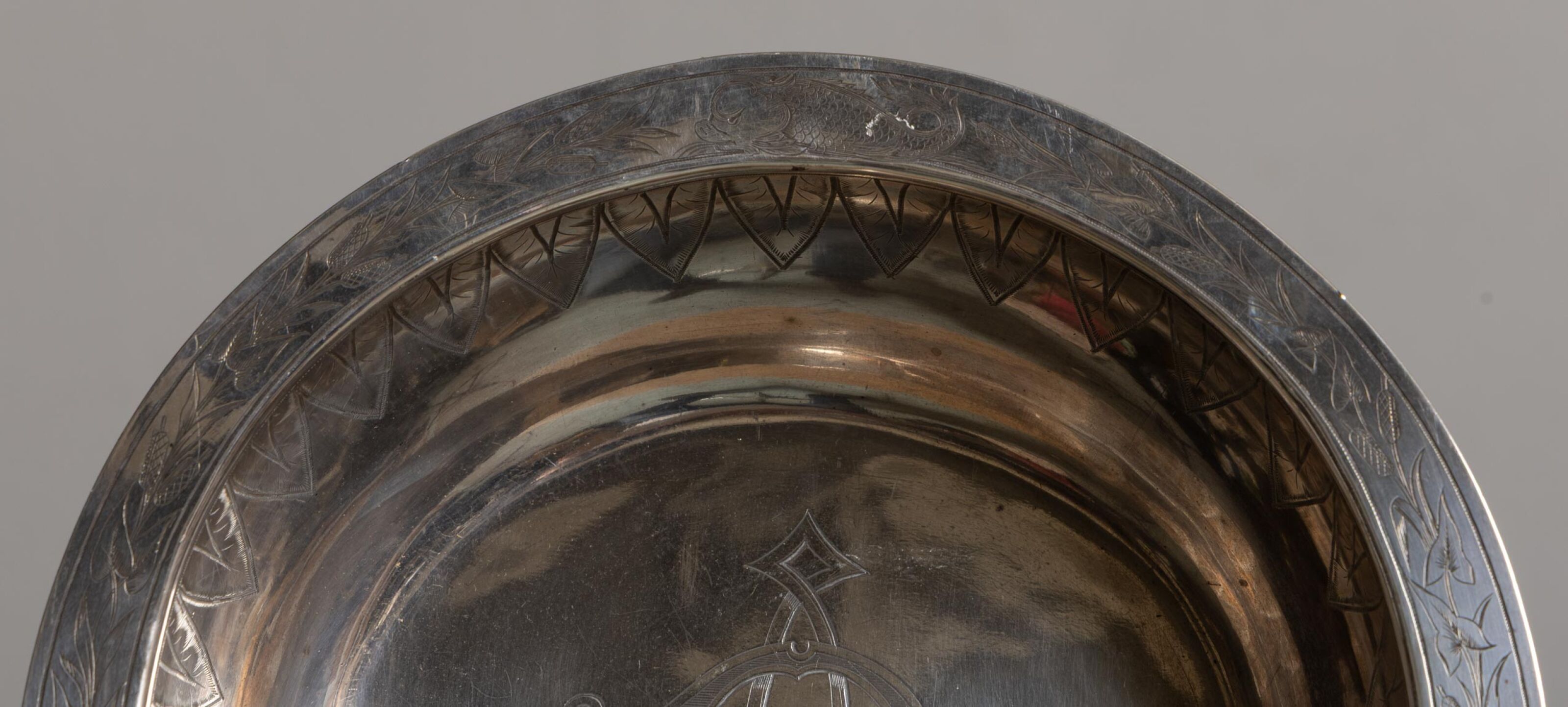 A silver-plated washbasin engraved with "A.R." and decorated with wheat leaves, palmettes and putti.