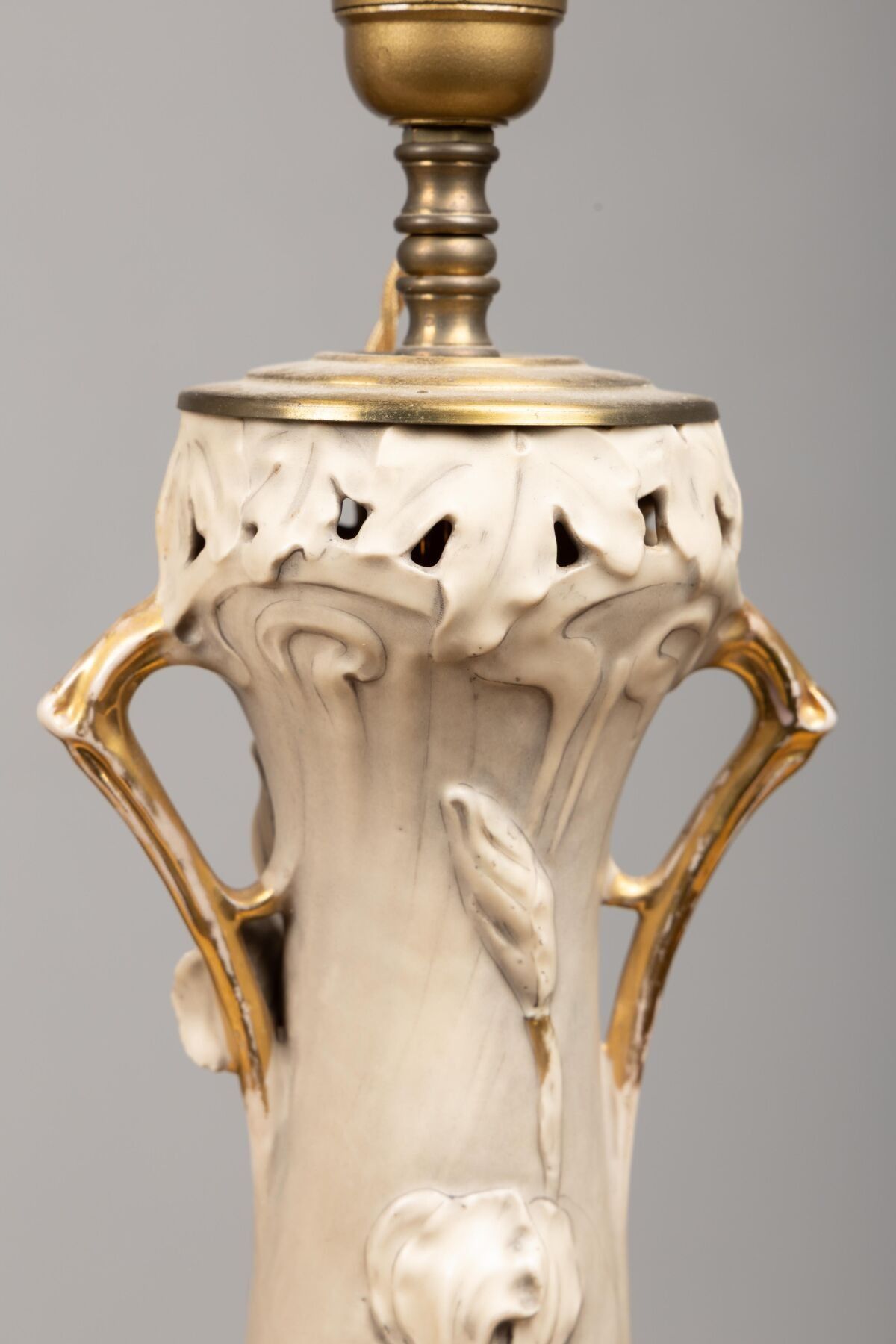 They have been mounted as lamps and fitted with small lampshades with beaded pendants.