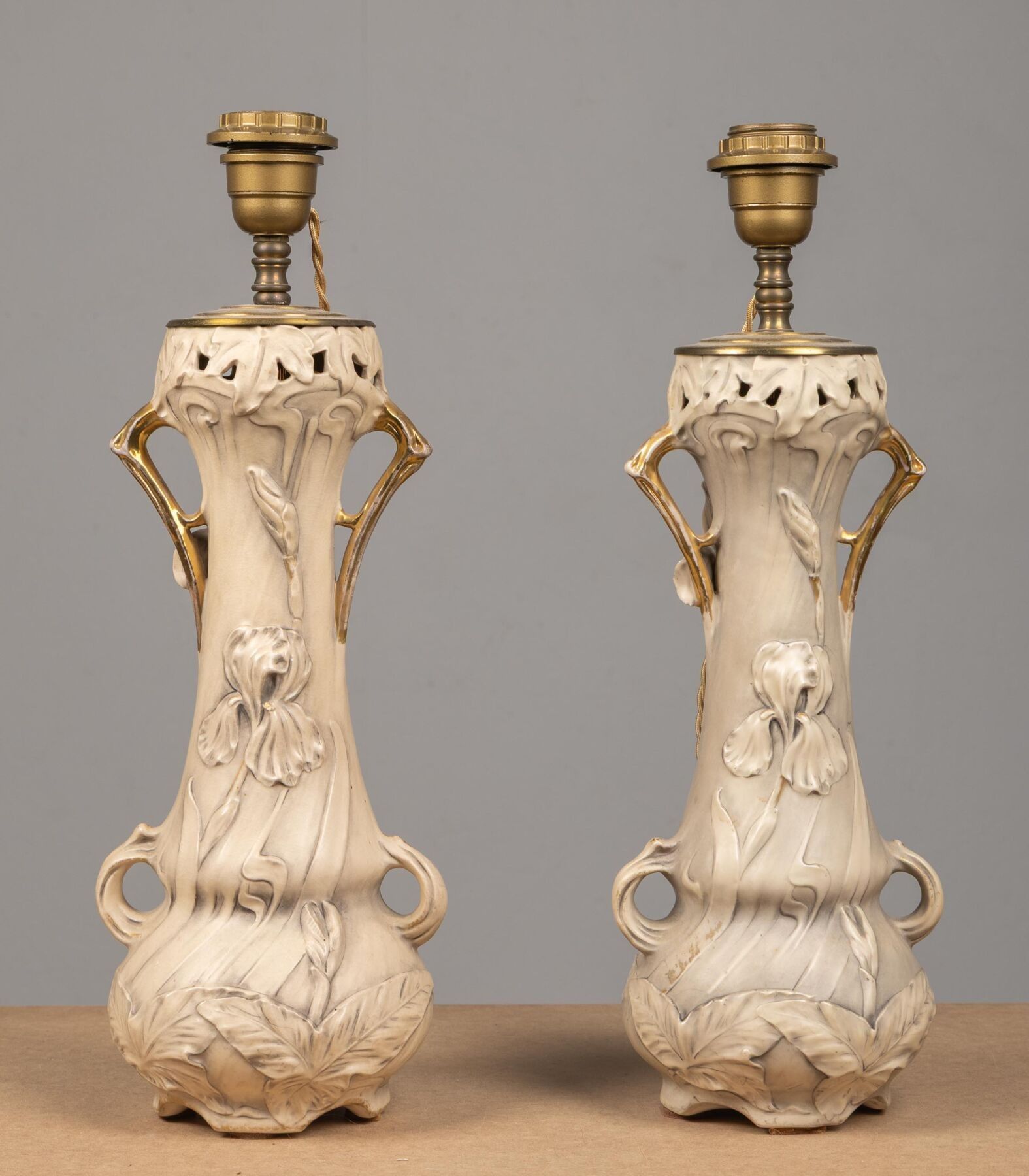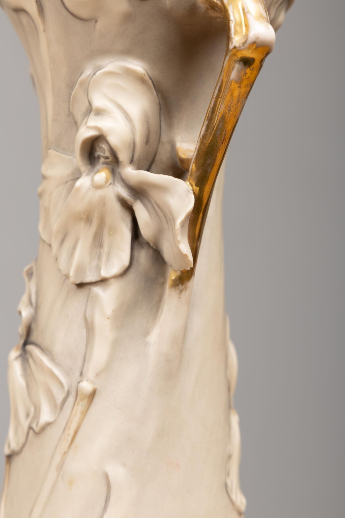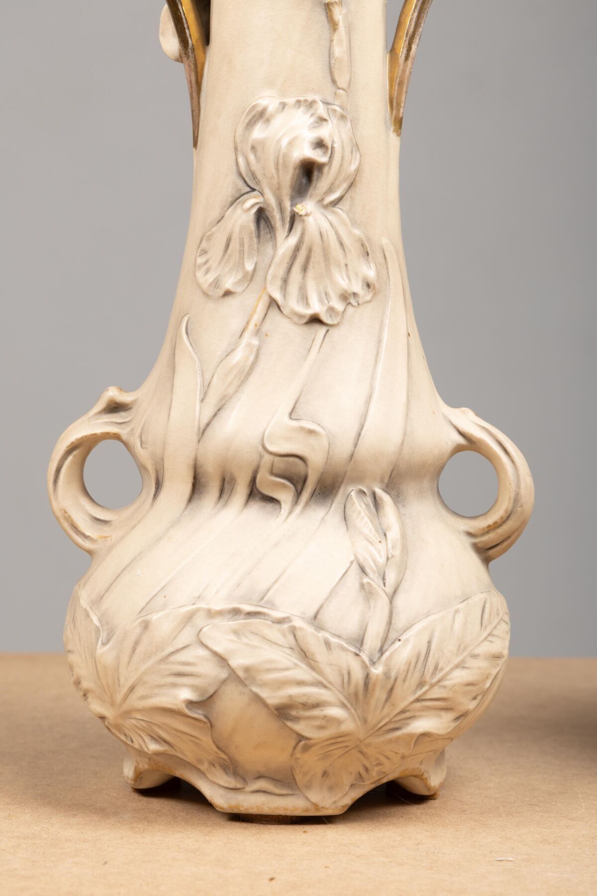 ROYAL DUX Pair of biscuit vases with iris decoration in reli…