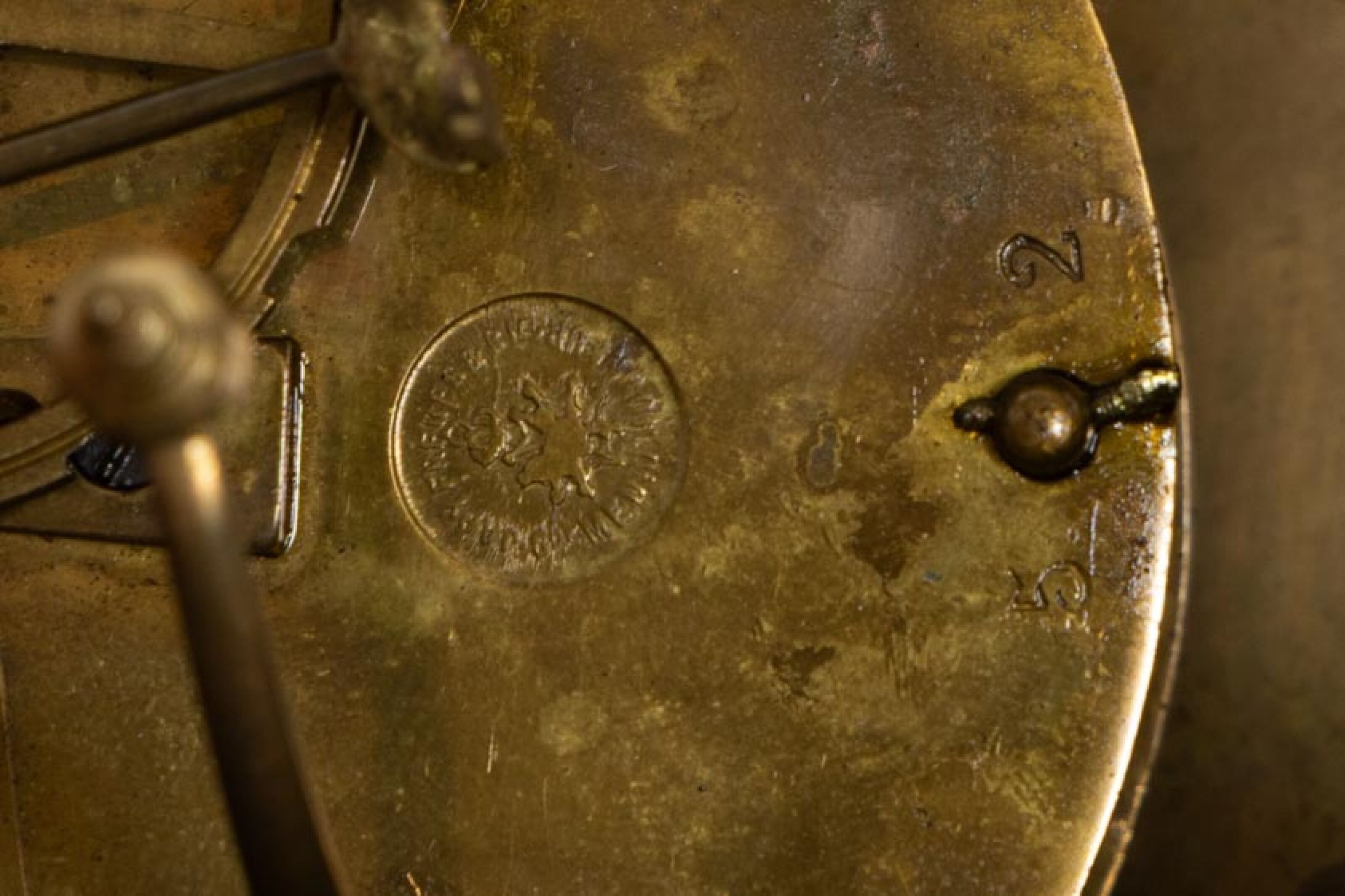 Enamelled frame with two hands, hours with Roman numerals, minutes with a railway track.