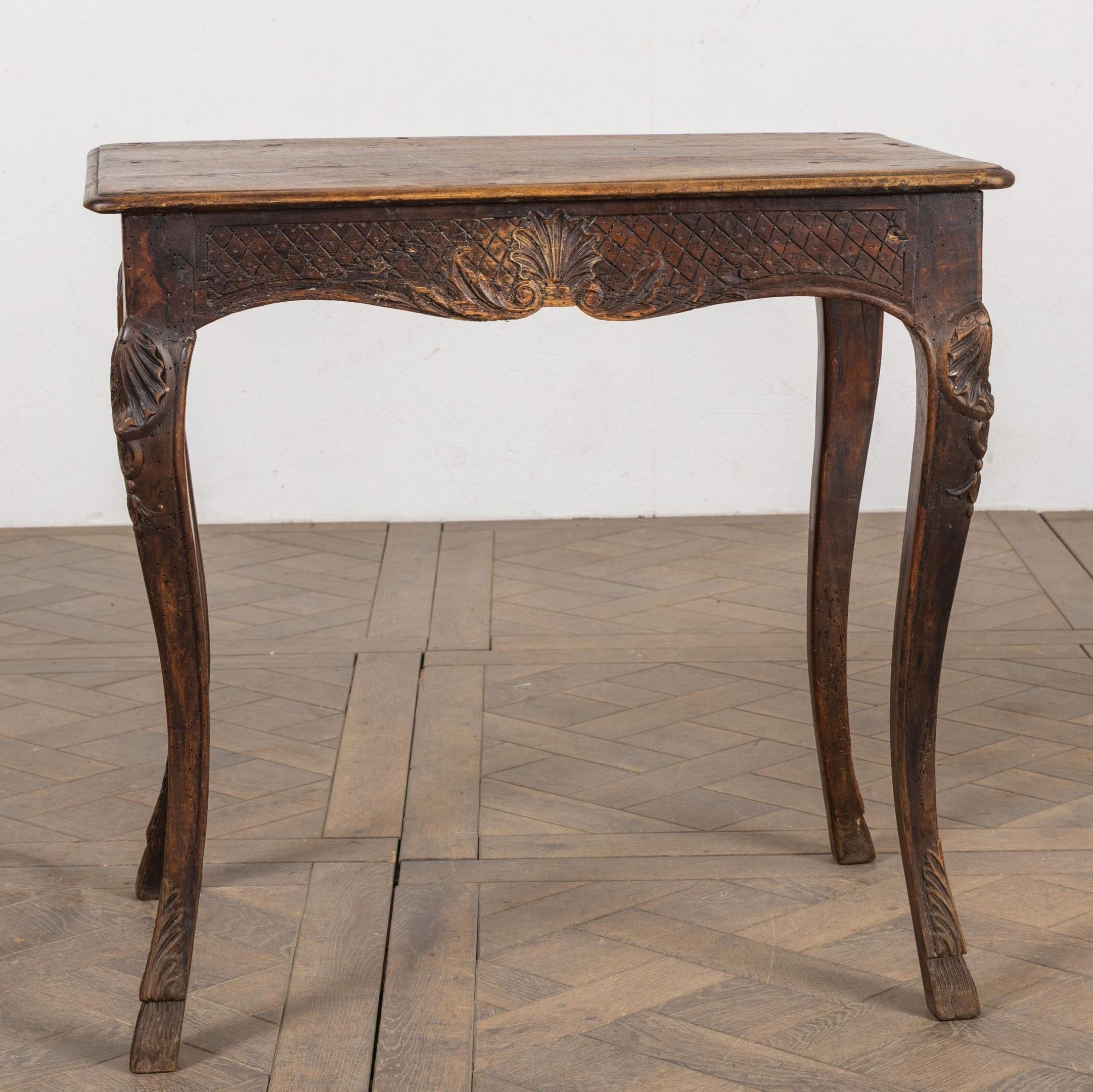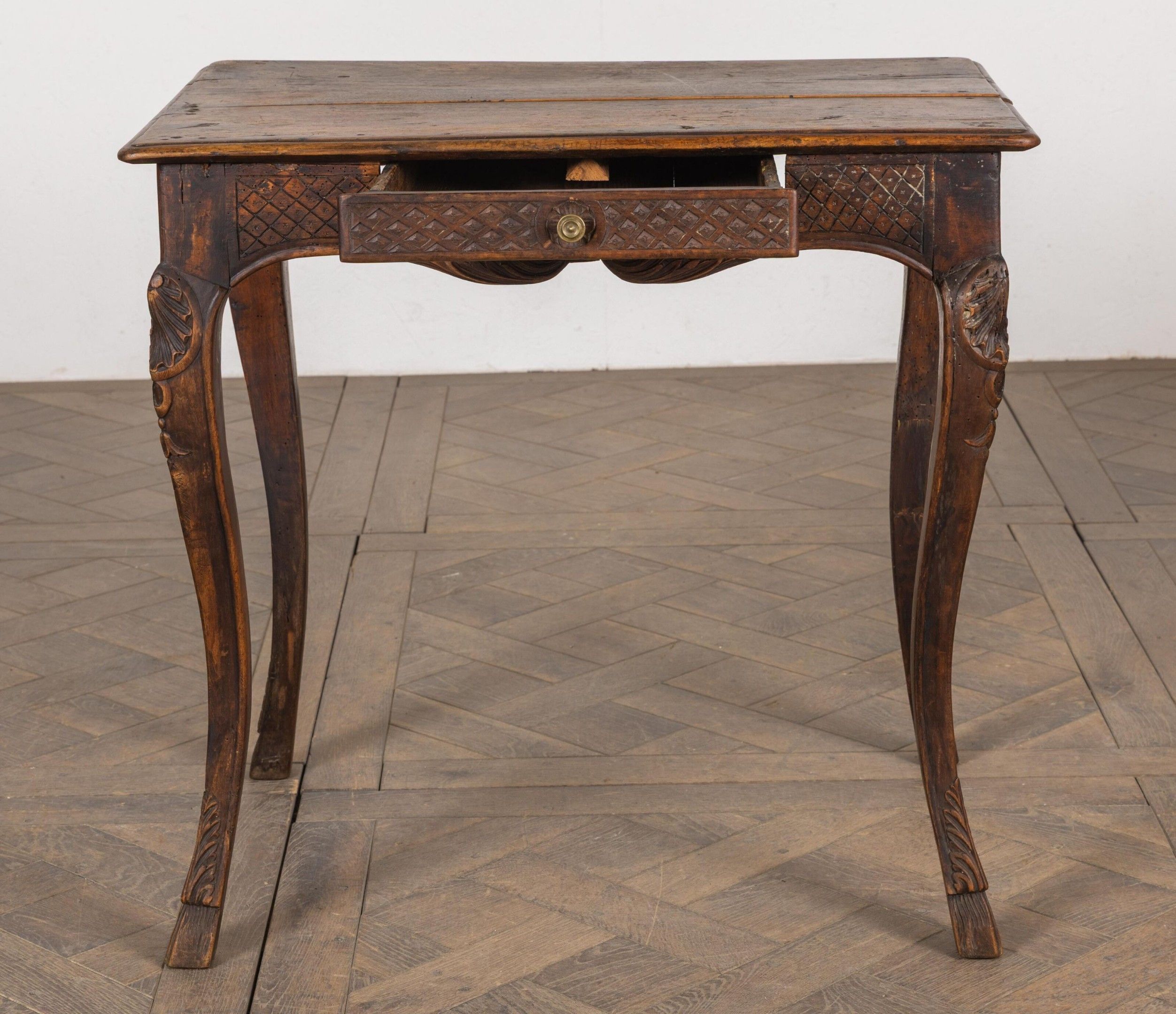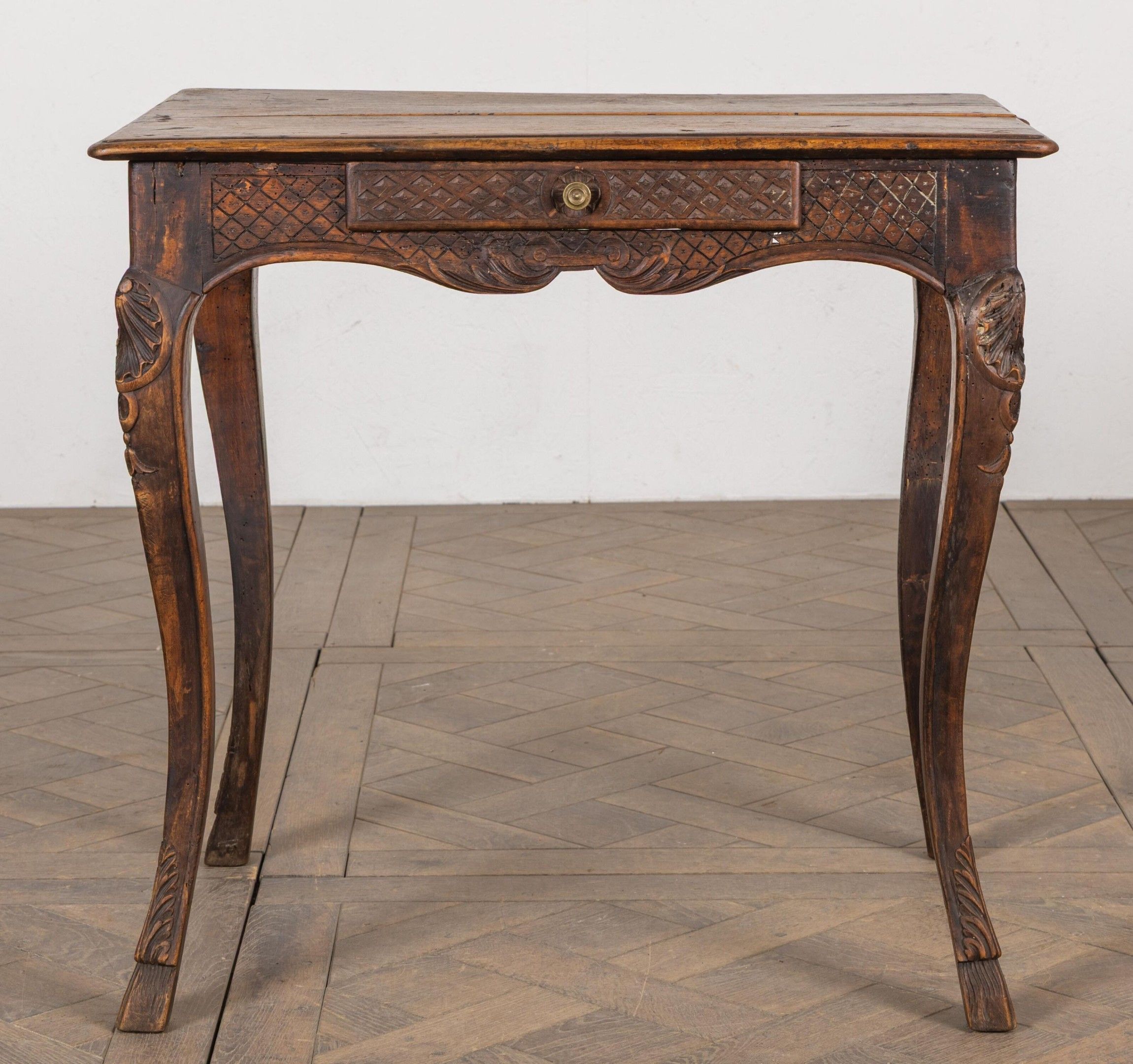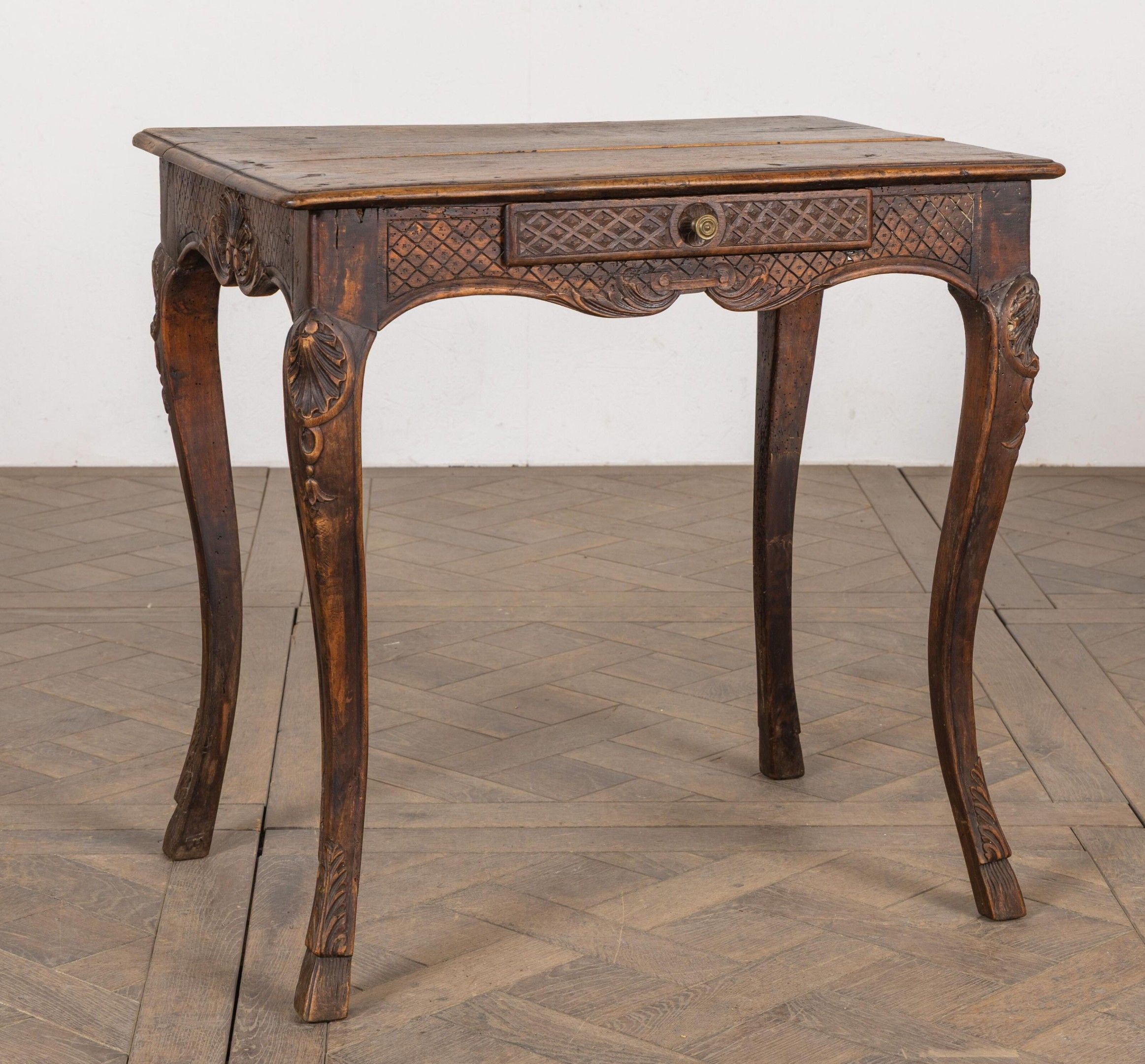 Small writing table in moulded and carved then stained wood, opening to a drawer in the waist.