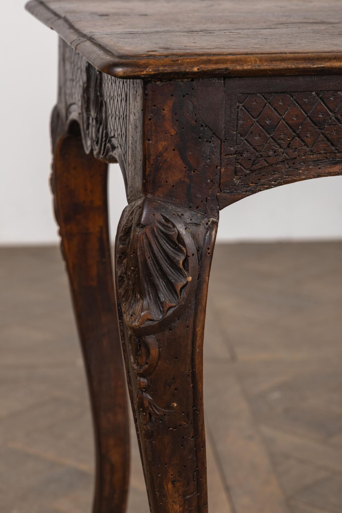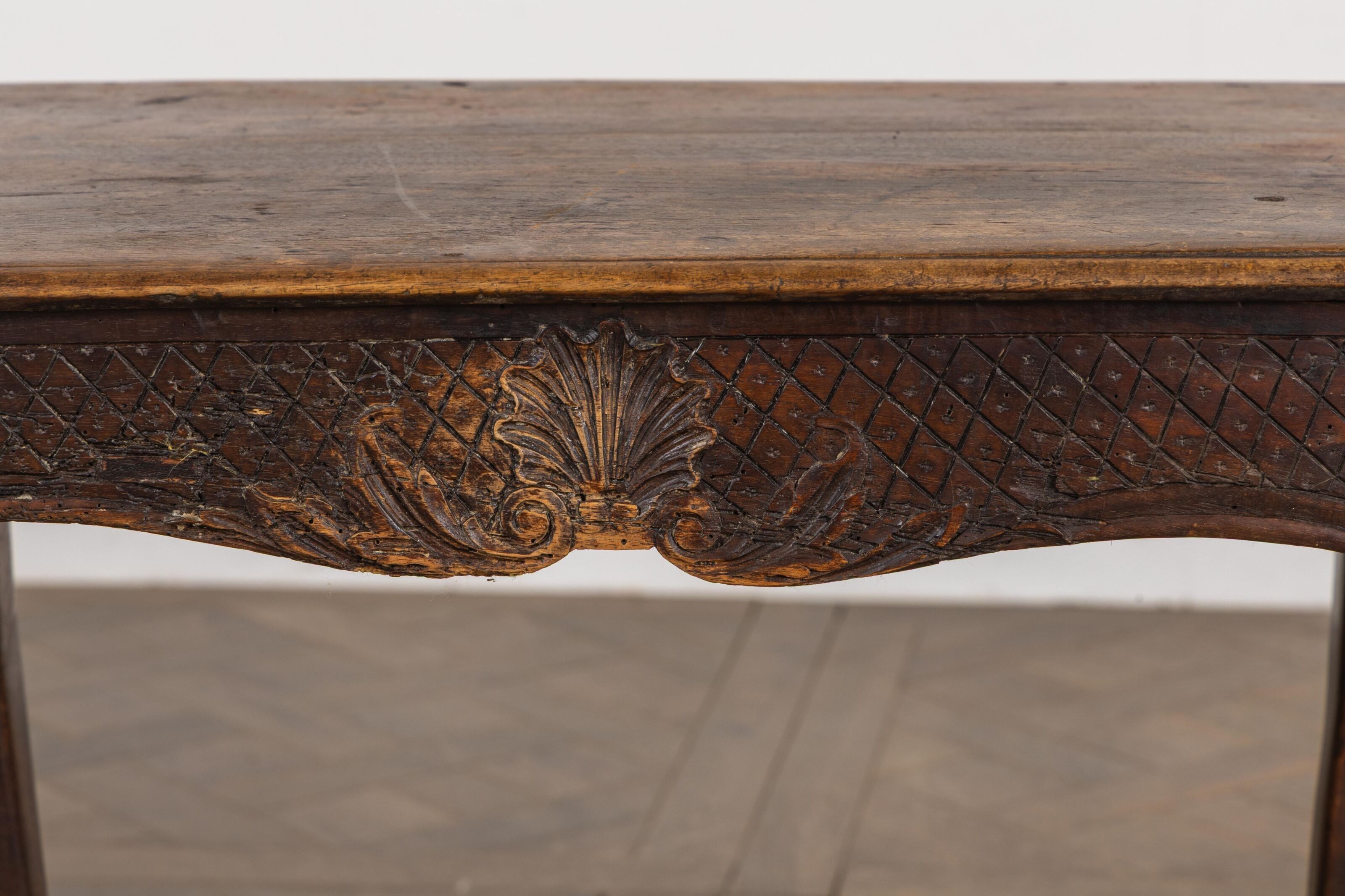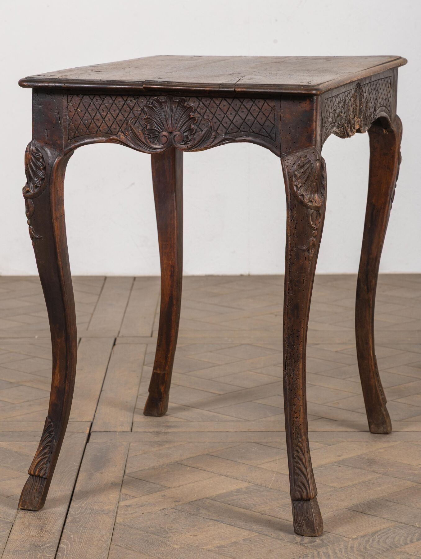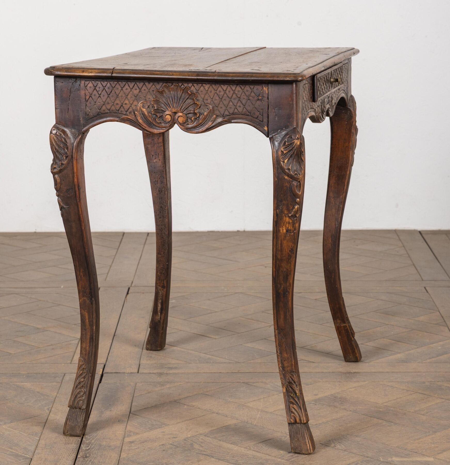 Small writing table in moulded and carved then stained wood, opening to a drawer in the waist.