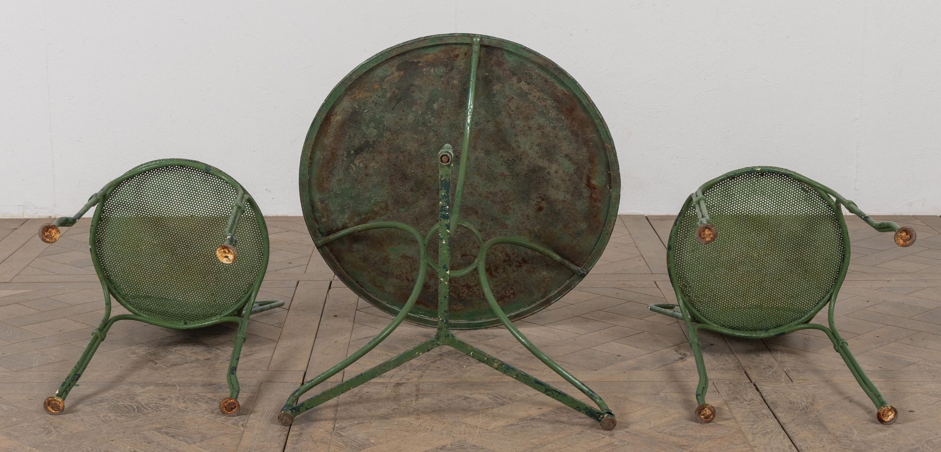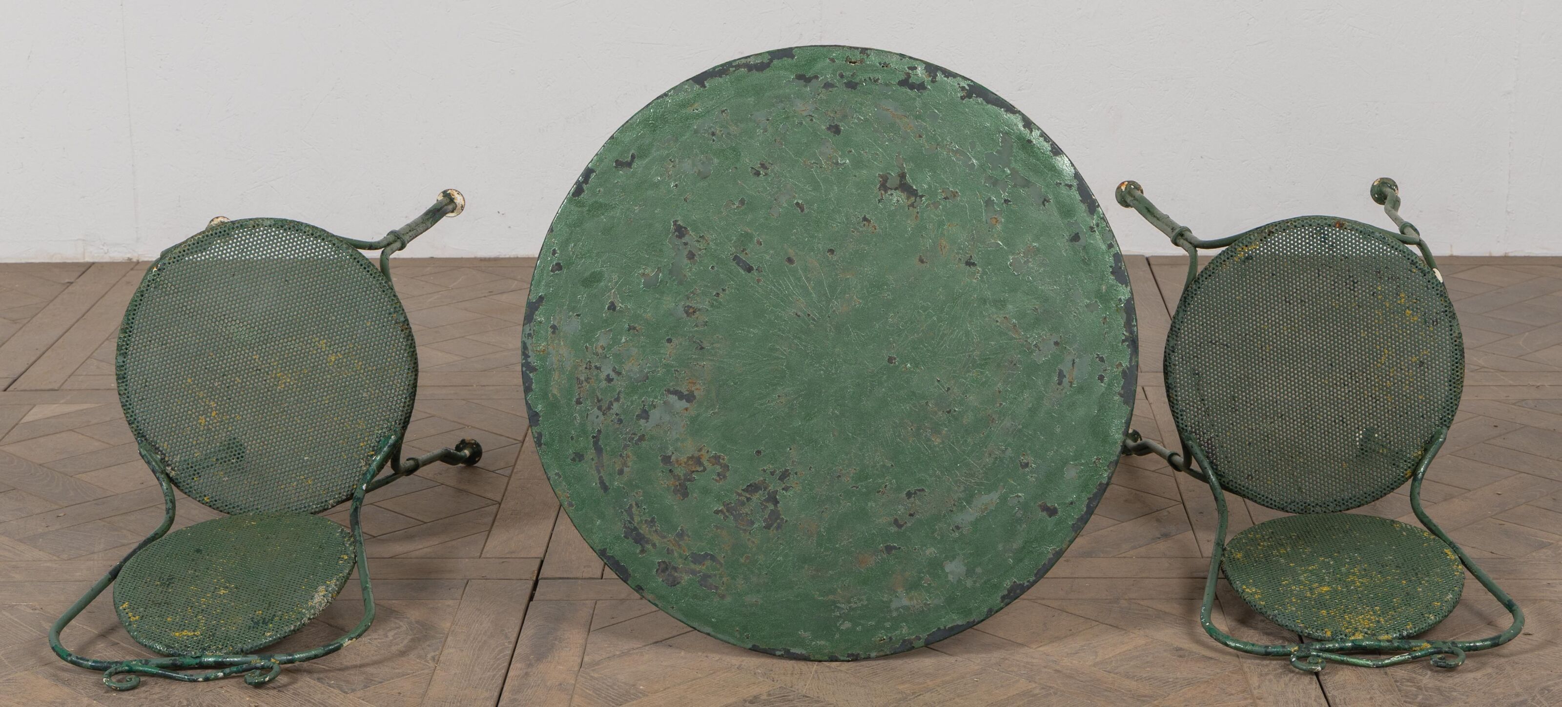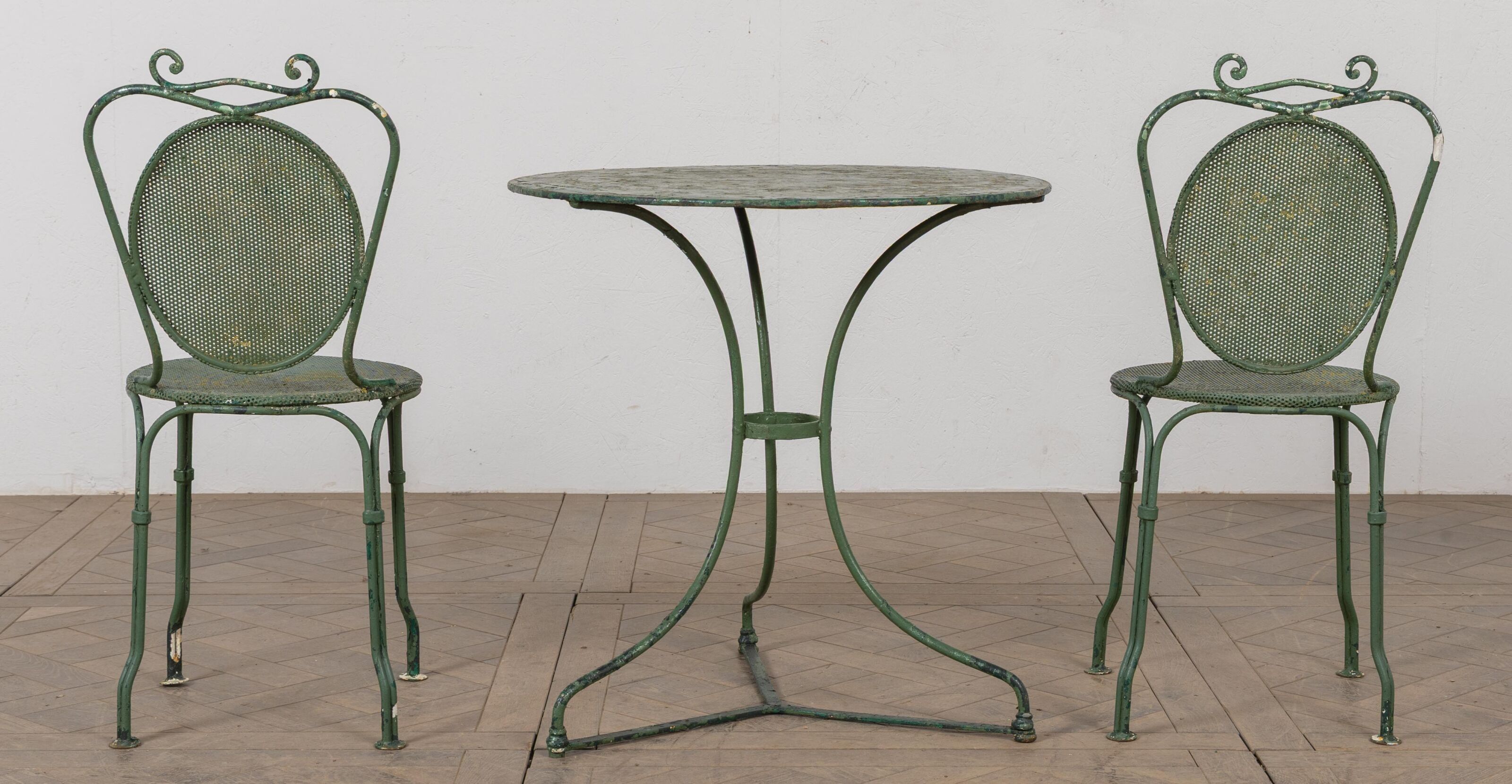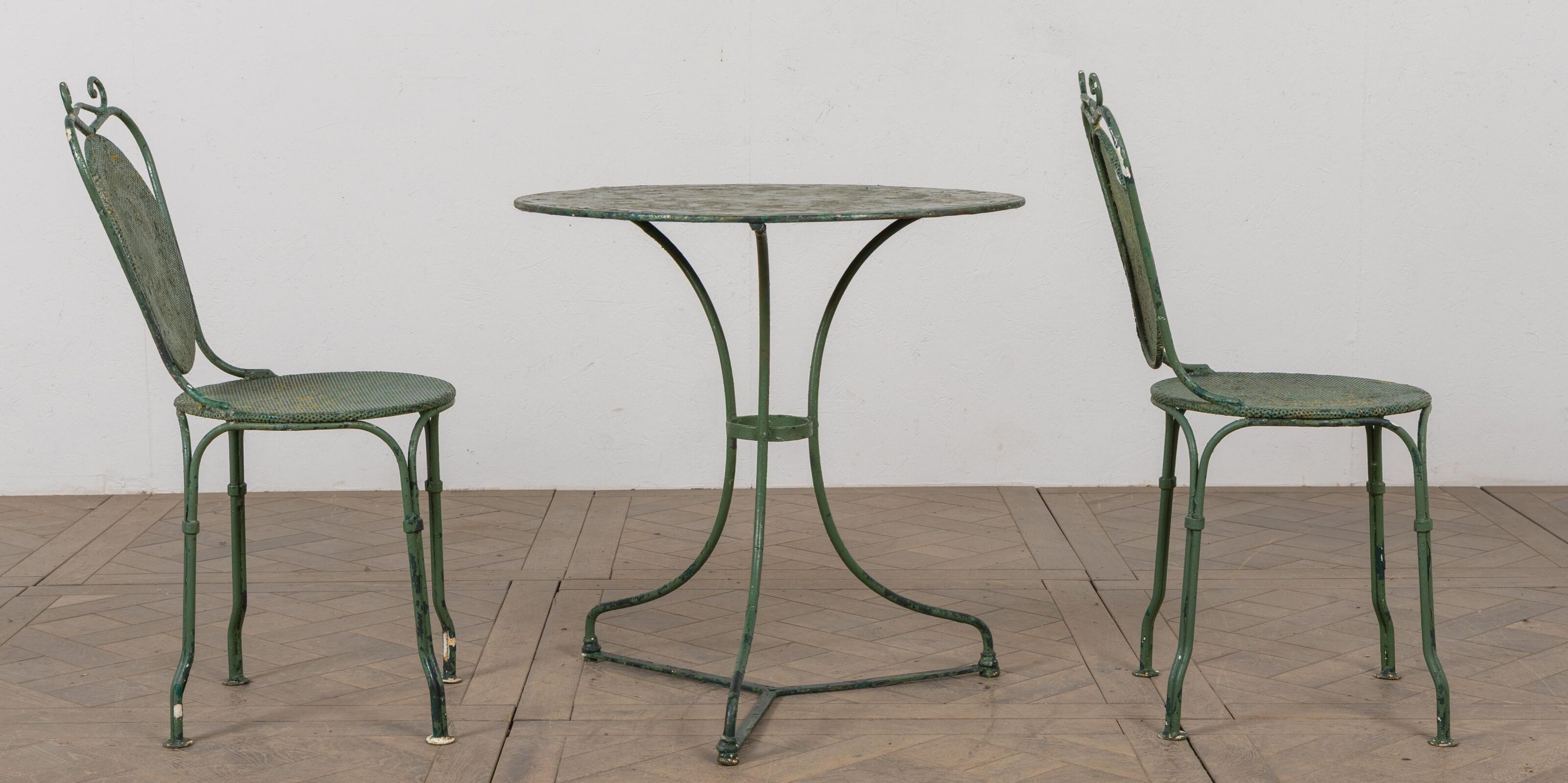 Garden table and two chairs in green lacquered metal.