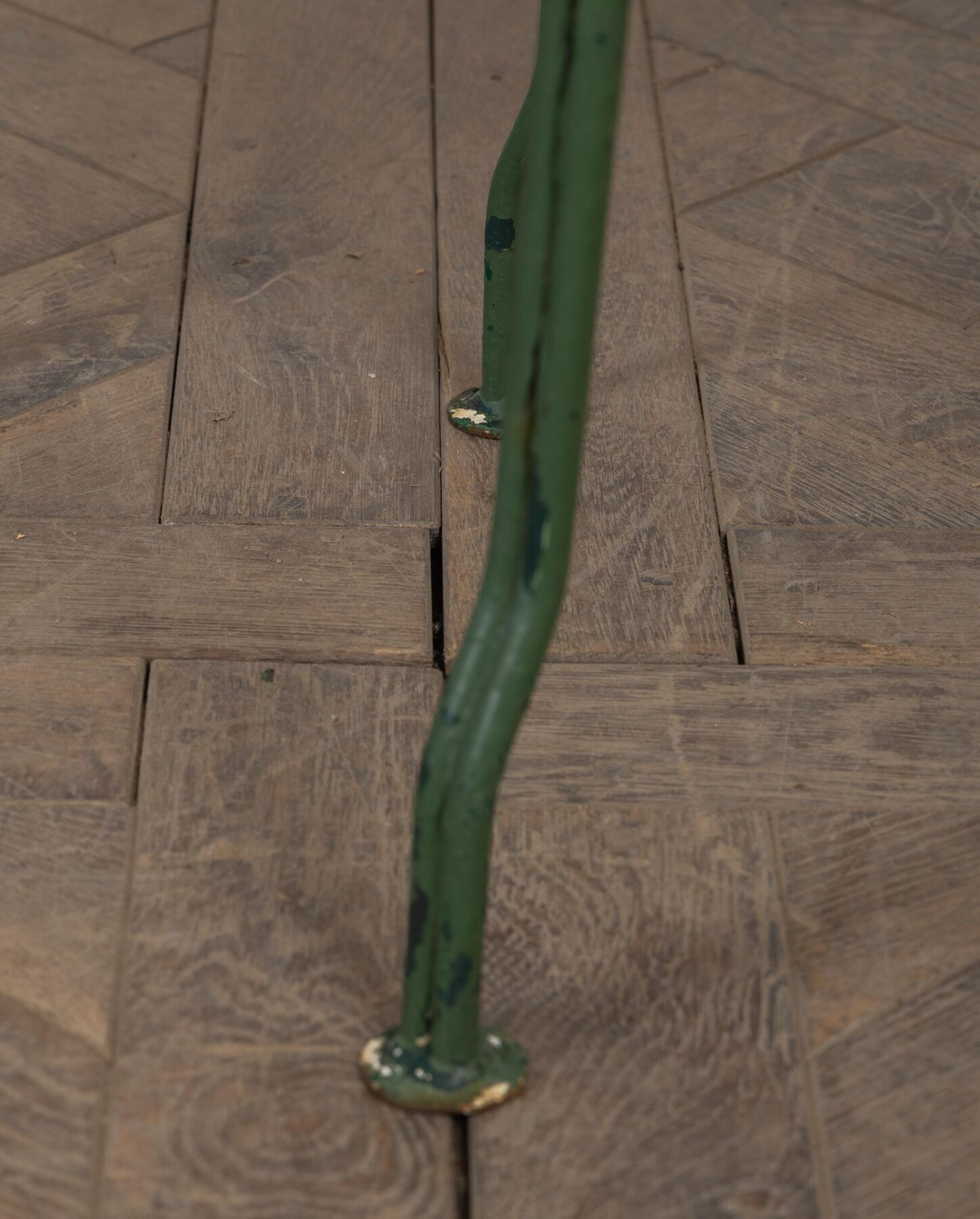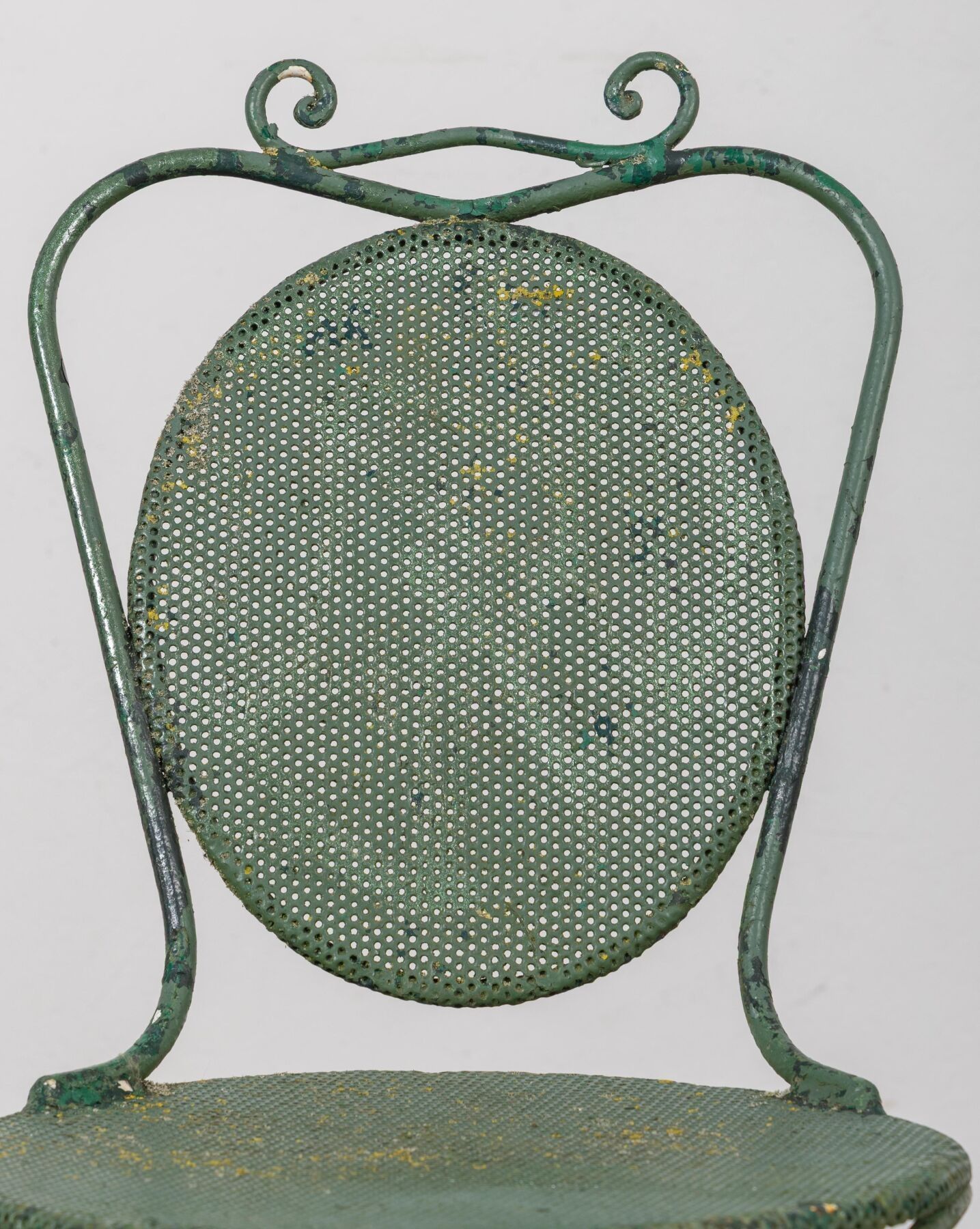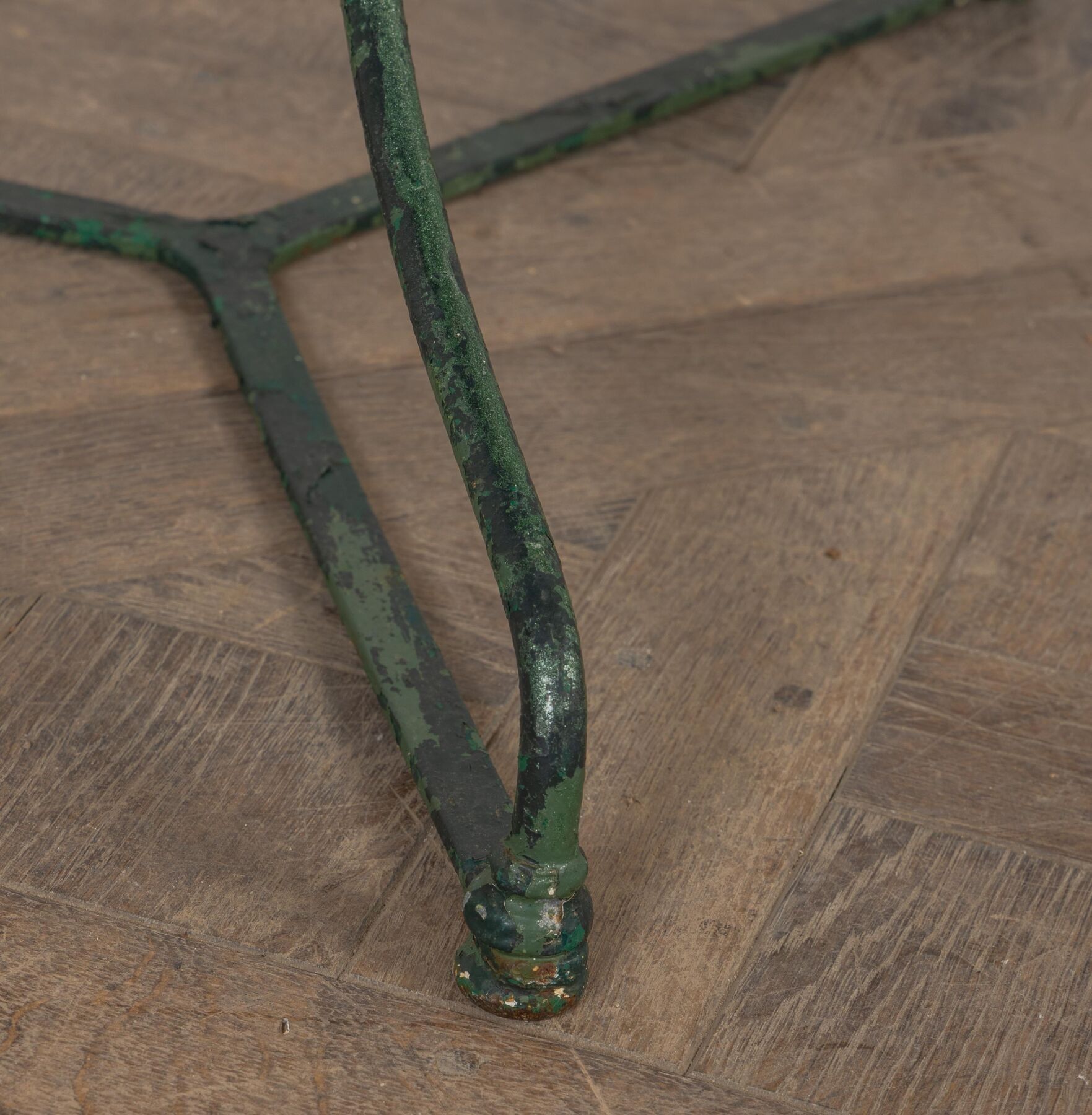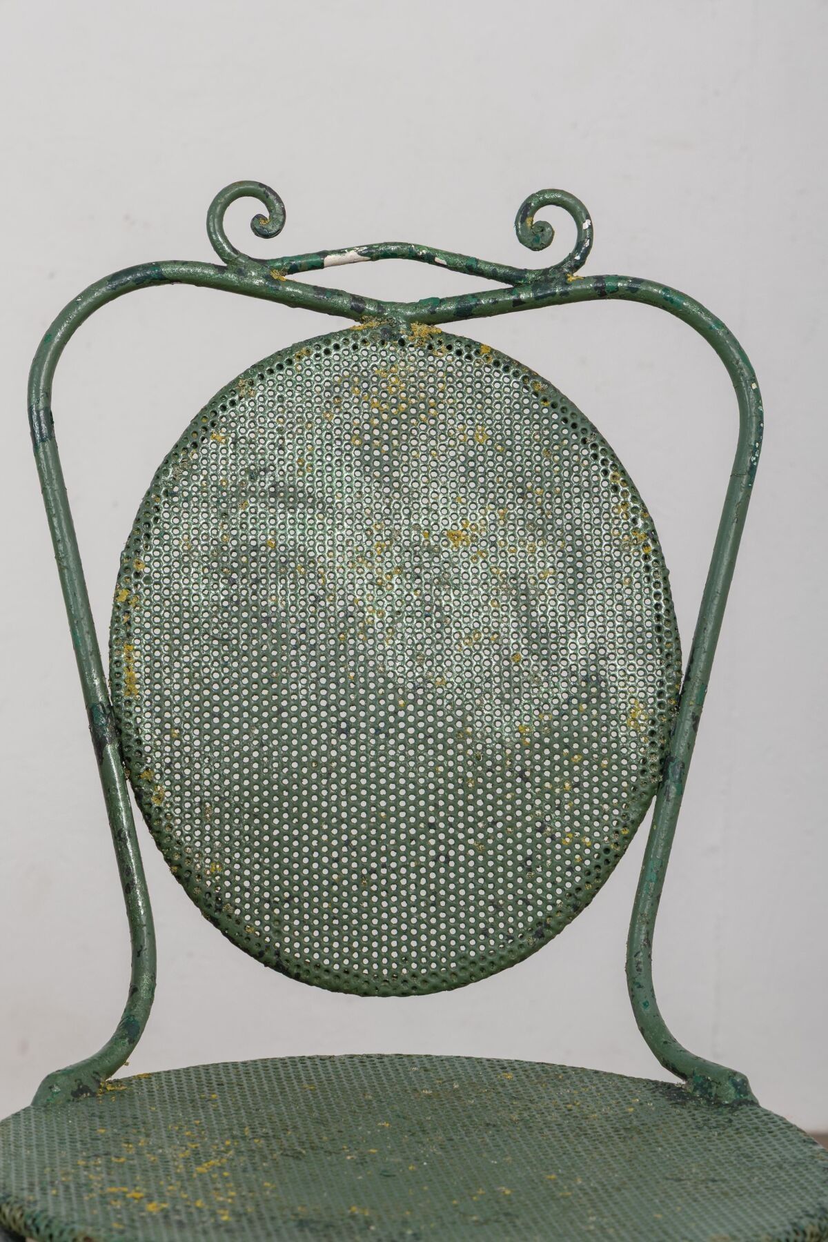 Garden table and two chairs in green lacquered metal.