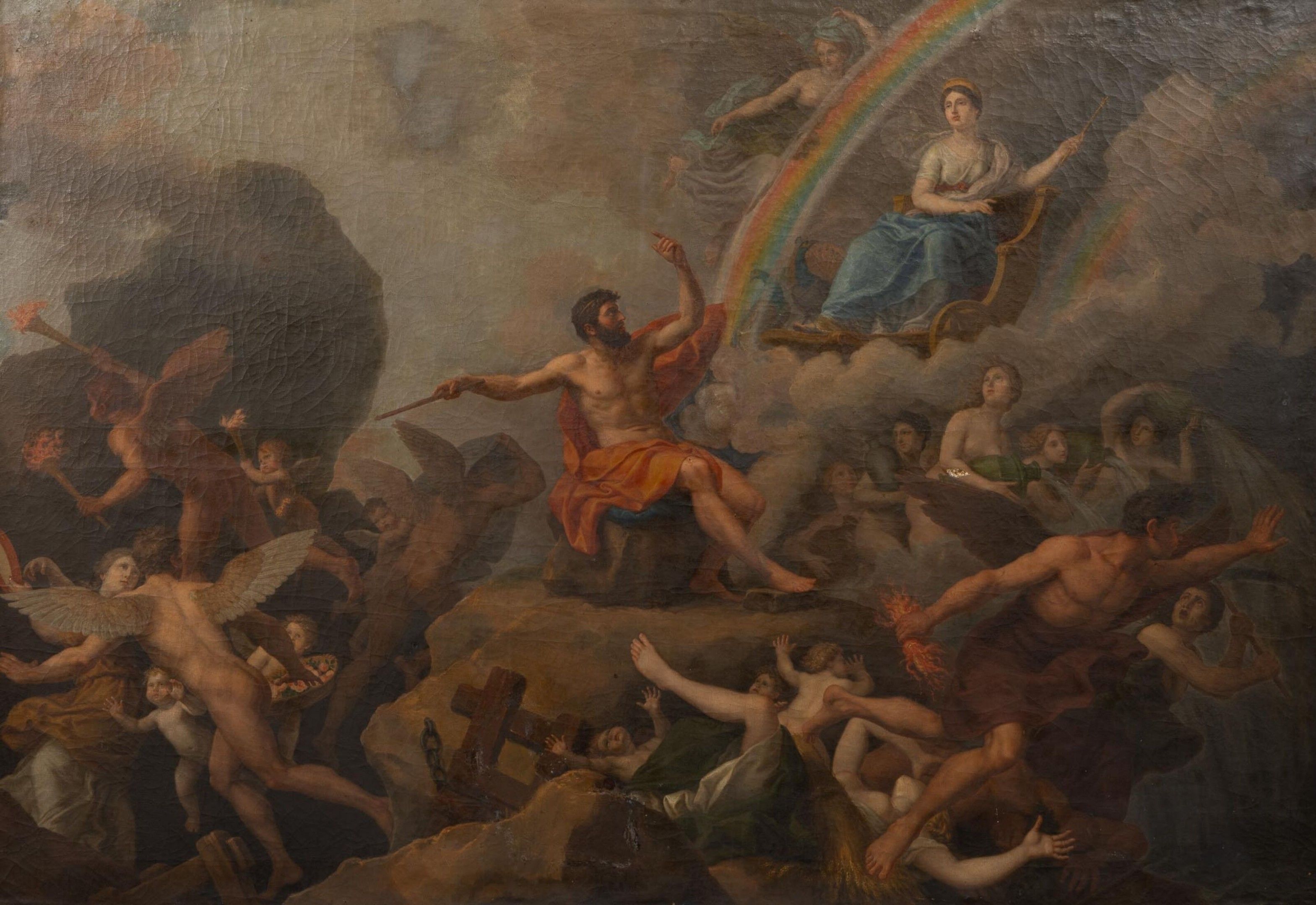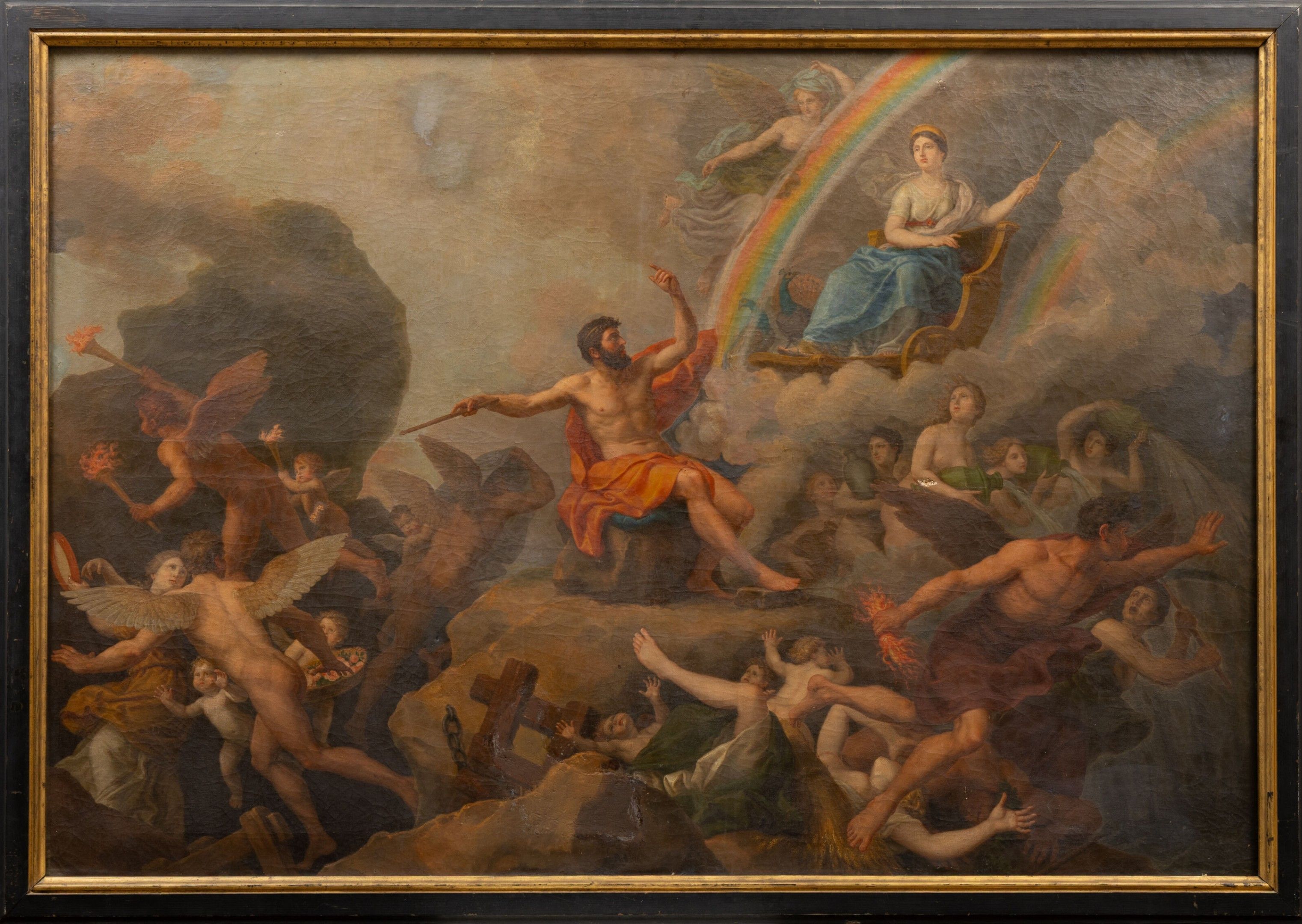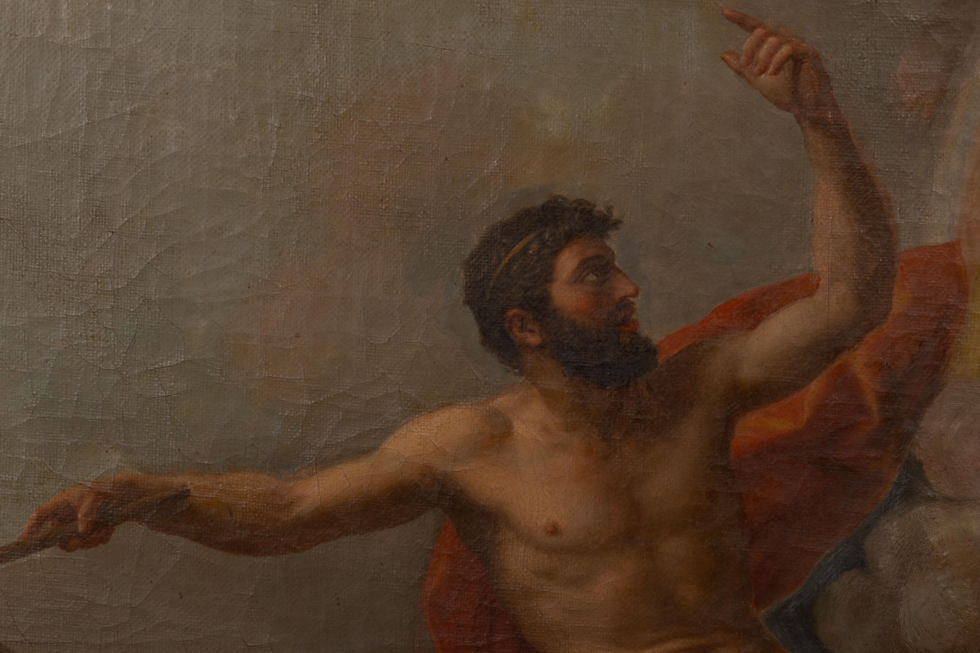 Laurent PÉCHEUX (1729-1821). The Air. Juno asks Aeolus to stir up the winds against Aeneas' fleet and stir up a storm. Large oil on canvas, signed lower middle. H_126 cm L_184,5 cm, accidents, old restorations Painted by Pécheux in 1804, our painting illustrating the air is part of a series devoted to the elements, the four works having so far been listed in an extensive bibliography. Provenance: Collection of Benedetto Pécheux, son of the artist, Paris, in 1808. Acquired by the current owner in the 1970s.