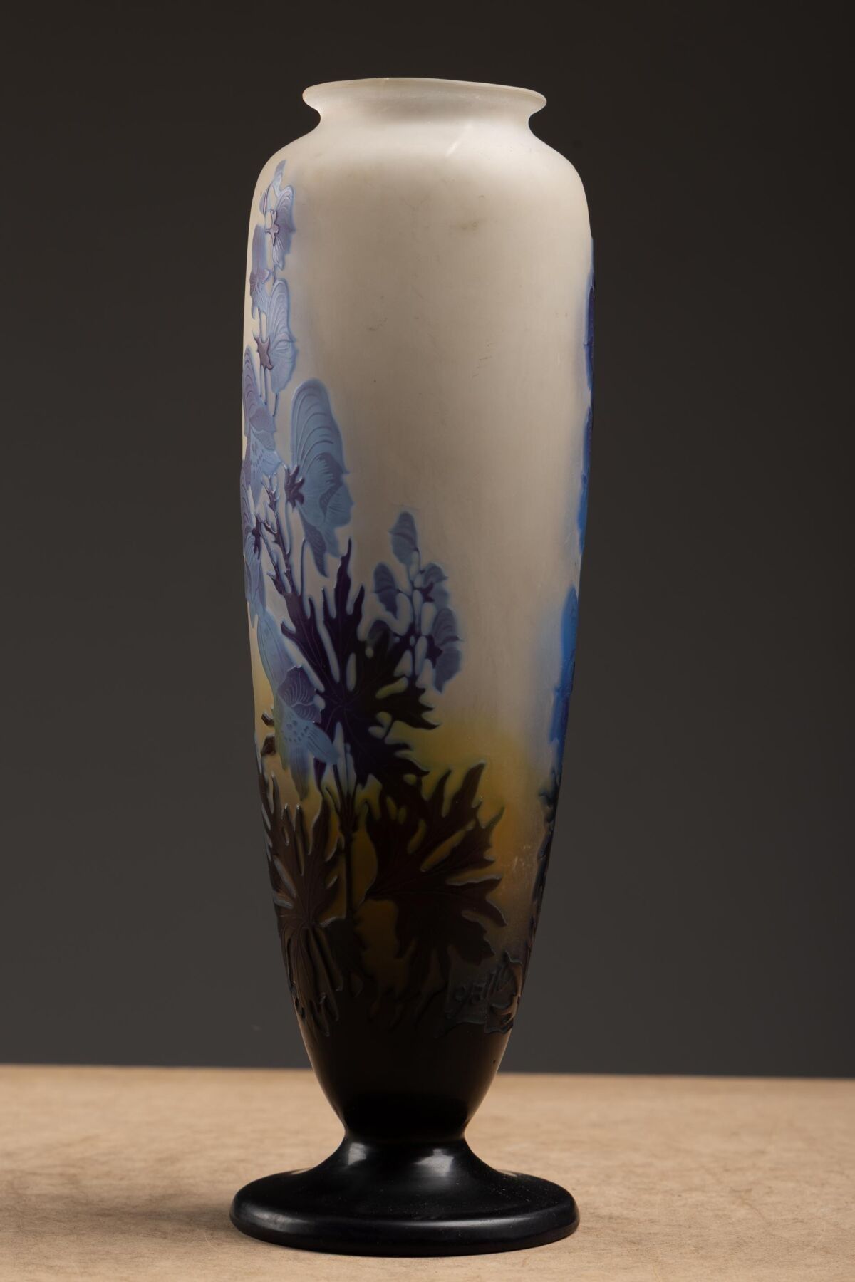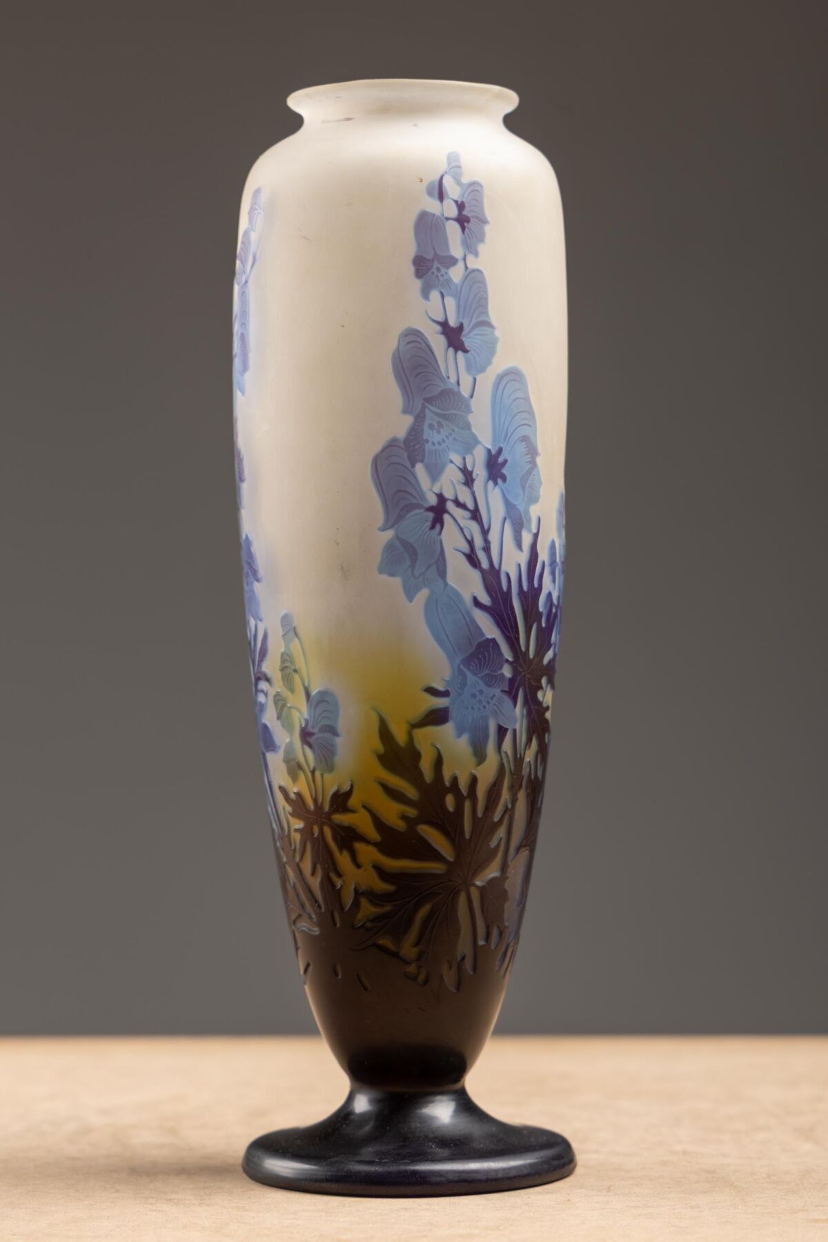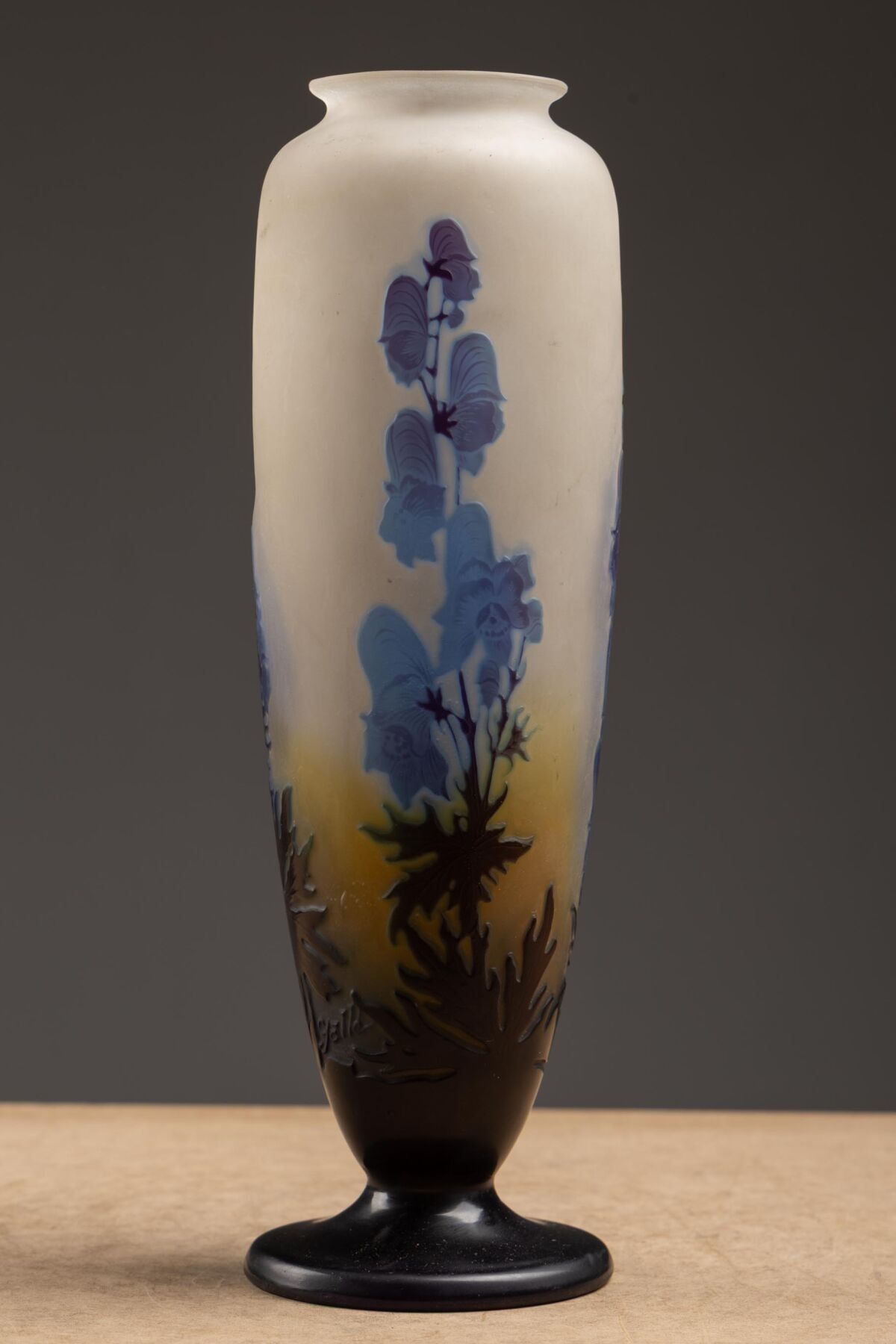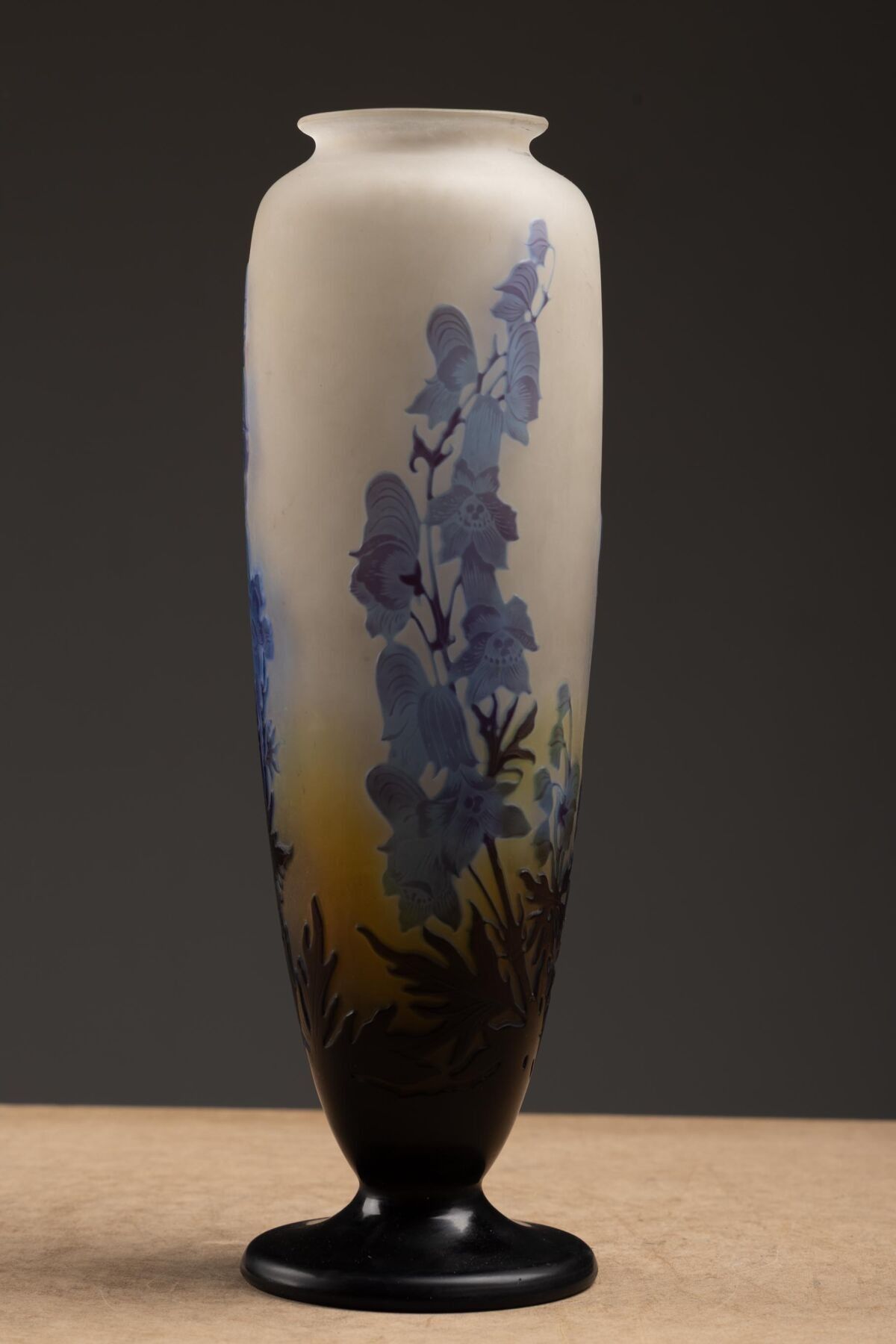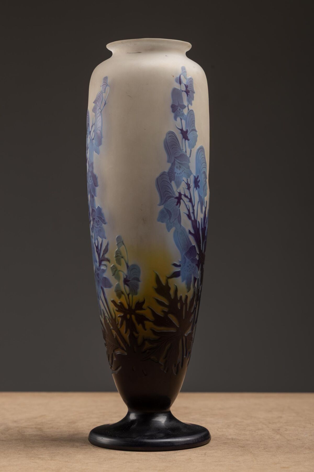 Acid-etched multi-layered glass baluster vase on pedestal.