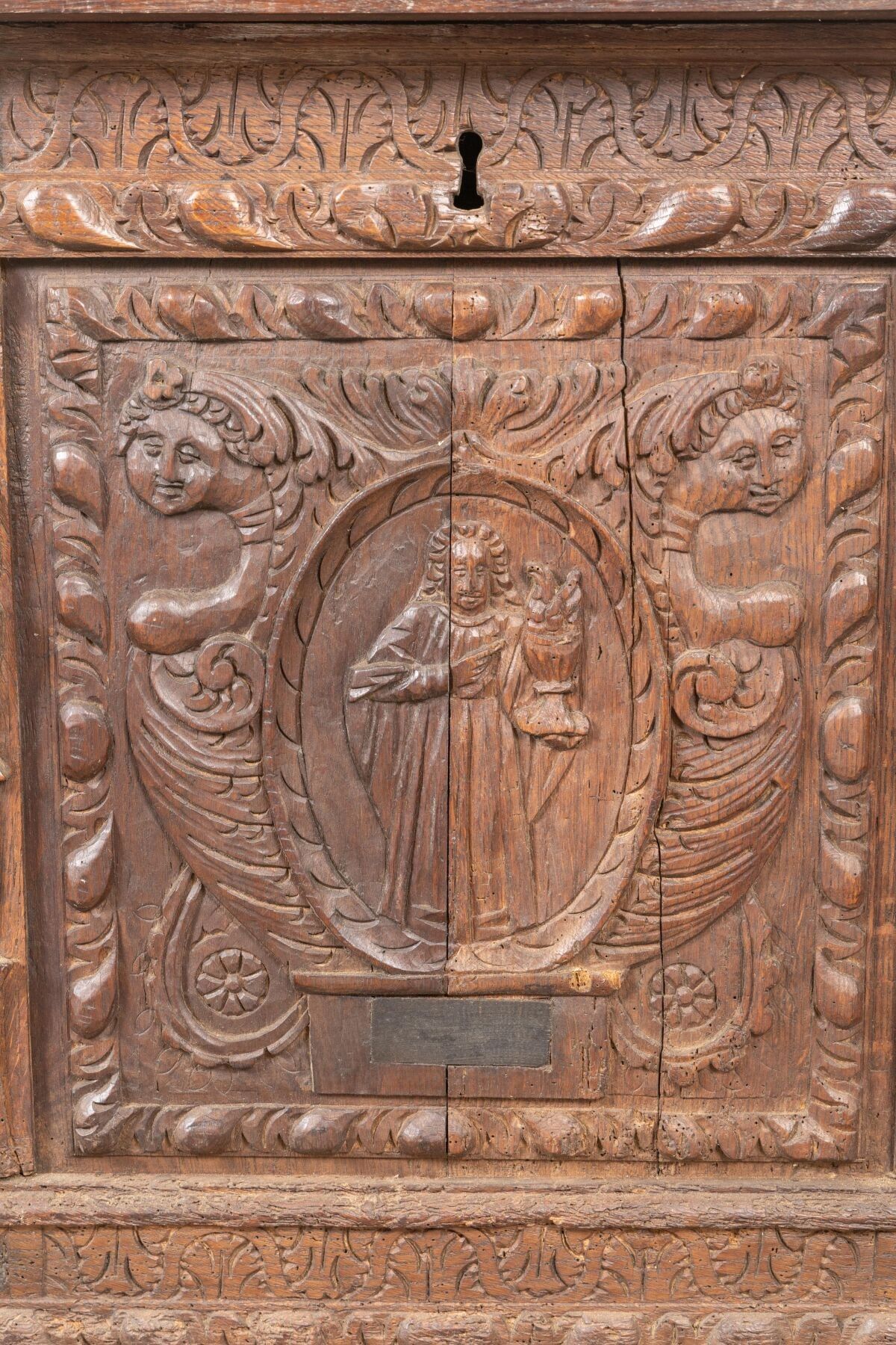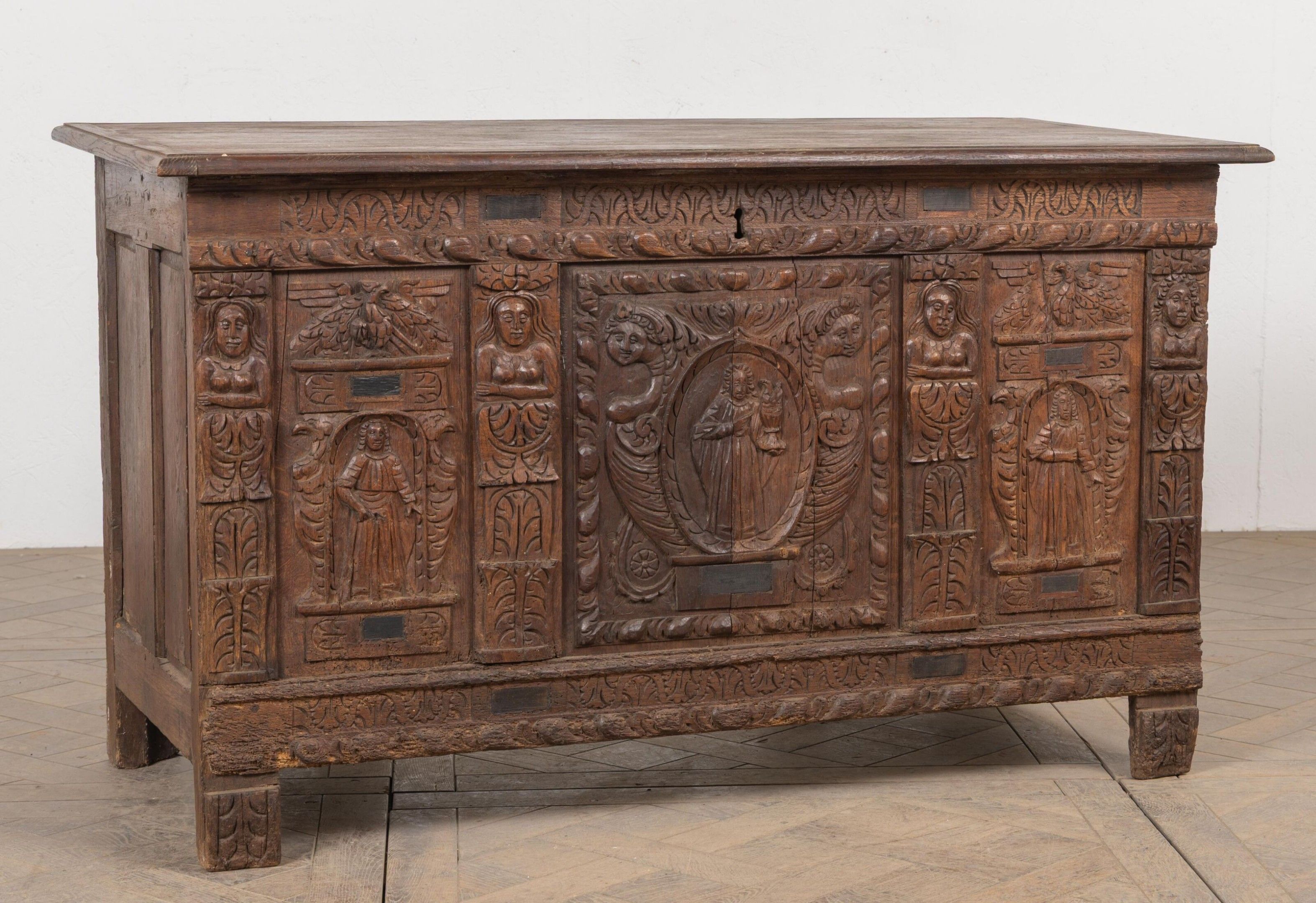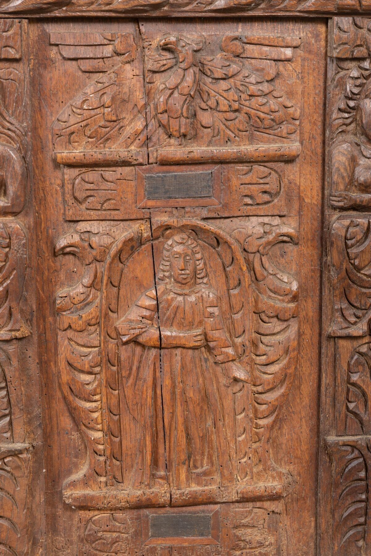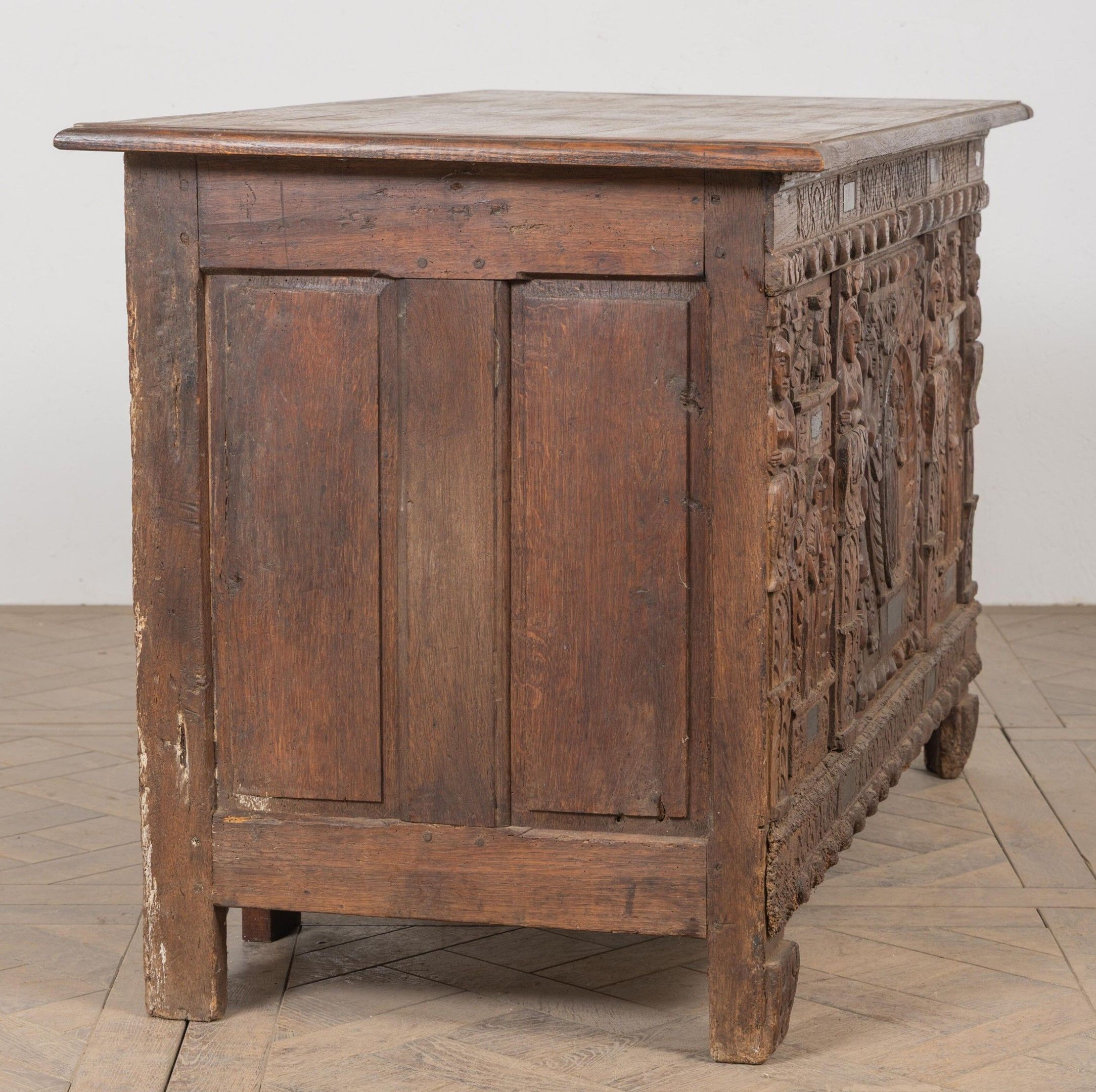 Desk consisting of an oak chest front richly carved with biblical figures and terms.