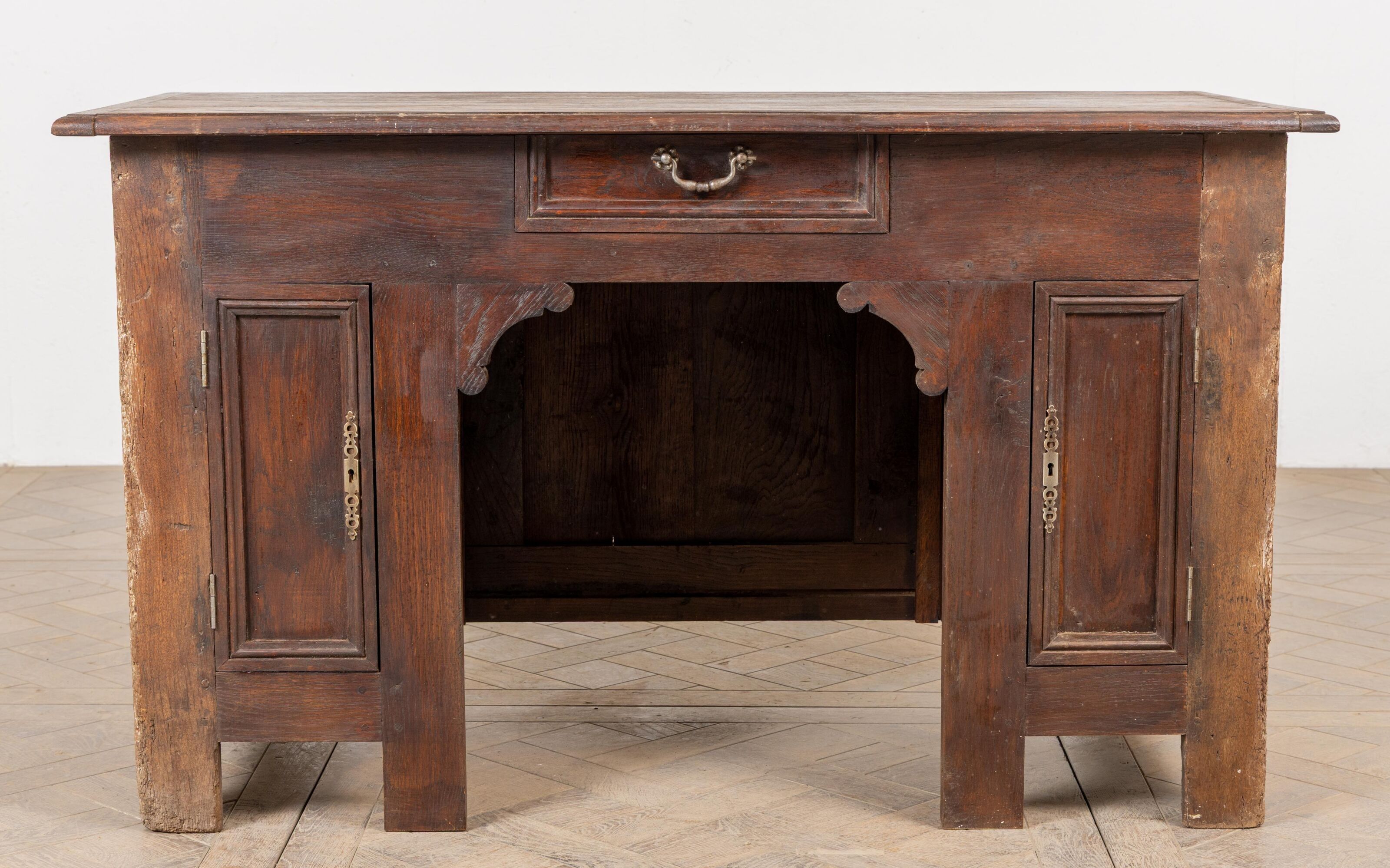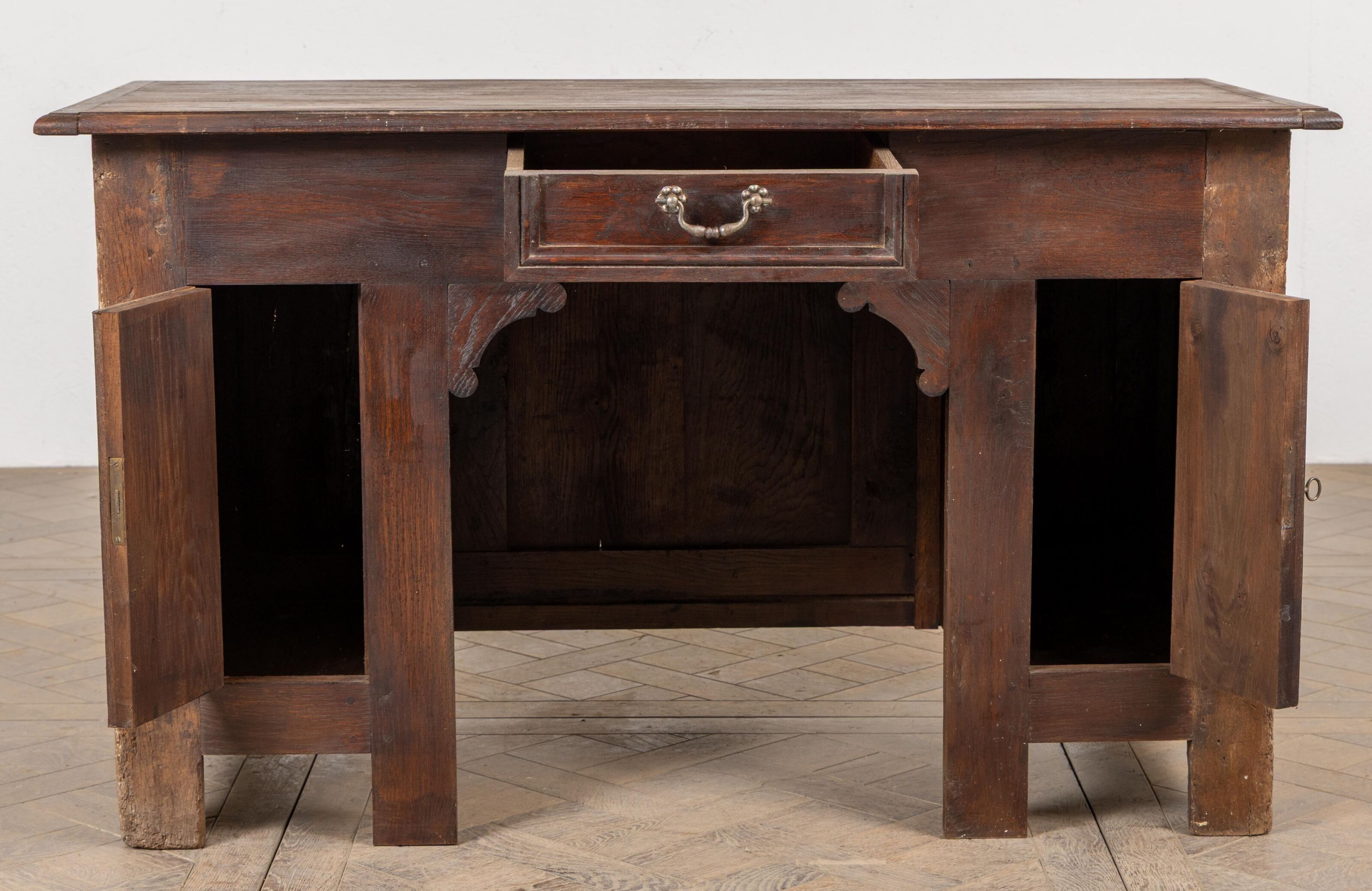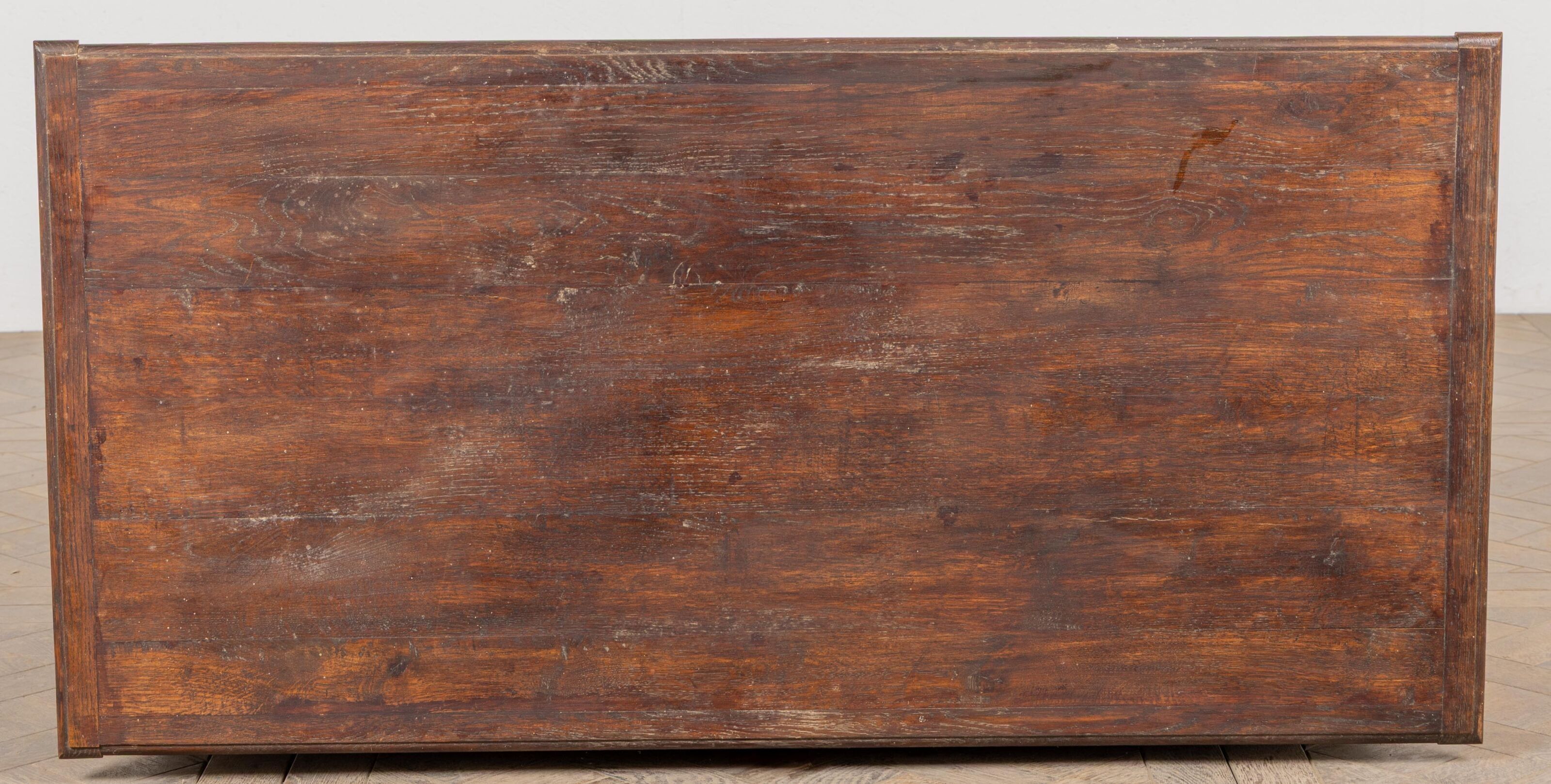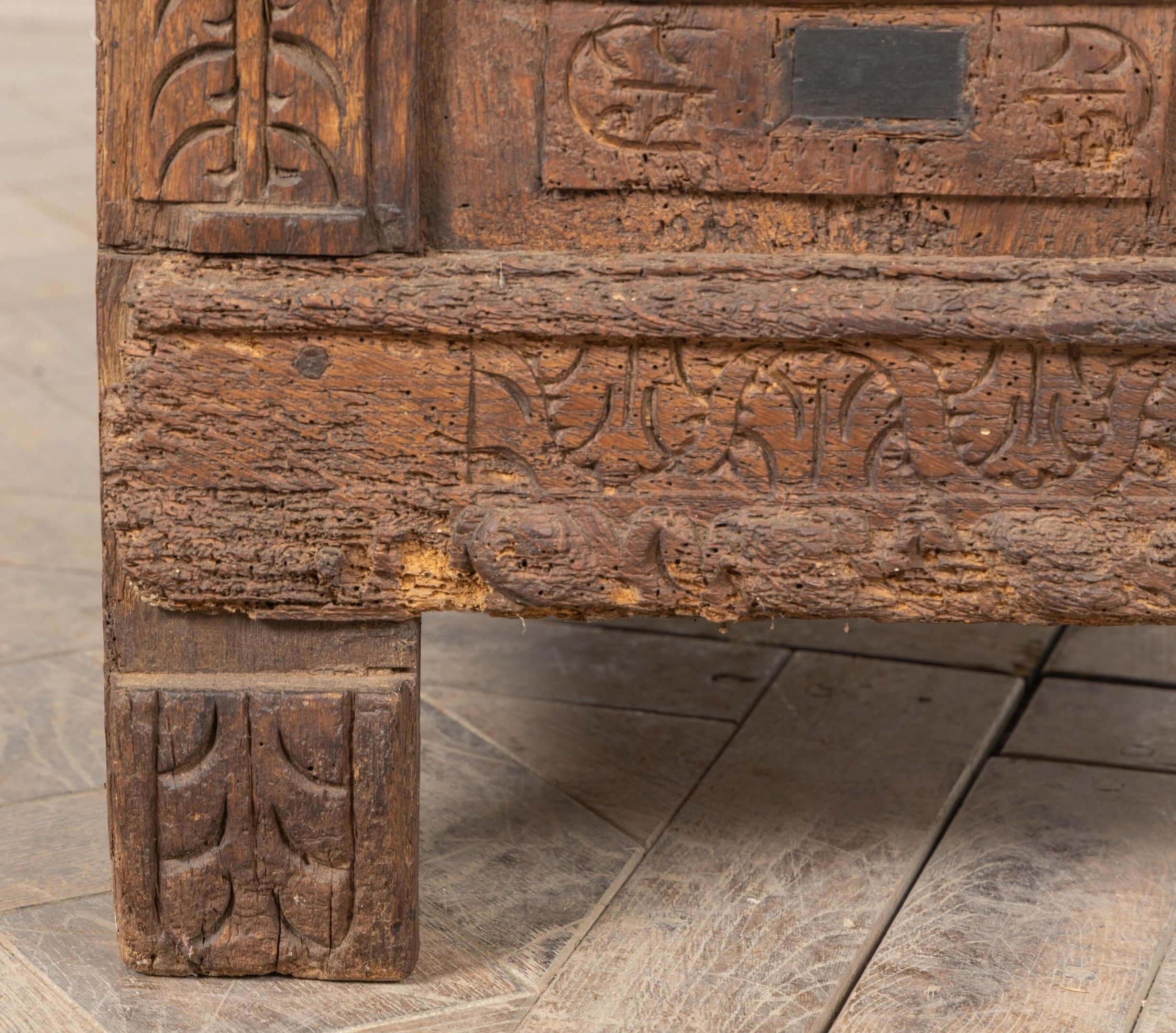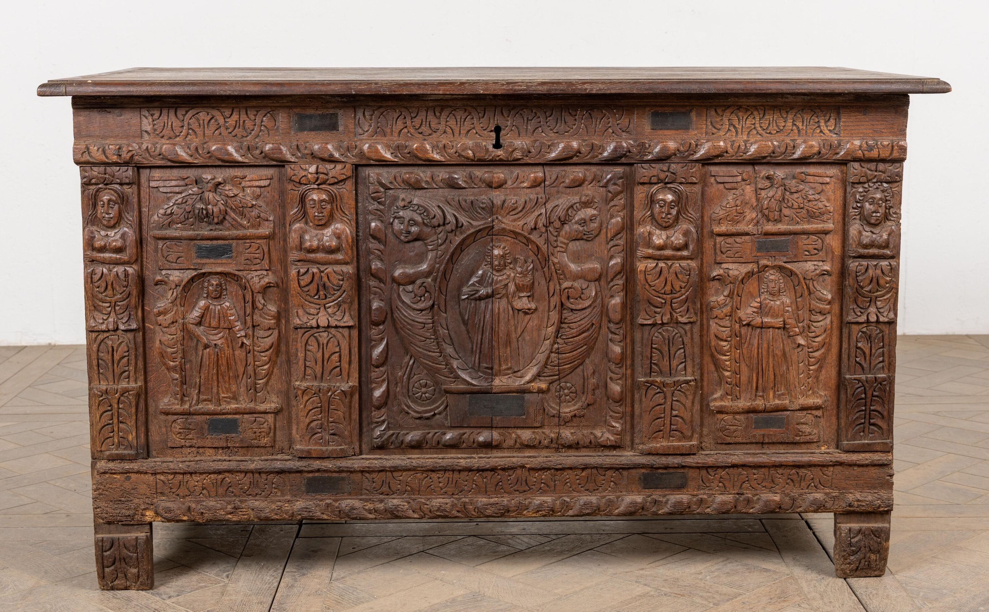 Desk consisting of an oak chest front richly carved with biblical figures and terms.