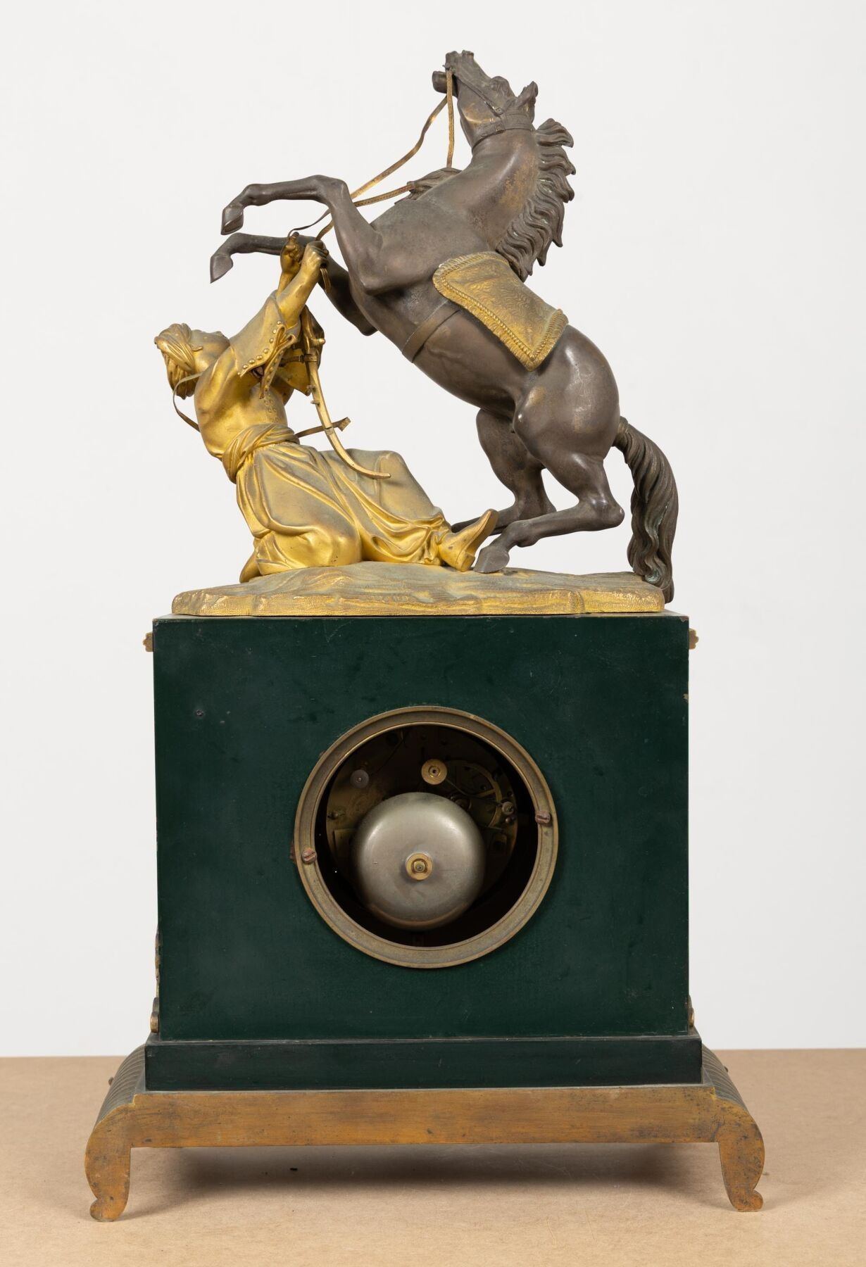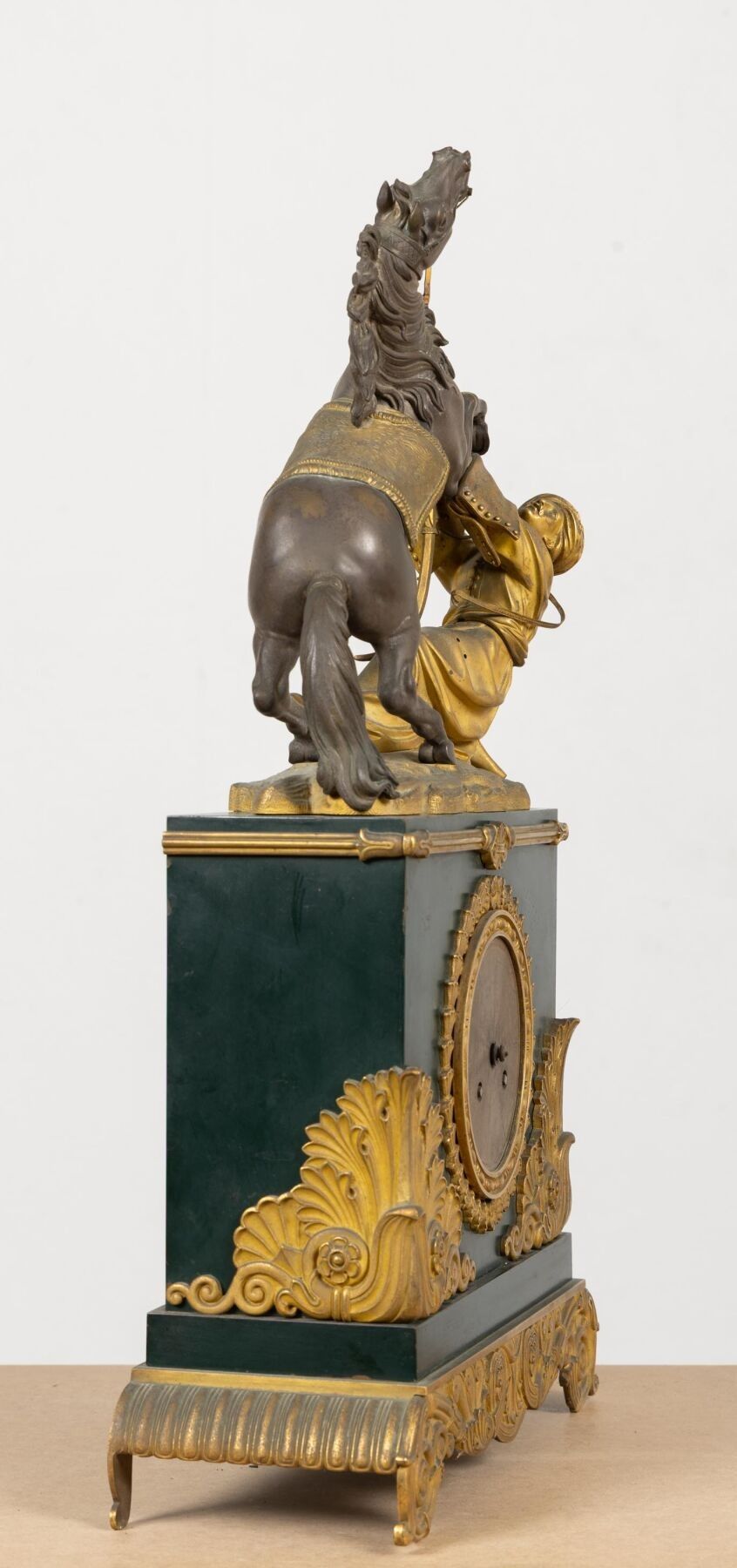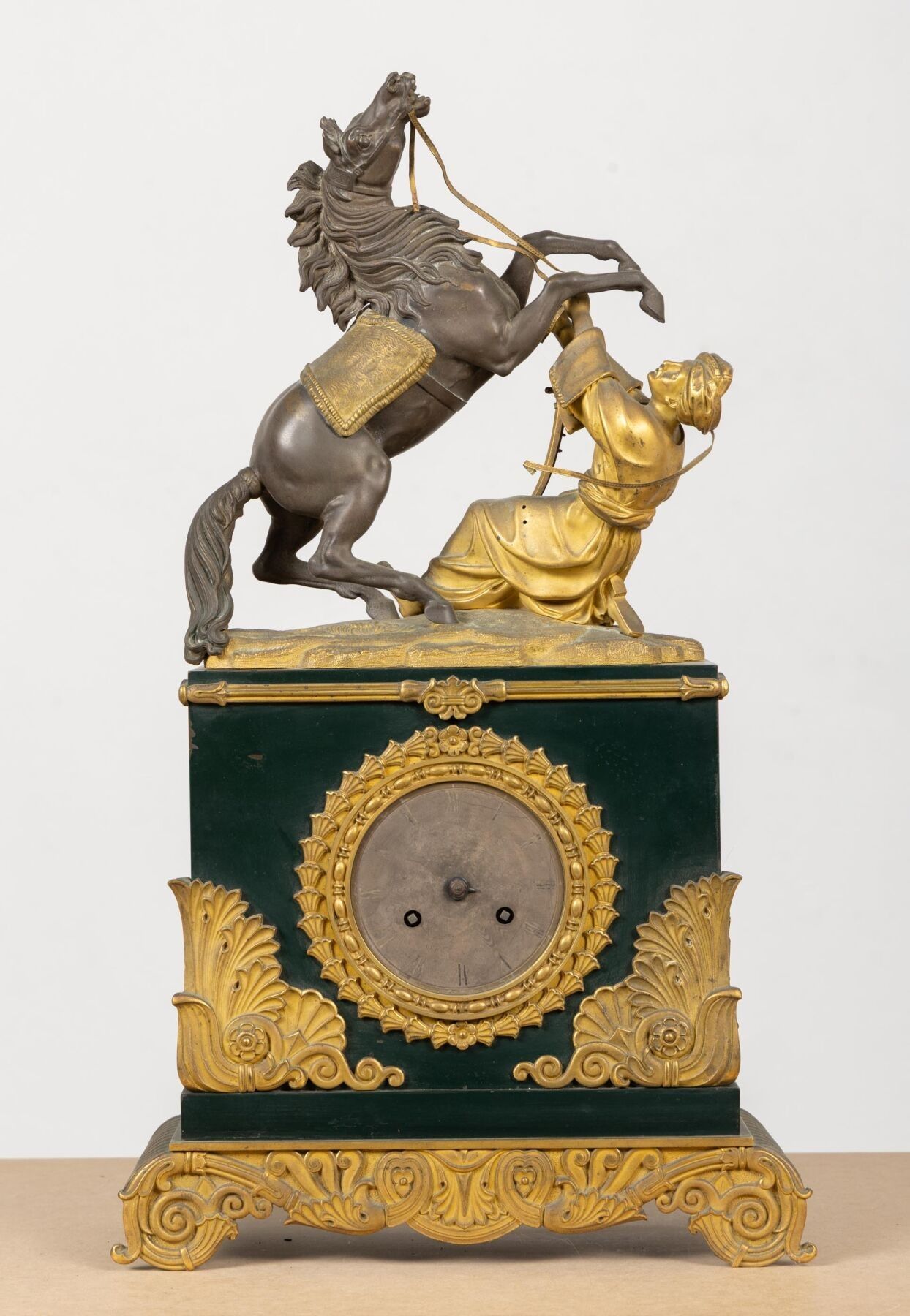 A gilt and patinated bronze clock depicting an Ottoman rider holding a prancing horse.