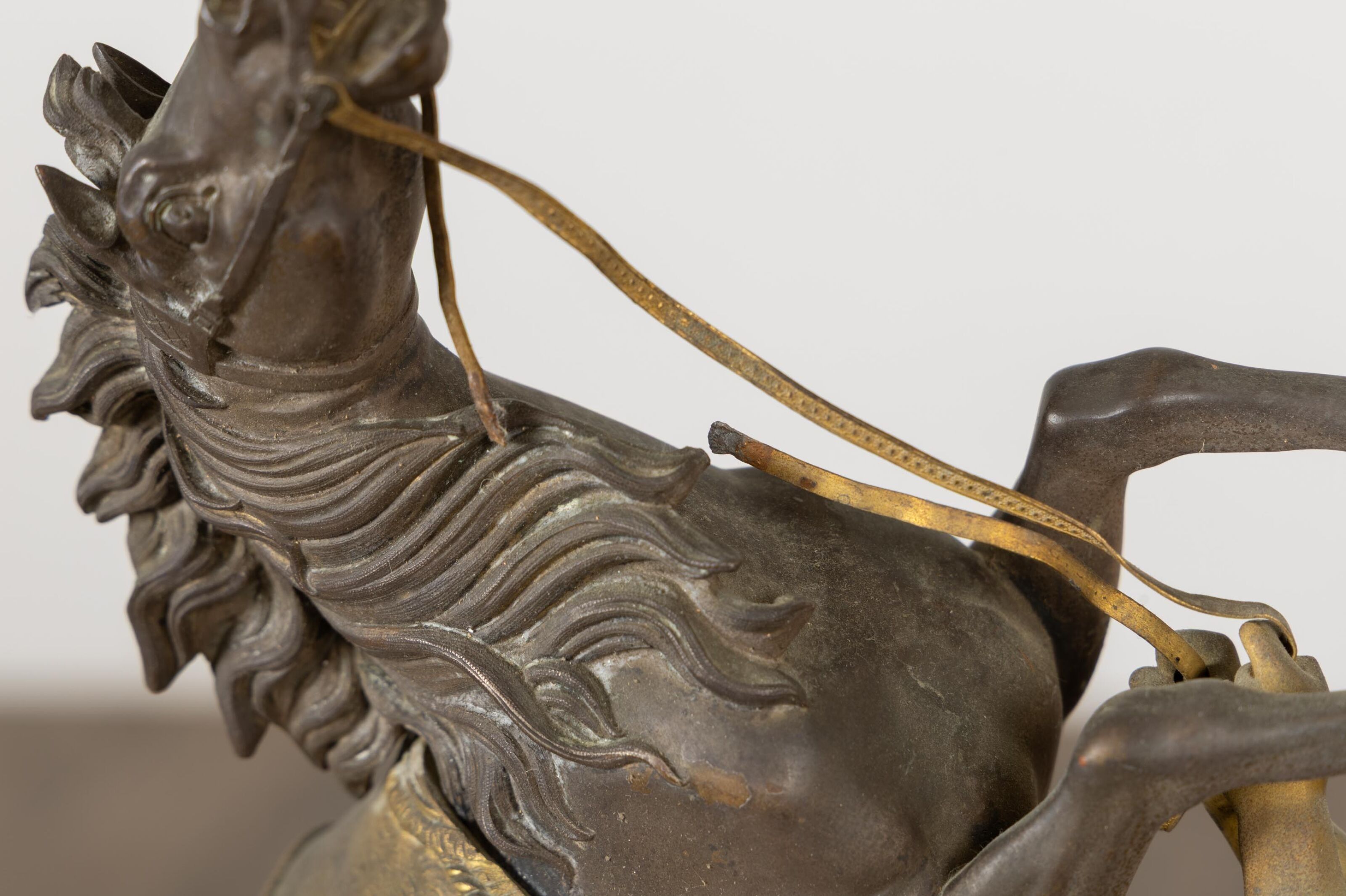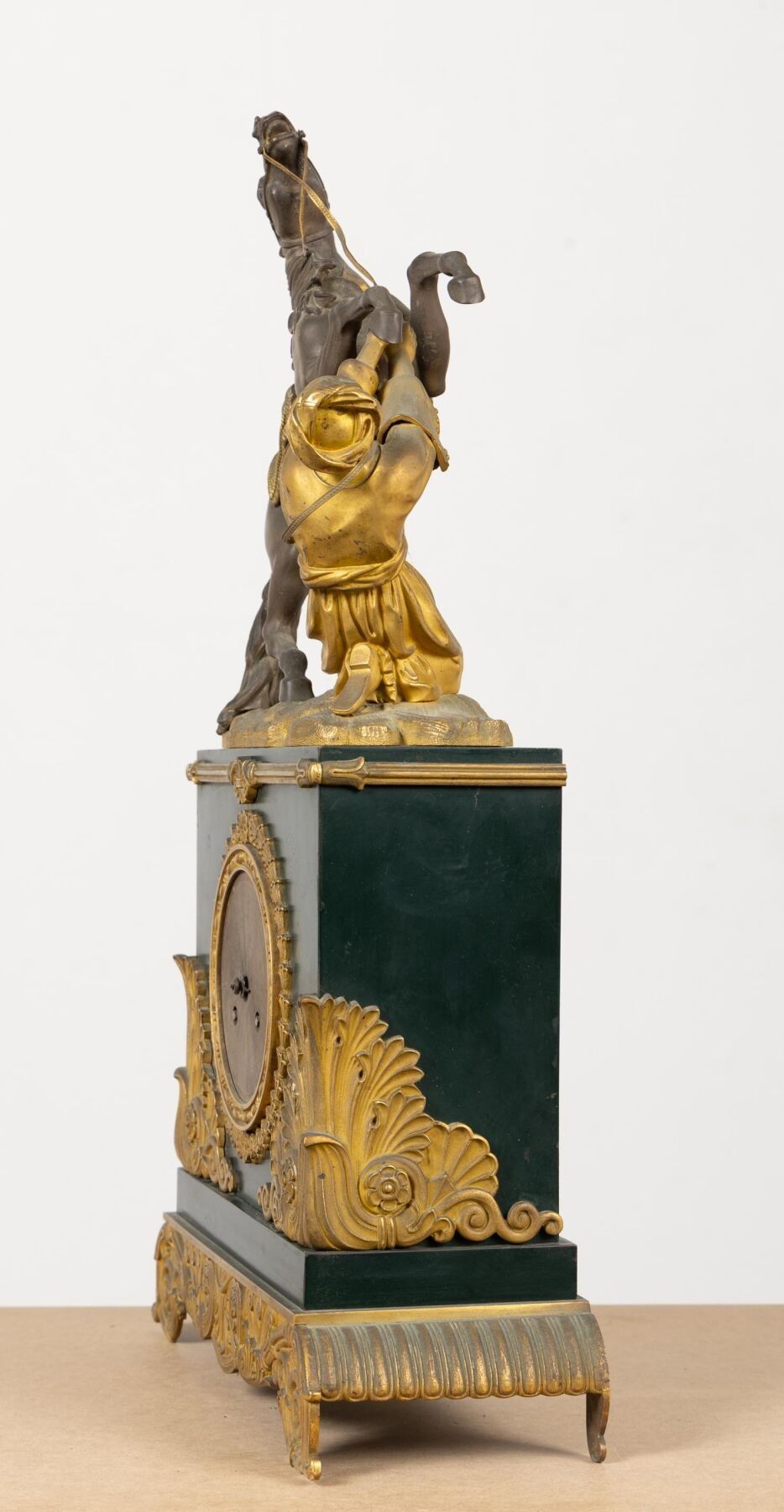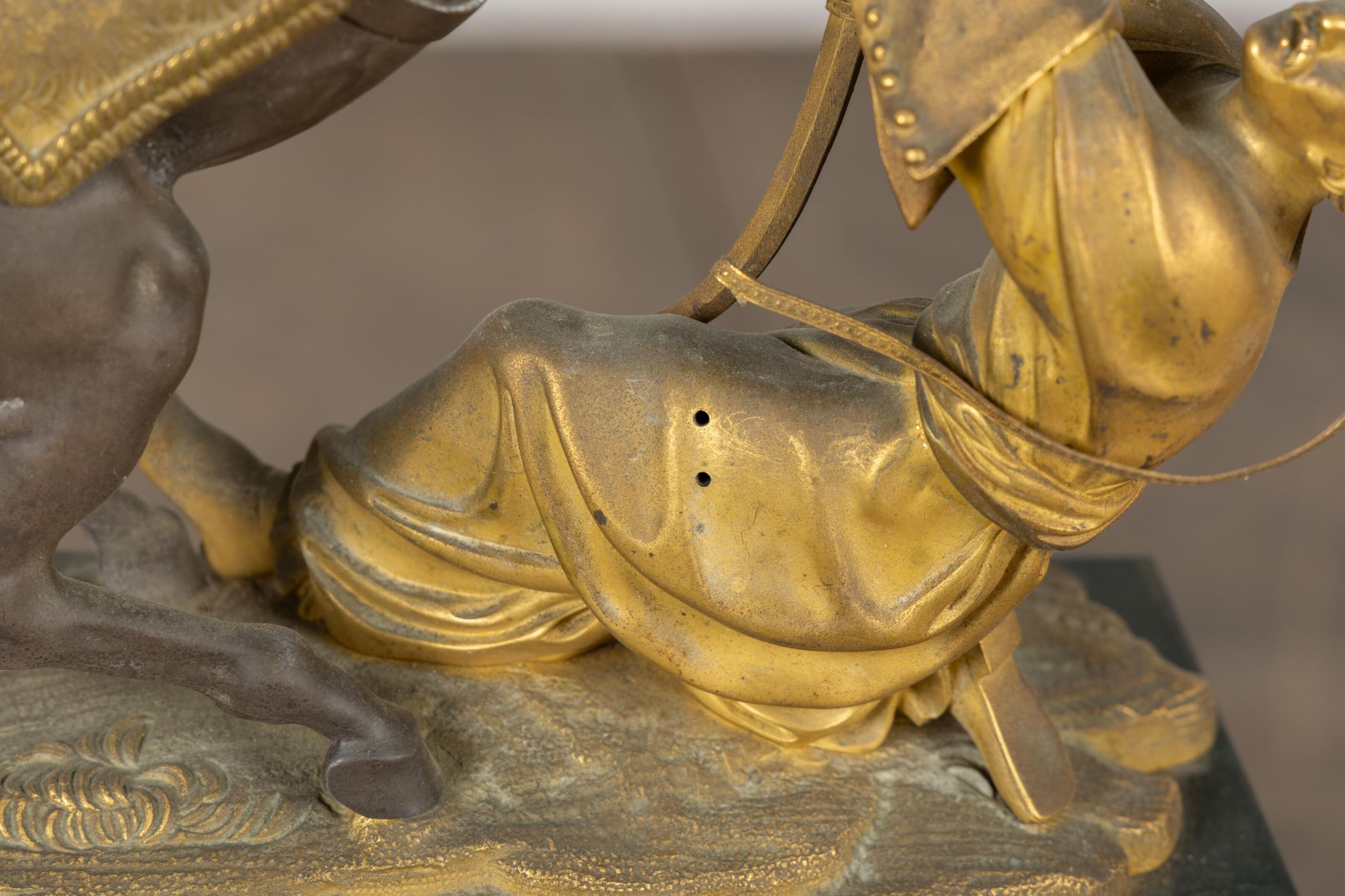 A gilt and patinated bronze clock depicting an Ottoman rider holding a prancing horse.