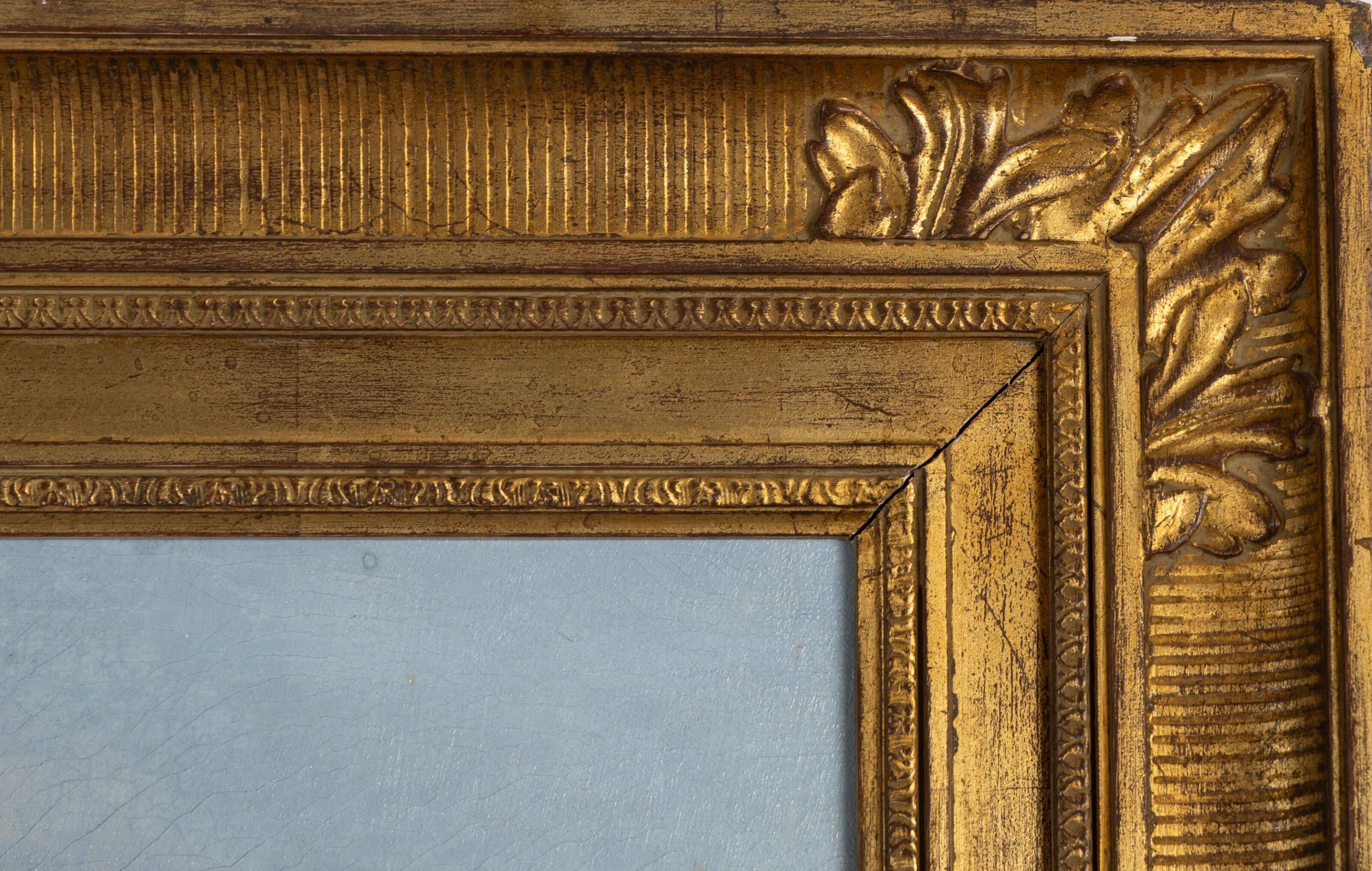 In a giltwood frame decorated with acanthus flutes and clasps.