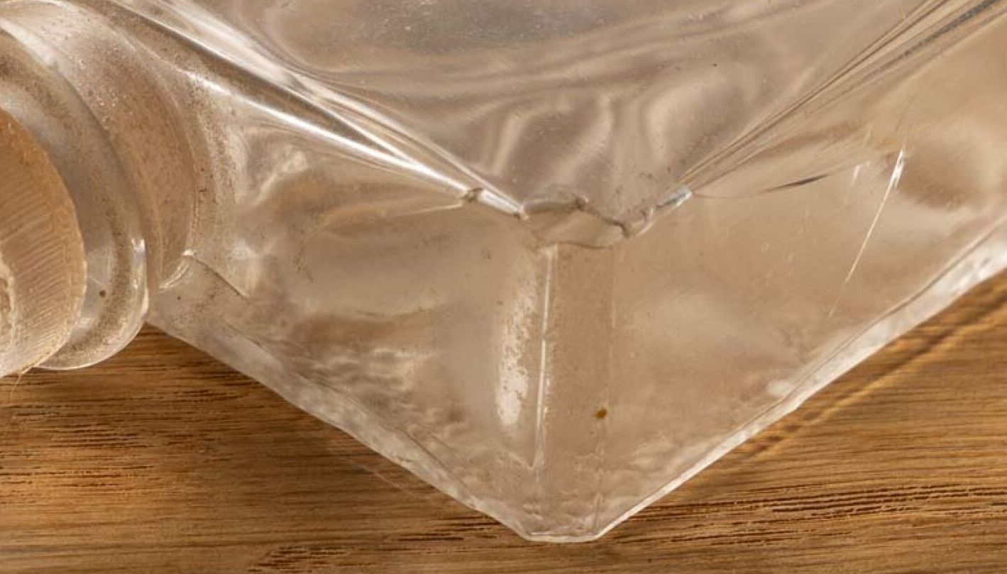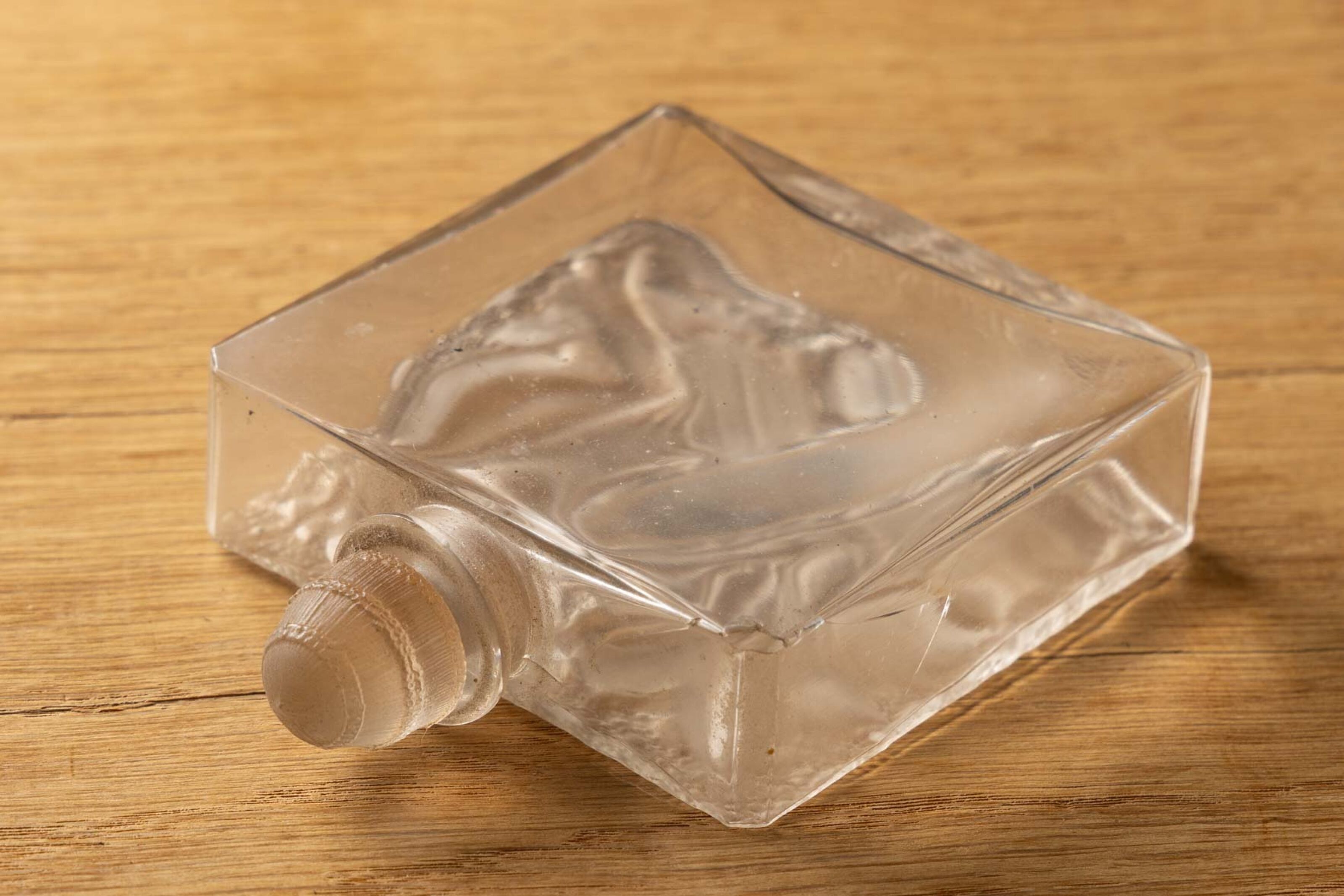 René LALIQUE. L'élégance. Pressed moulded glass perfume bottle. H_9,8 cm, corner accident
