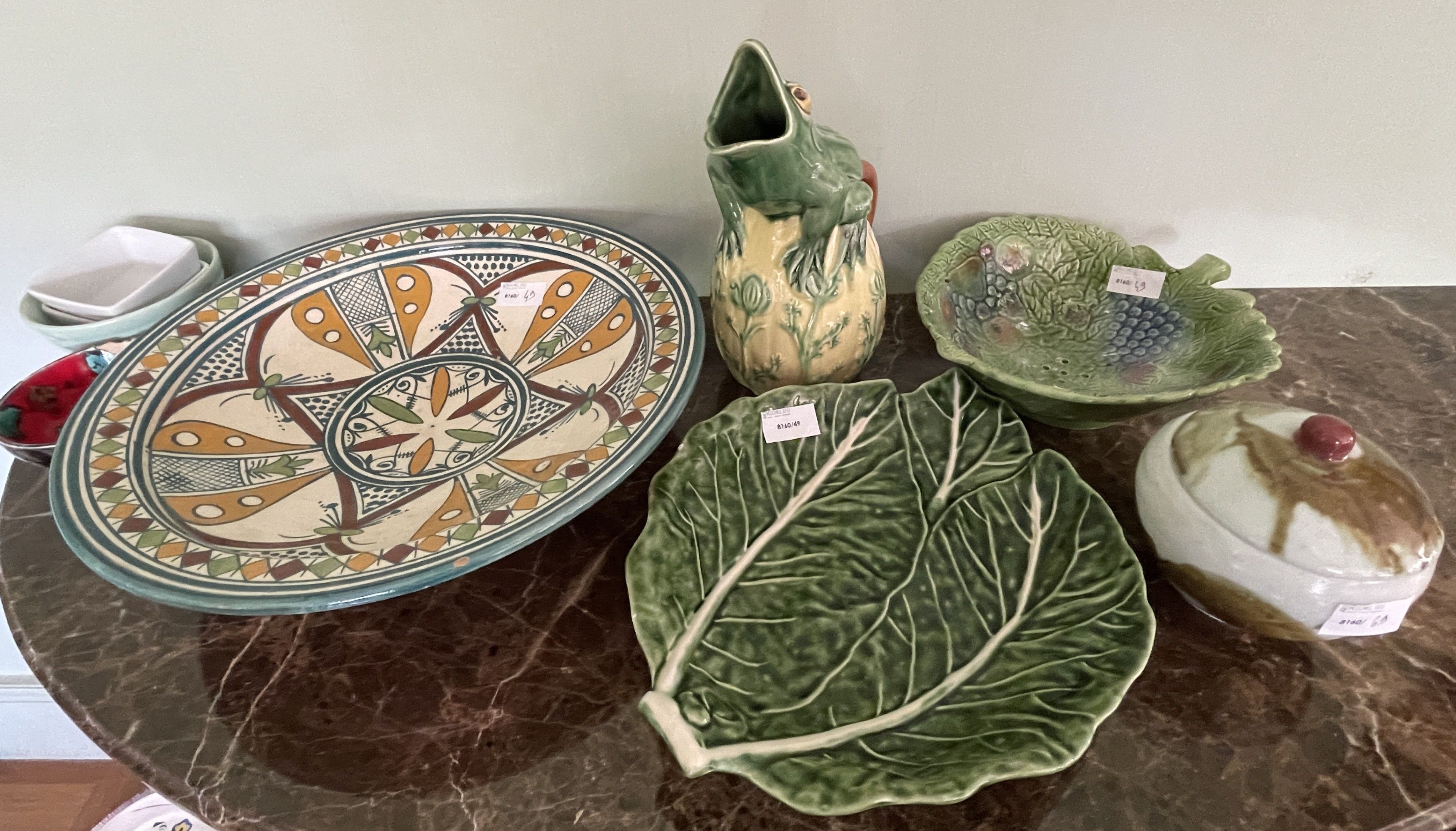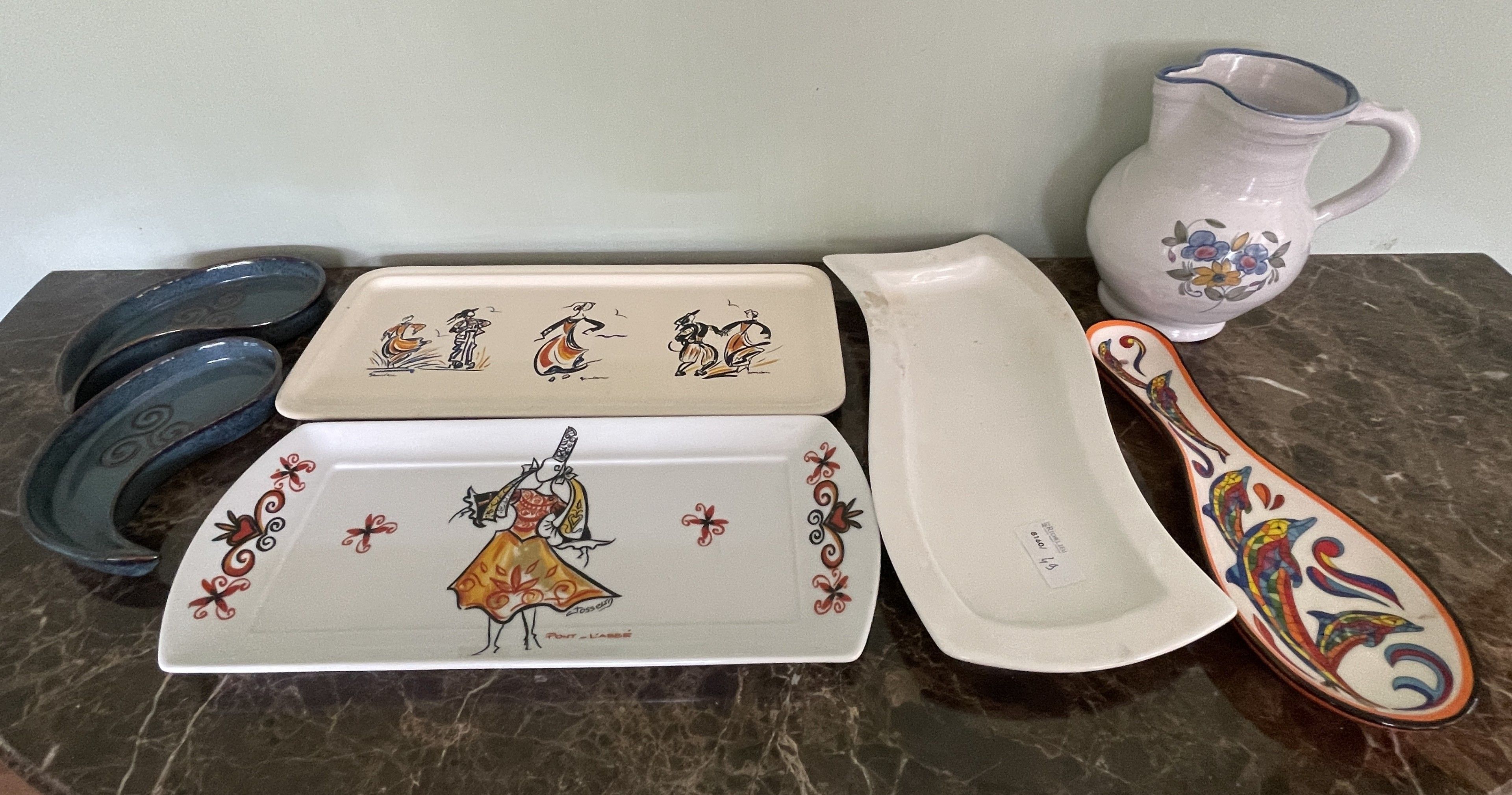 Batch of ceramics including a pitcher frog, a dish "sheet" (Portugal), a drainer with fruits, a round box, a dish, one joined two dishes with cake (Brittany), a pitcher, a empty pocket with decoration of dolphins (Spain)