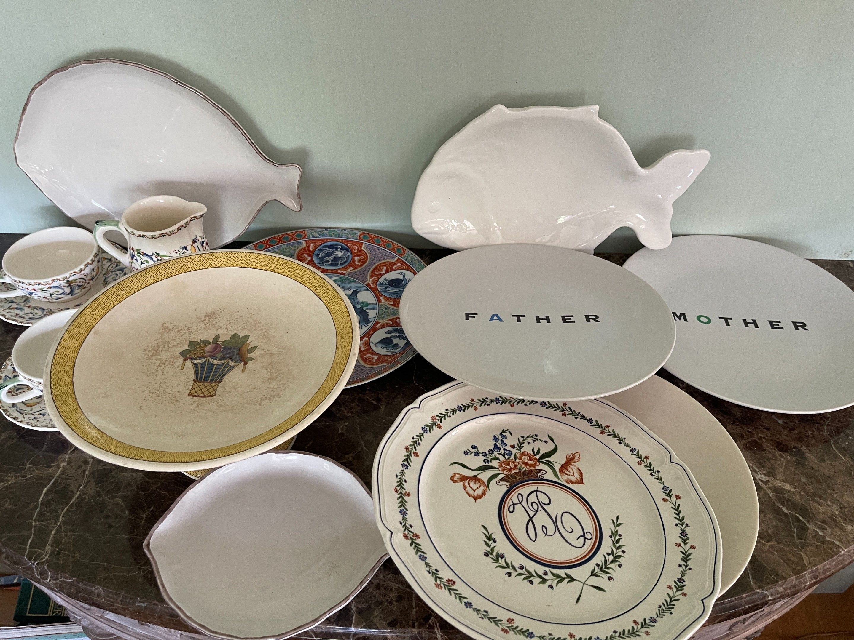 including a dish, a large plate, three Haviland plates with fluted wings; a soup tureen (chips on the lid); an uncovered sugar bowl; ten glass plates with fruit decorations. (some accidents), and miscellaneous (Gien)