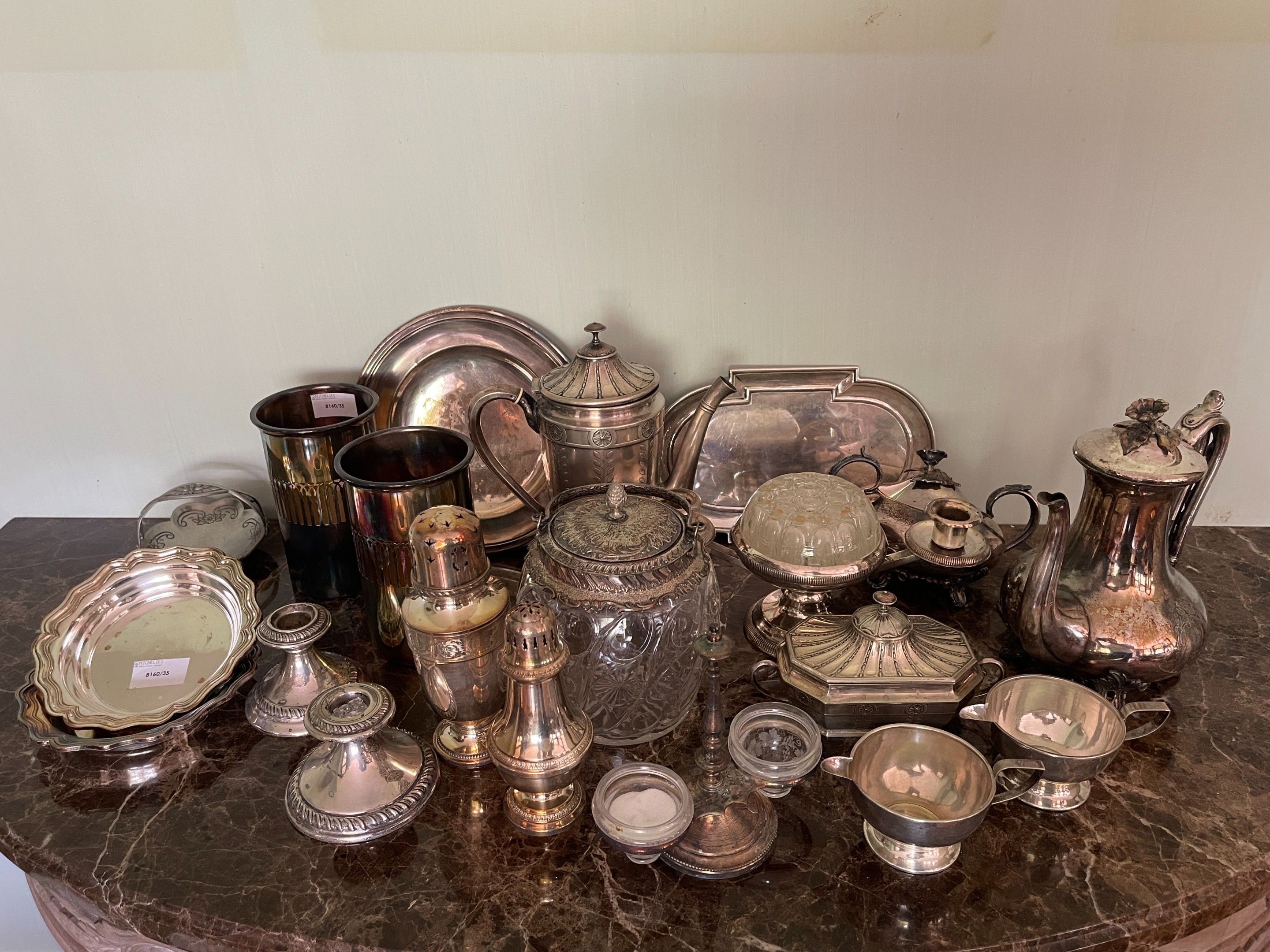 Mismatched metal lot comprising : two bottle stands, a teapot and a sugar bowl (one foot missing), two soup tureens, a glass biscuit bucket, a bouquetière-bougeoir, a sugar bowl with two handles, a pair of small candle holders, a double saleron, two small pouring cups, a pair of coasters, a plate and a small tray TO BE TAKEN IN GENNEVILLIERS