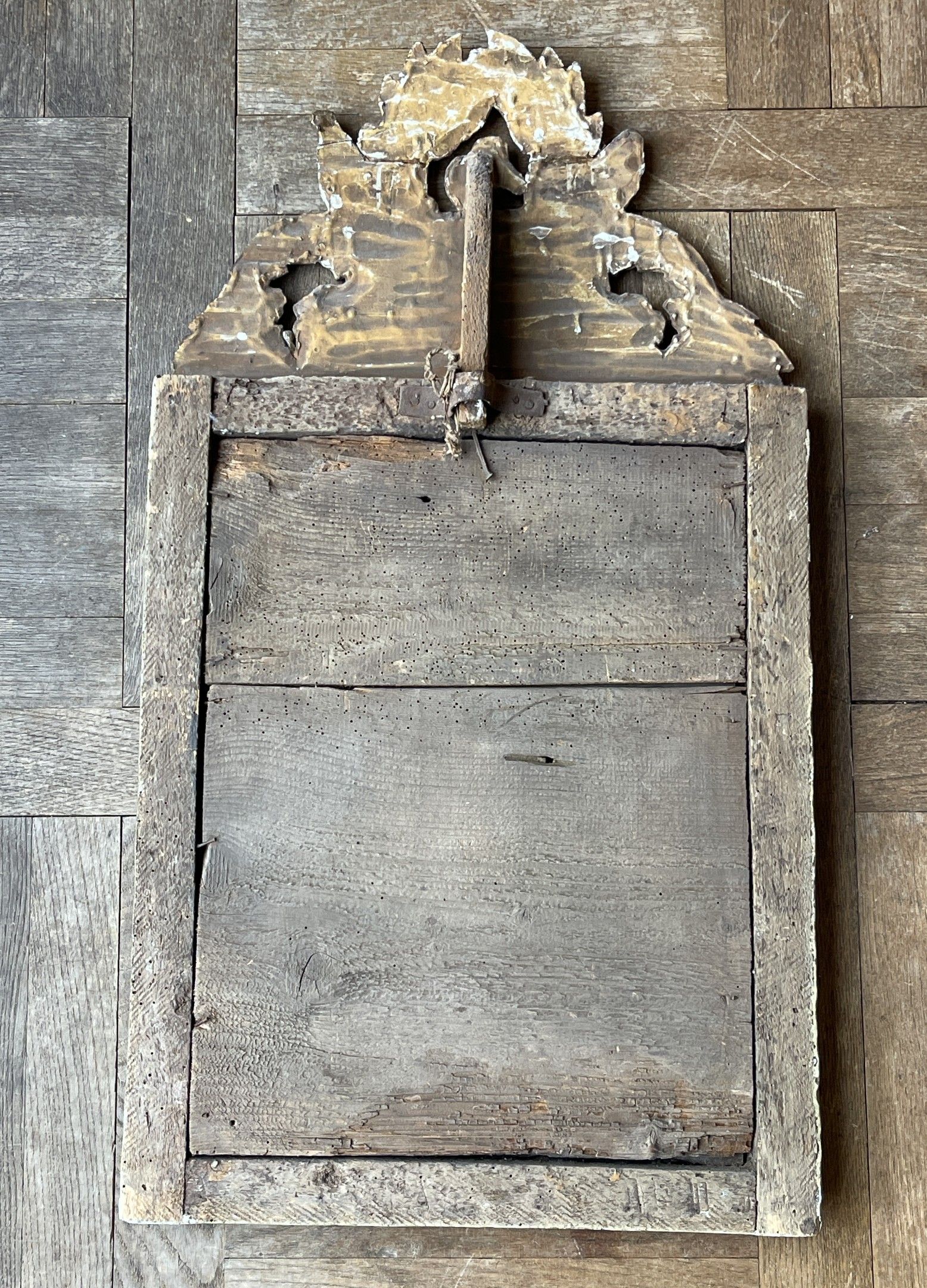 Mirror, gilded wood frame with pediment decorated with a Phrigian cap, quiver, laurel wreath and scrolls of foliage in bloom, traces of polychromy