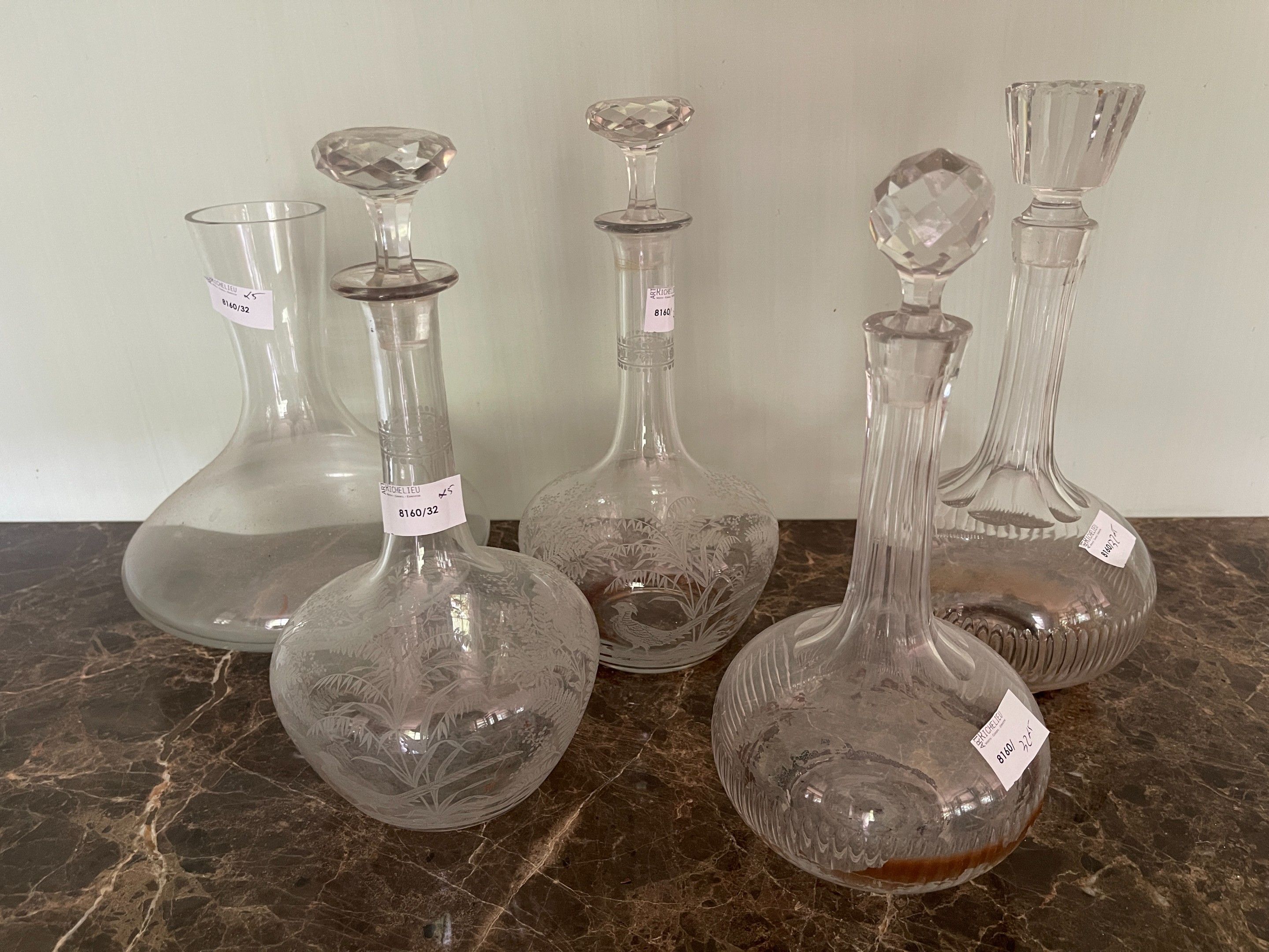 Set of glass decanters including a pair of carved glass deca…