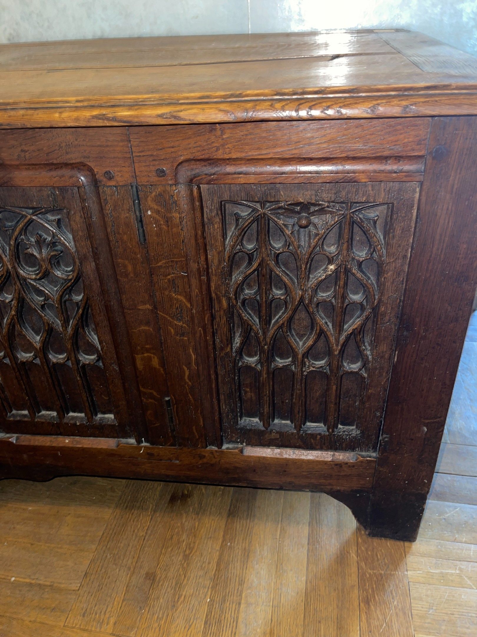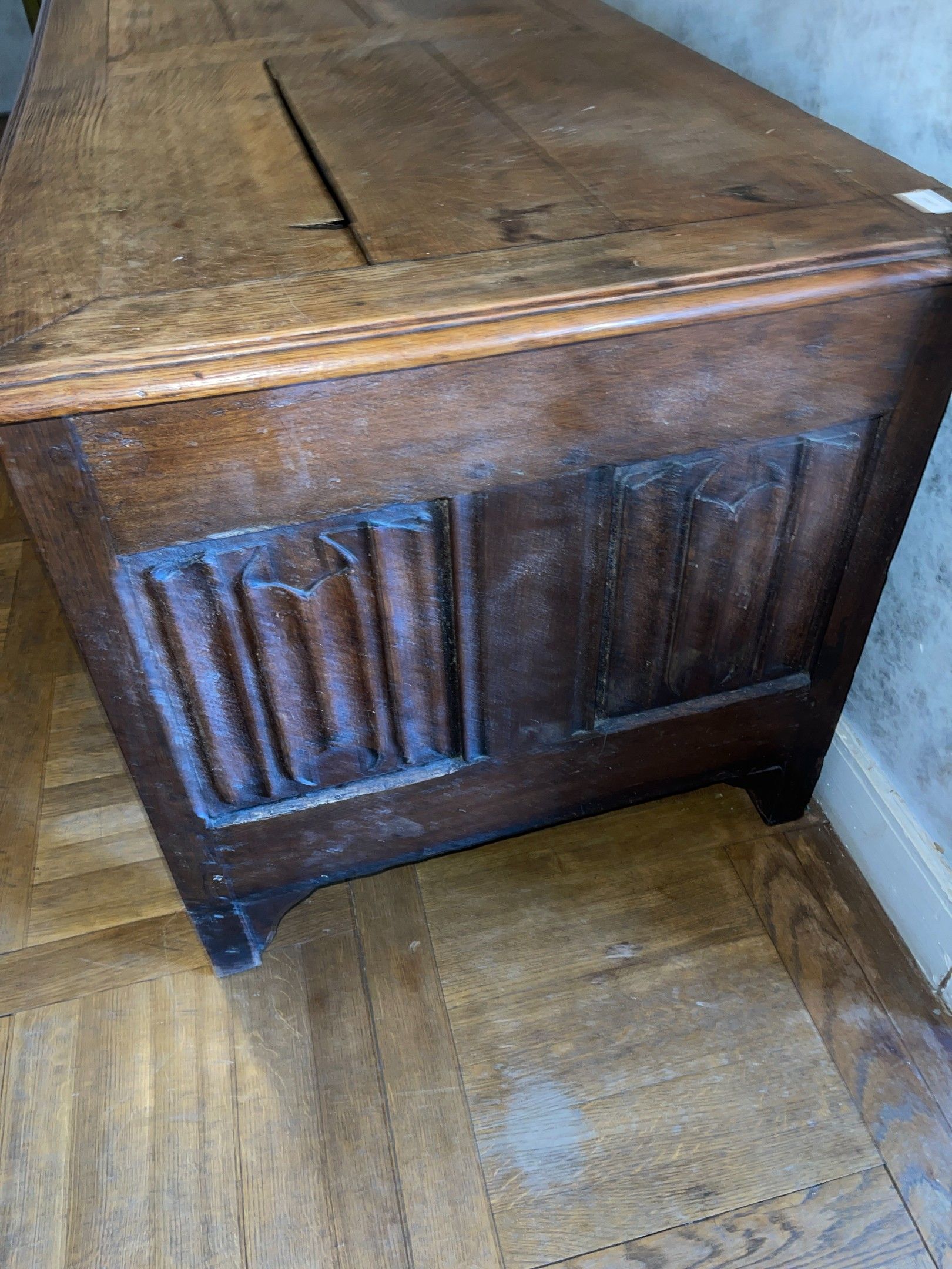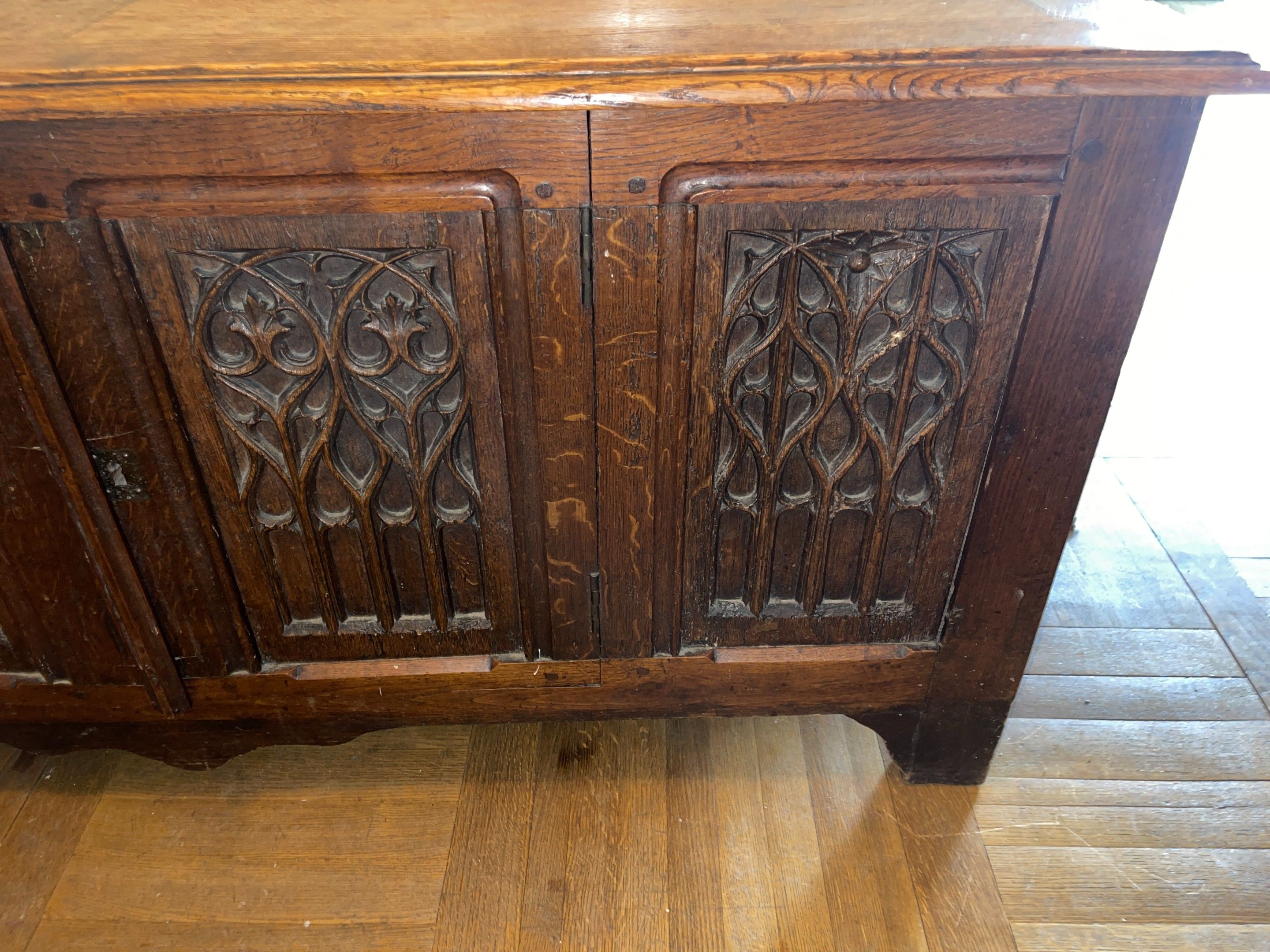 Decorated moulded and carved natural oak chest, opening to two doors.