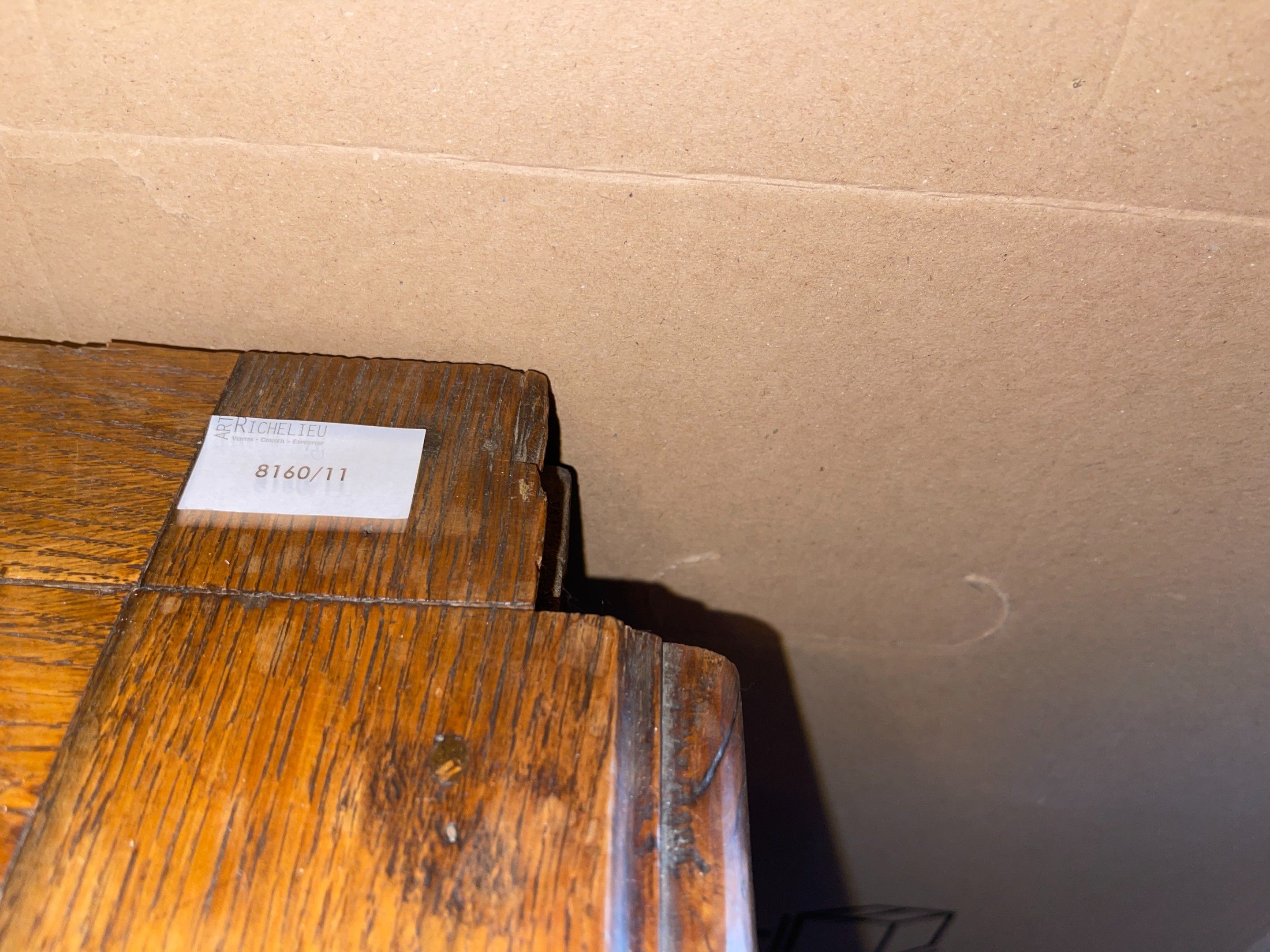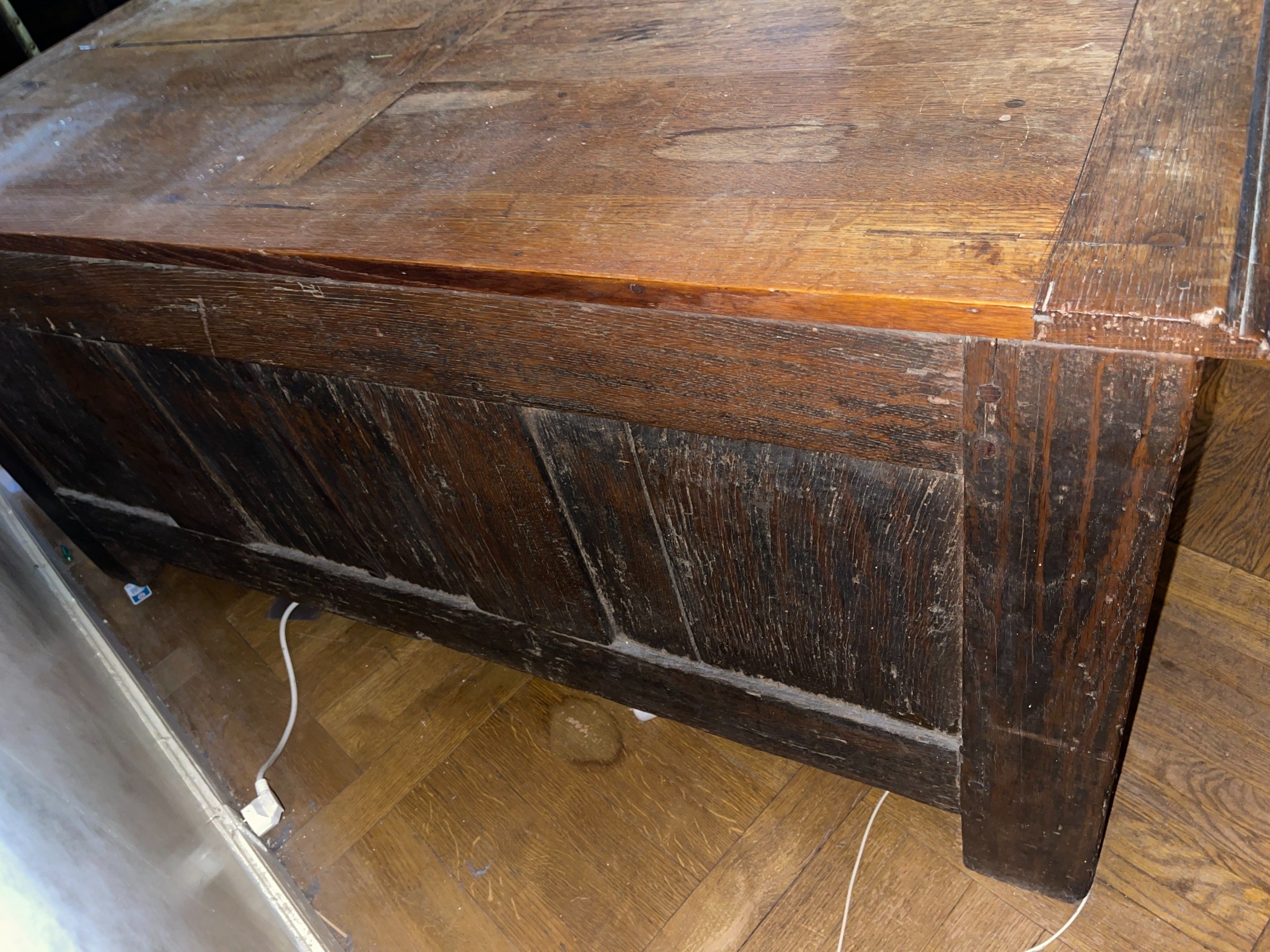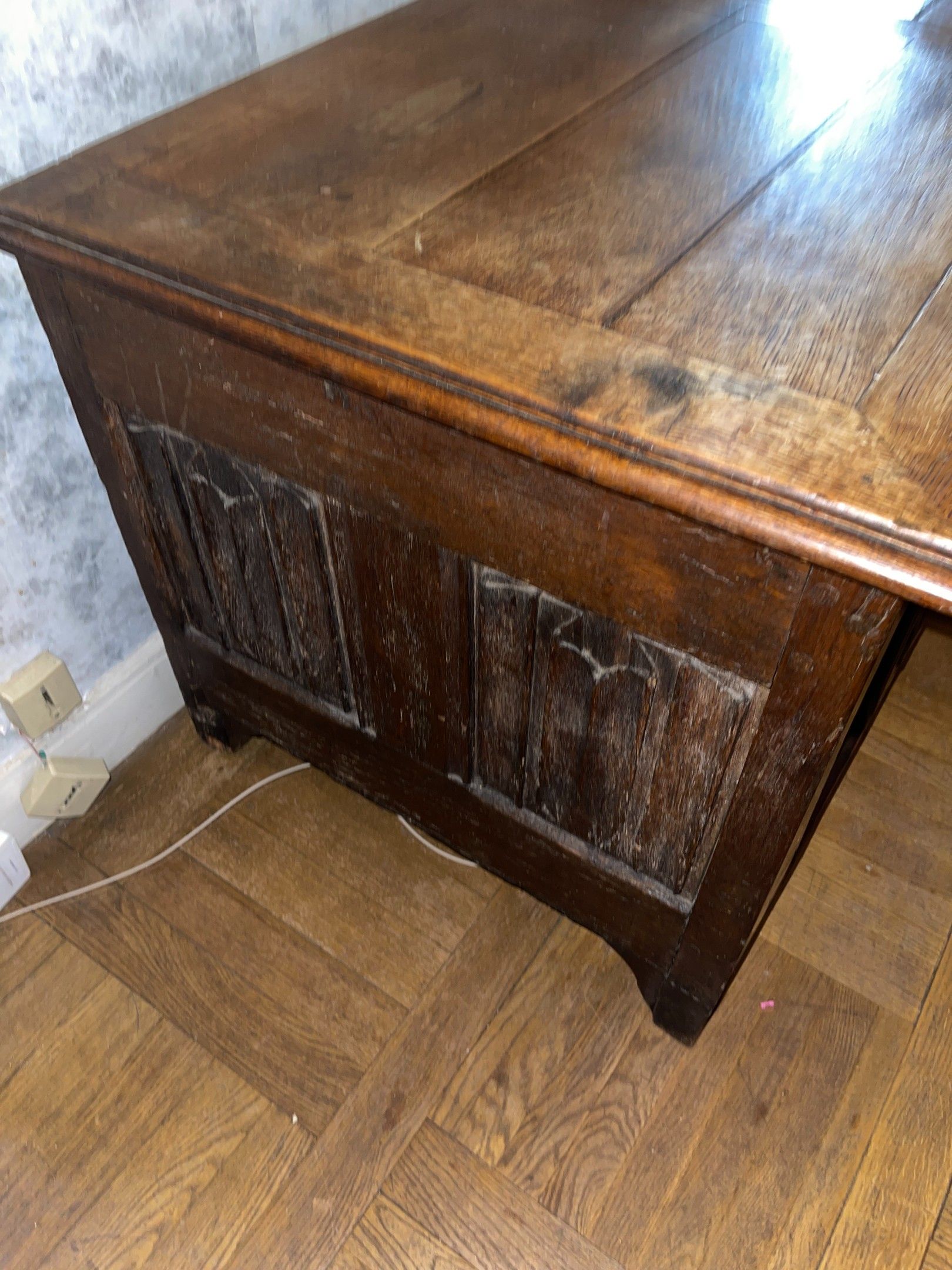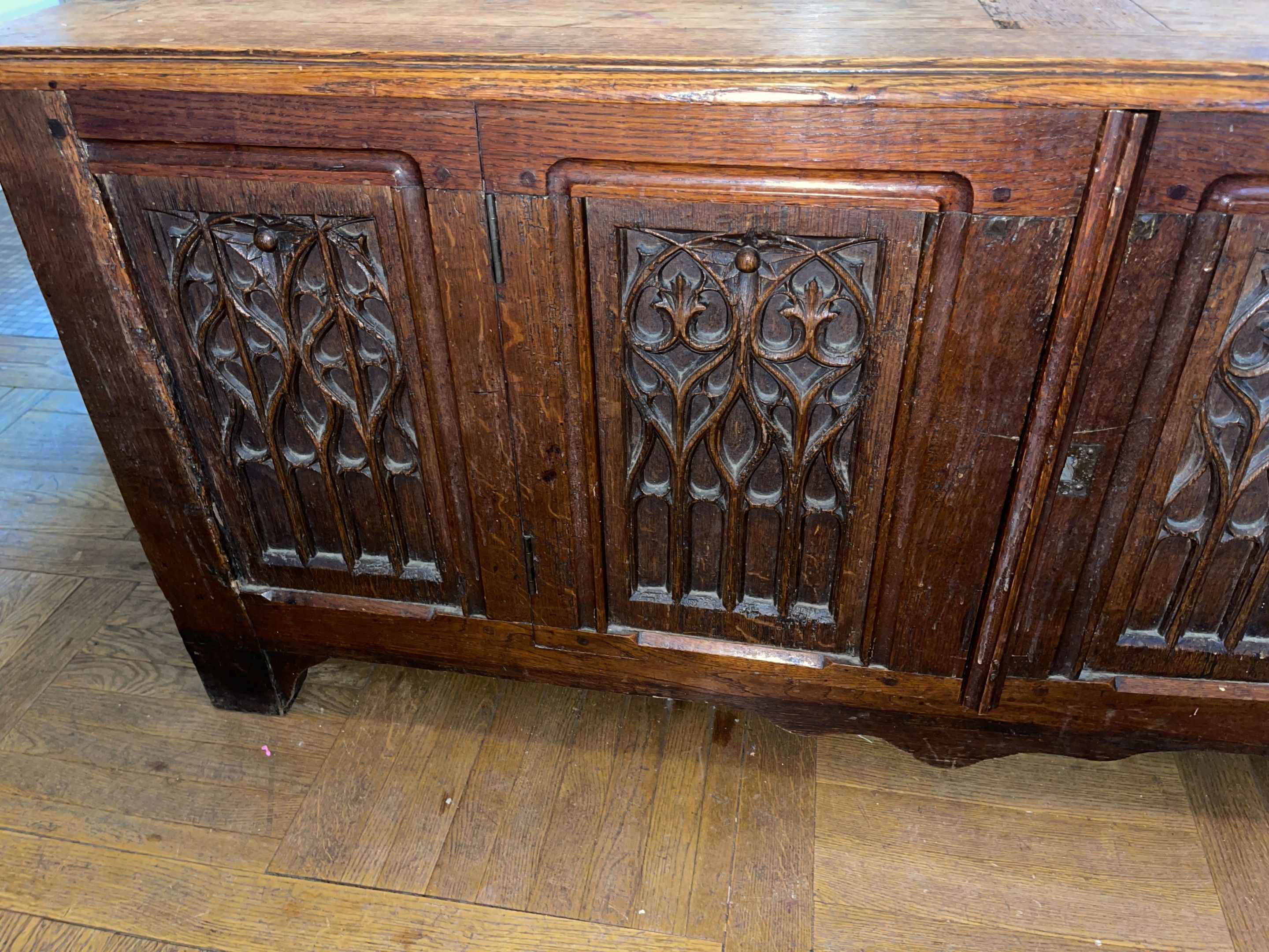 Decorated moulded and carved natural oak chest, opening to two doors.