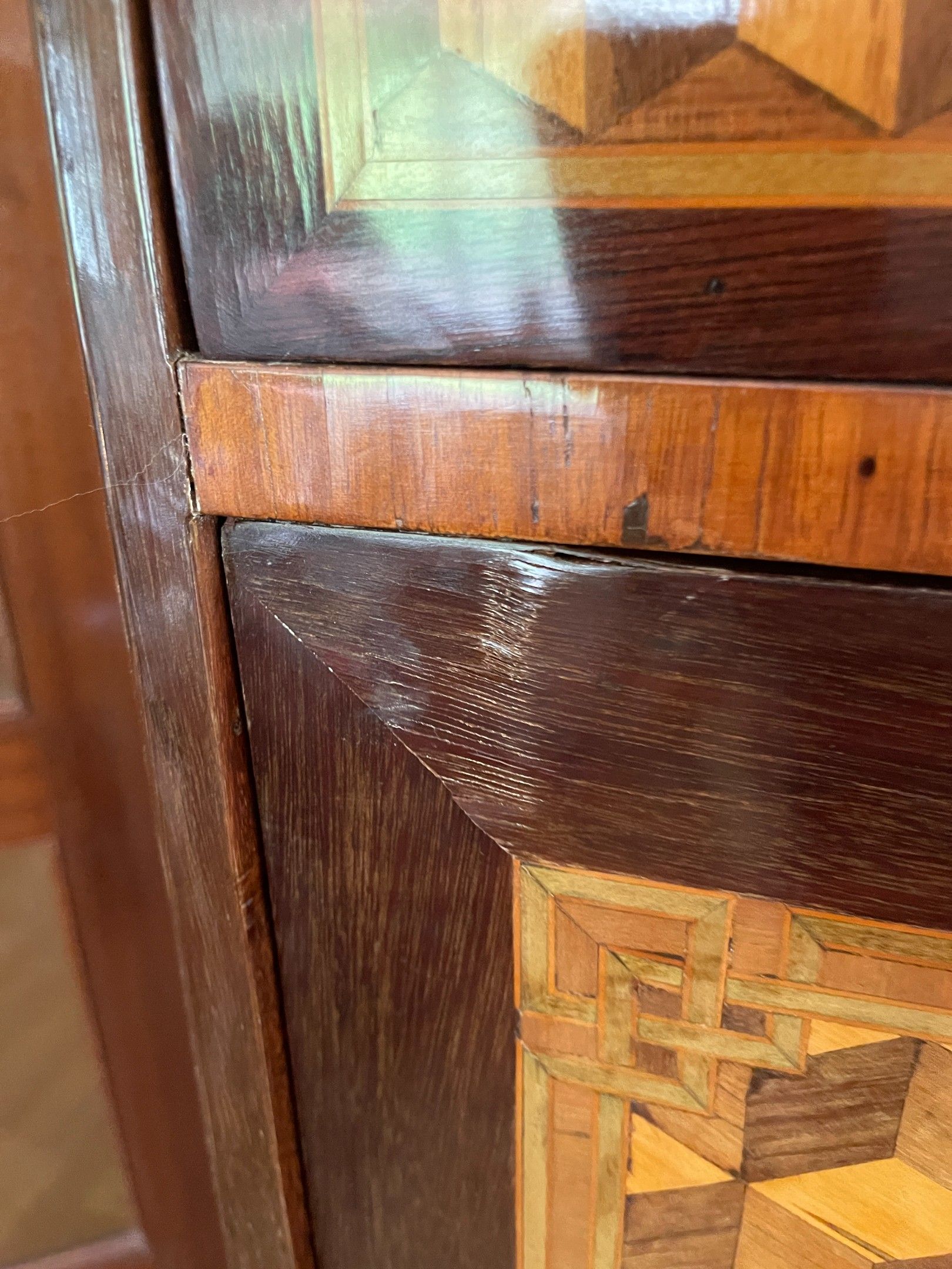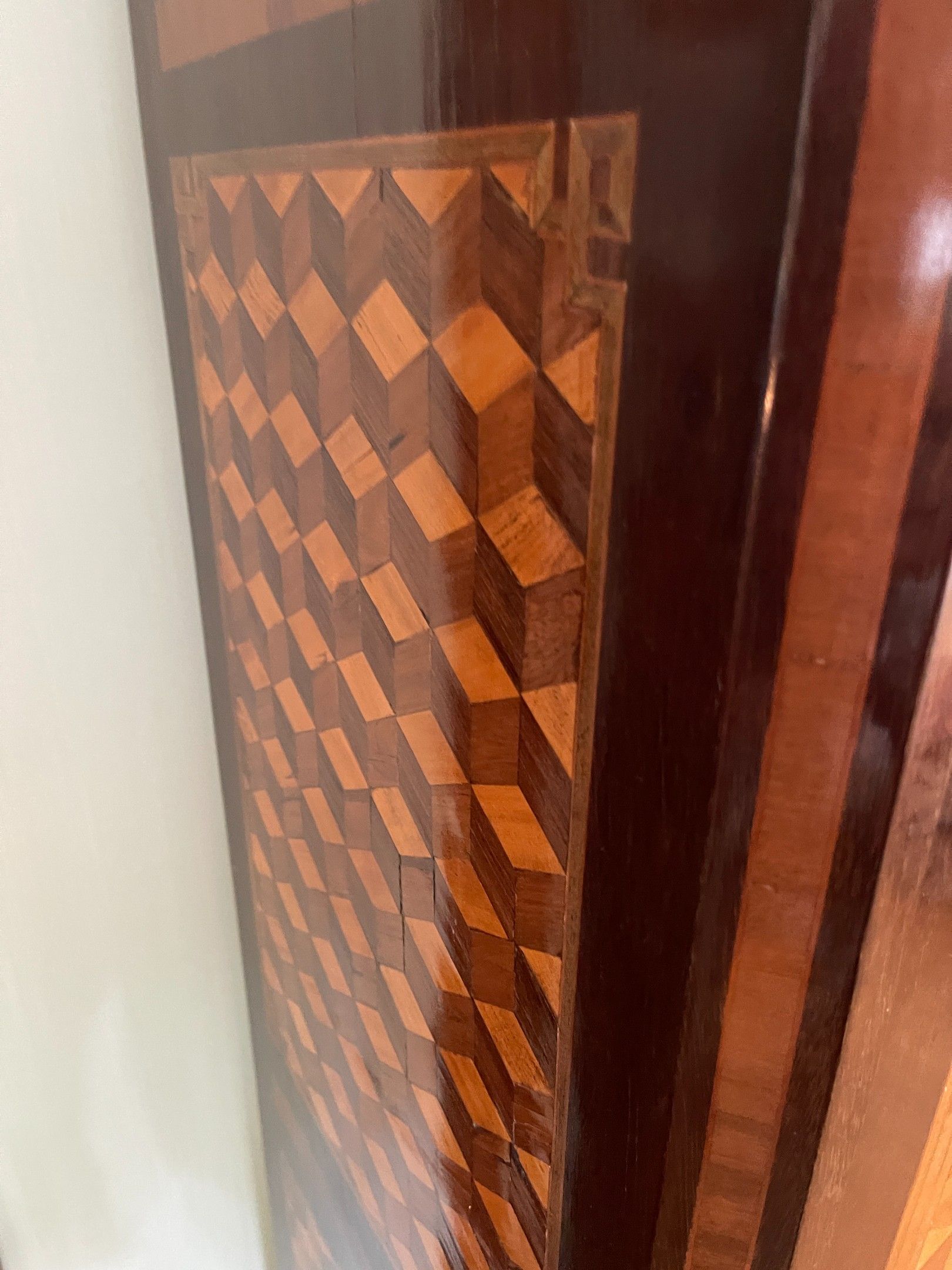 Wood veneer and cube marquetry flap desk, opening in the upp…