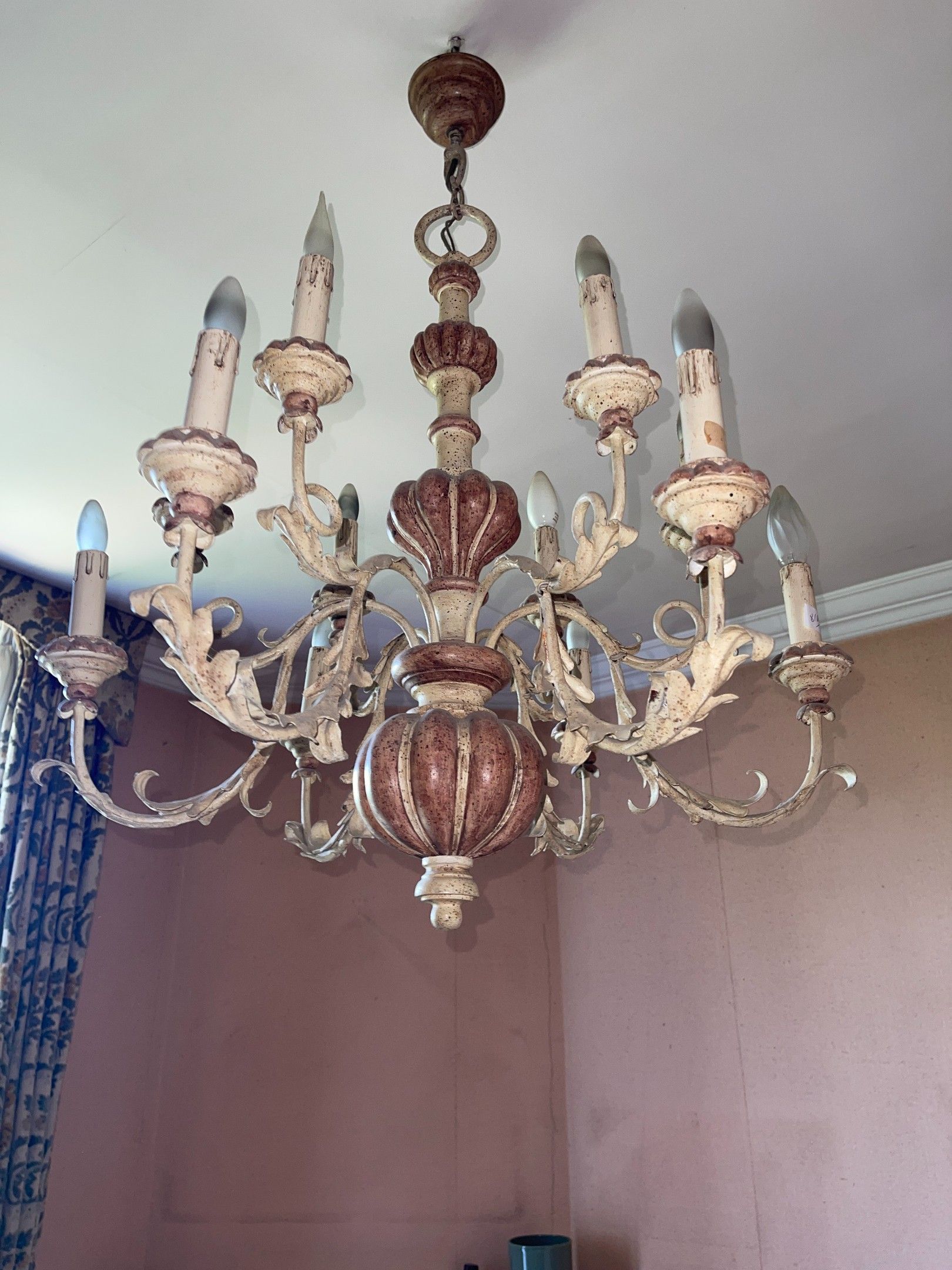 Wood and metal chandelier with twelve lights in two rows