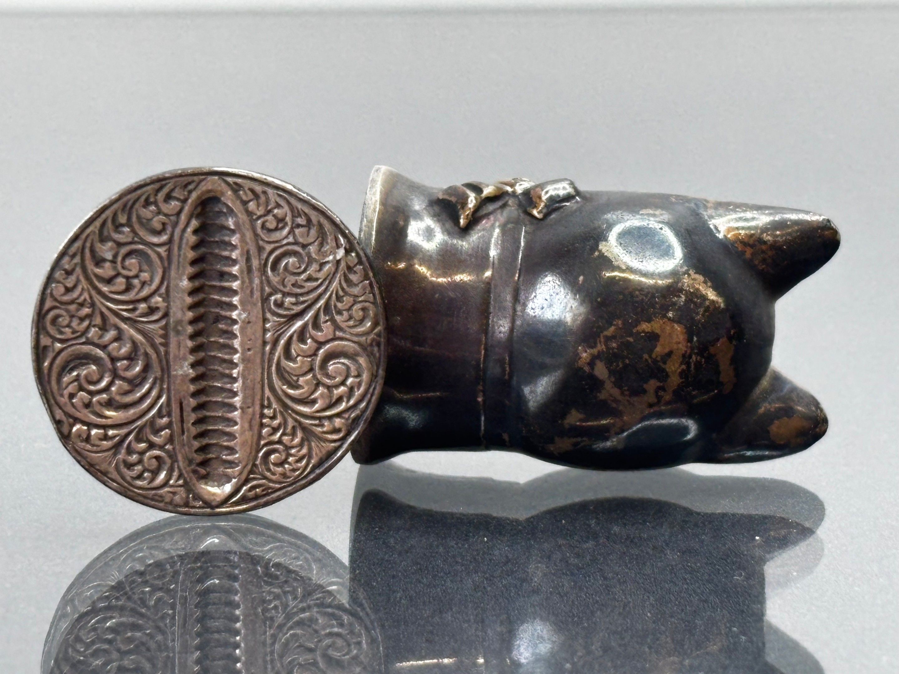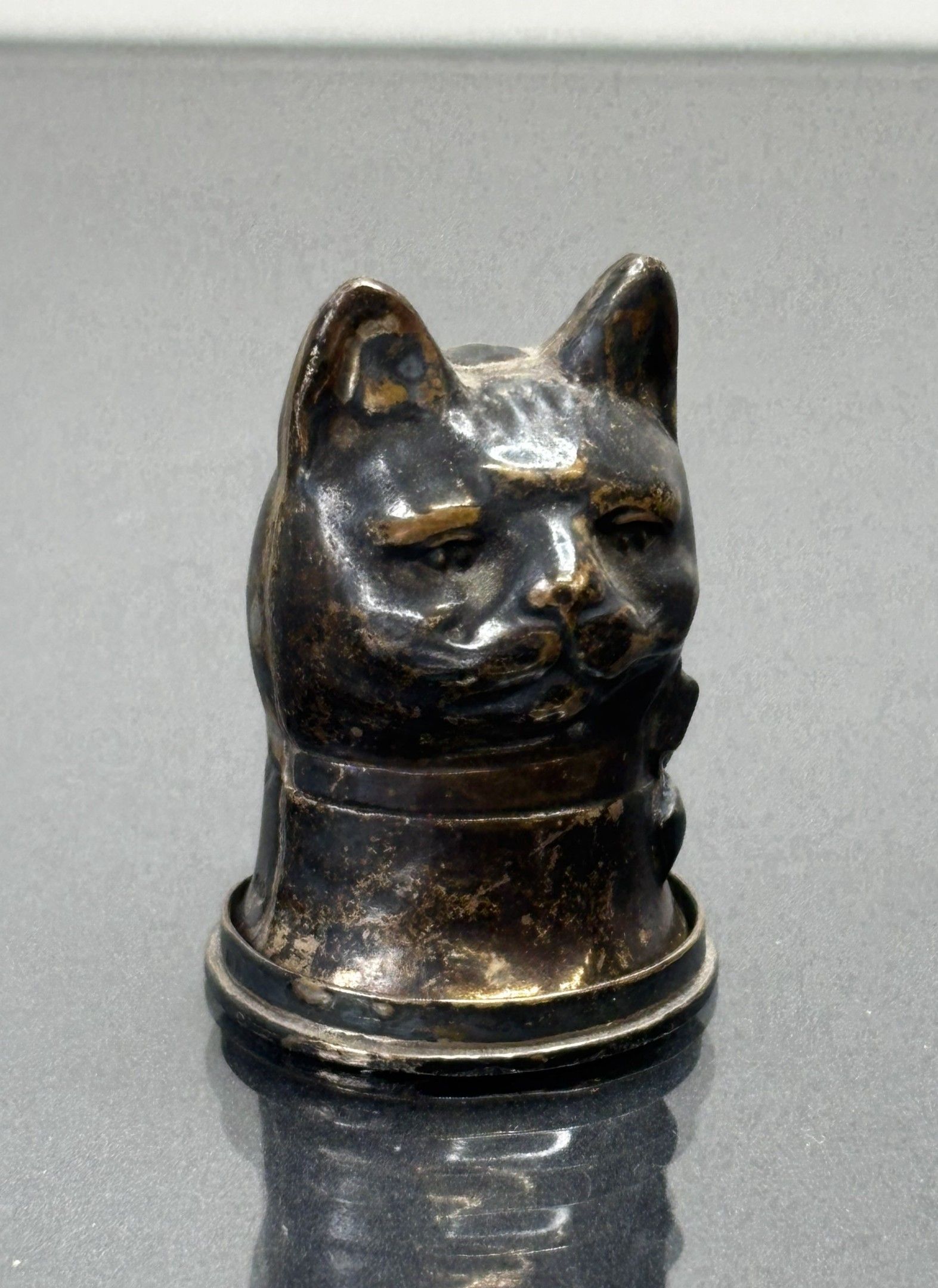 Silver-plated match box in the shape of a cat's head