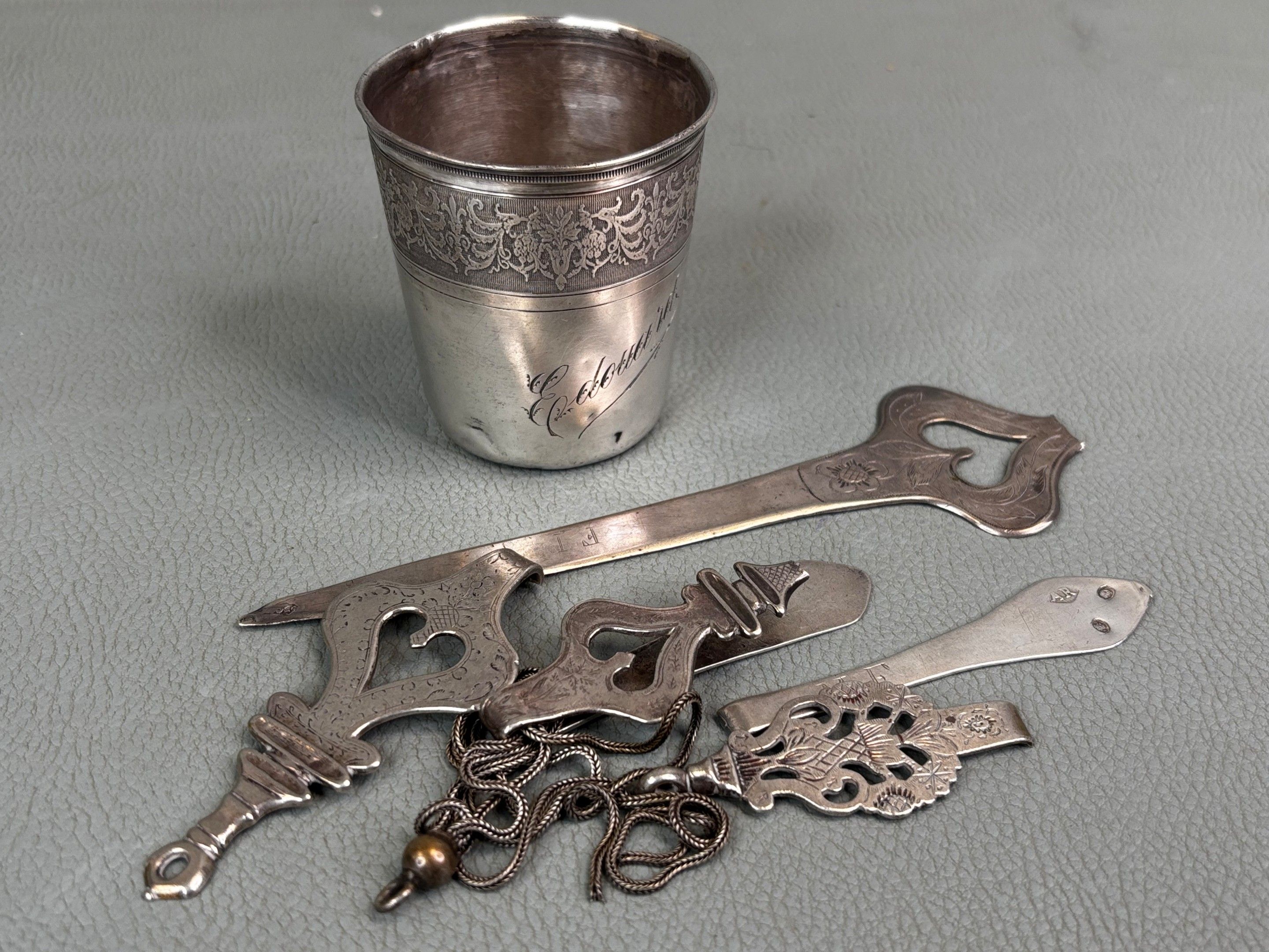 LOT: silver kettledrum, fragments of chatelaine hooks