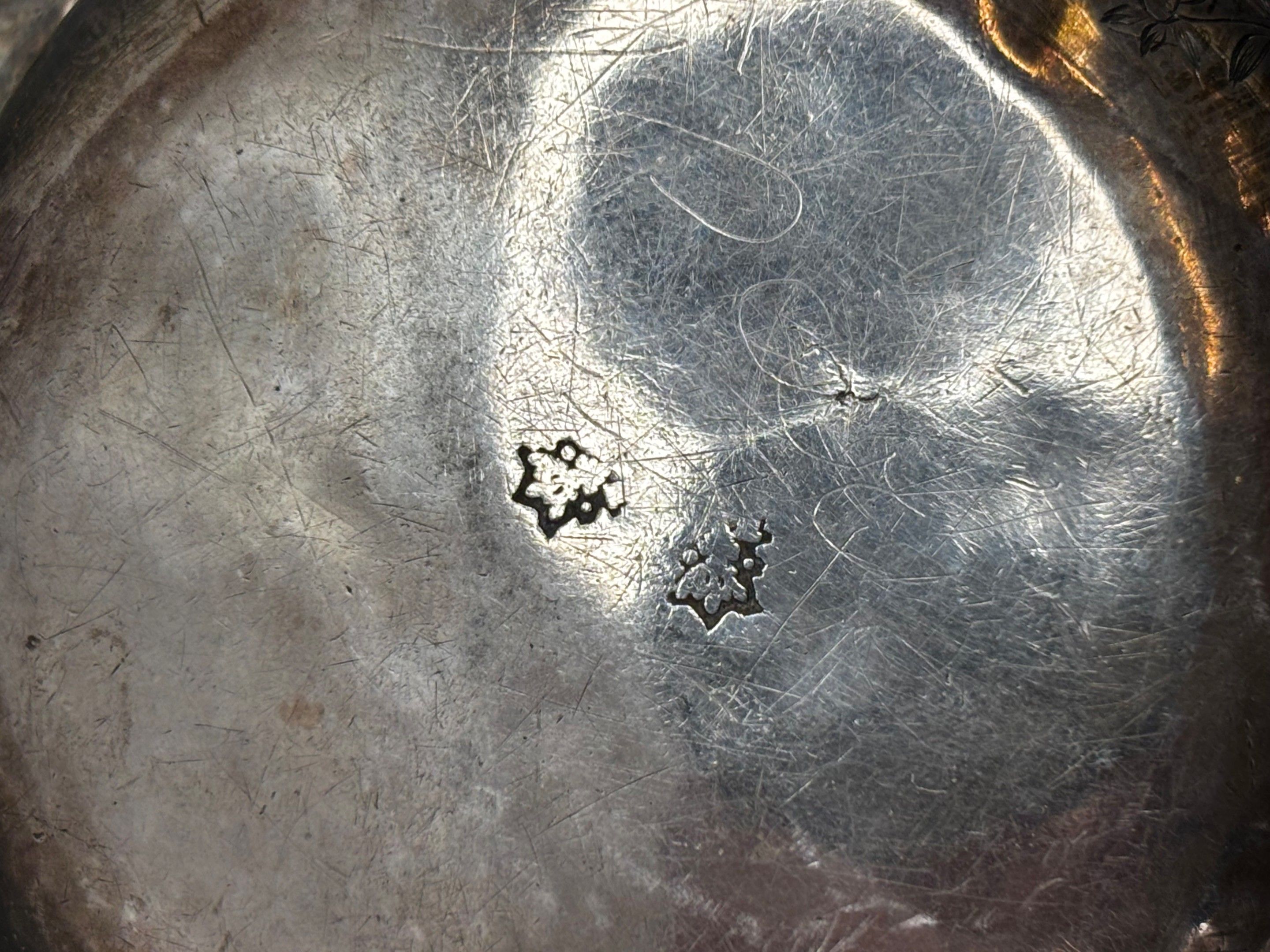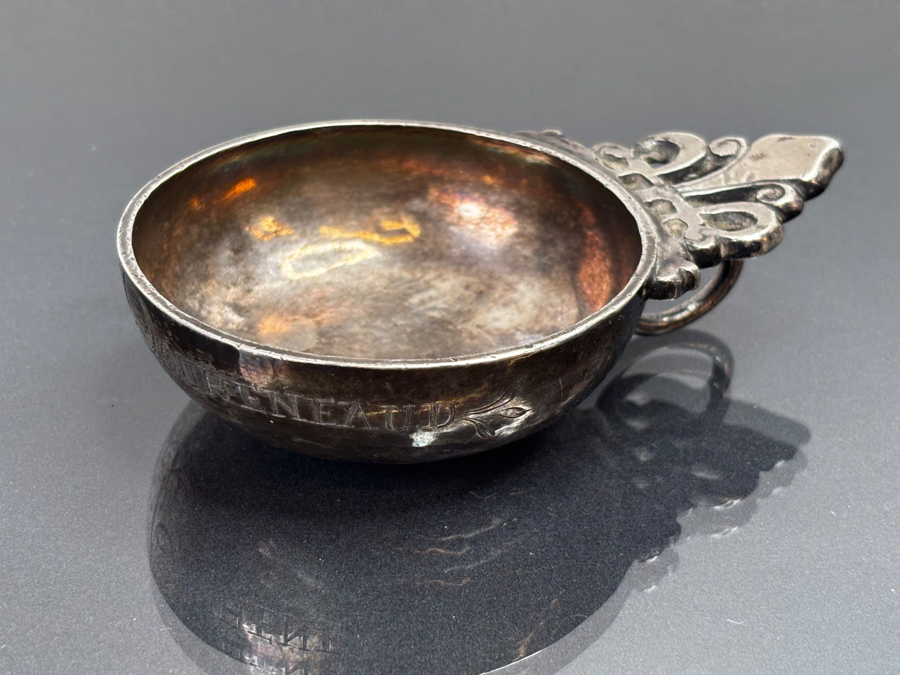 Silver wine cup with fleur-de-lys thumb rest and ring; probably engraved later