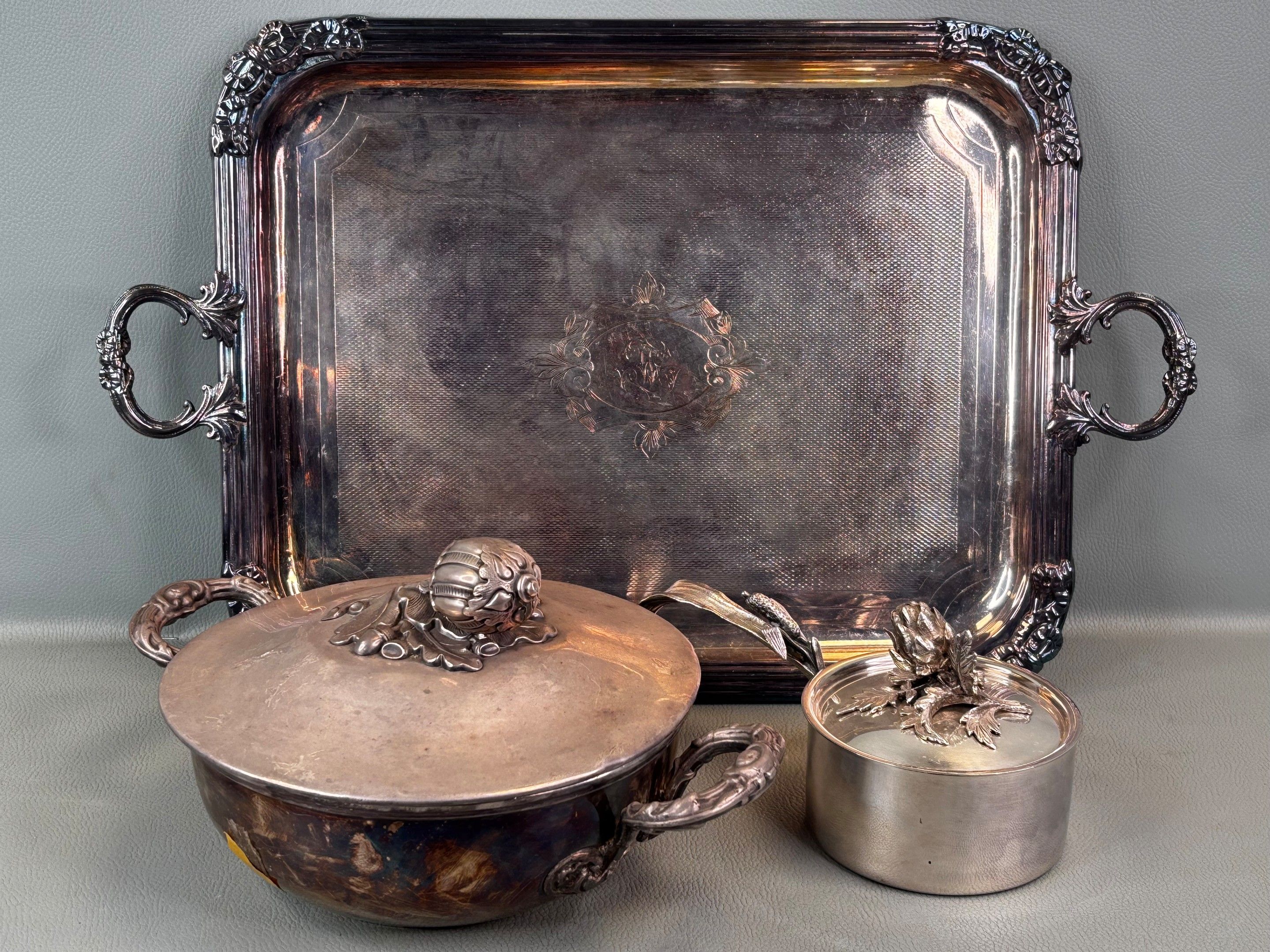 LOT: silver-plated metal saucepan and lid, covered vegetable dish and tray