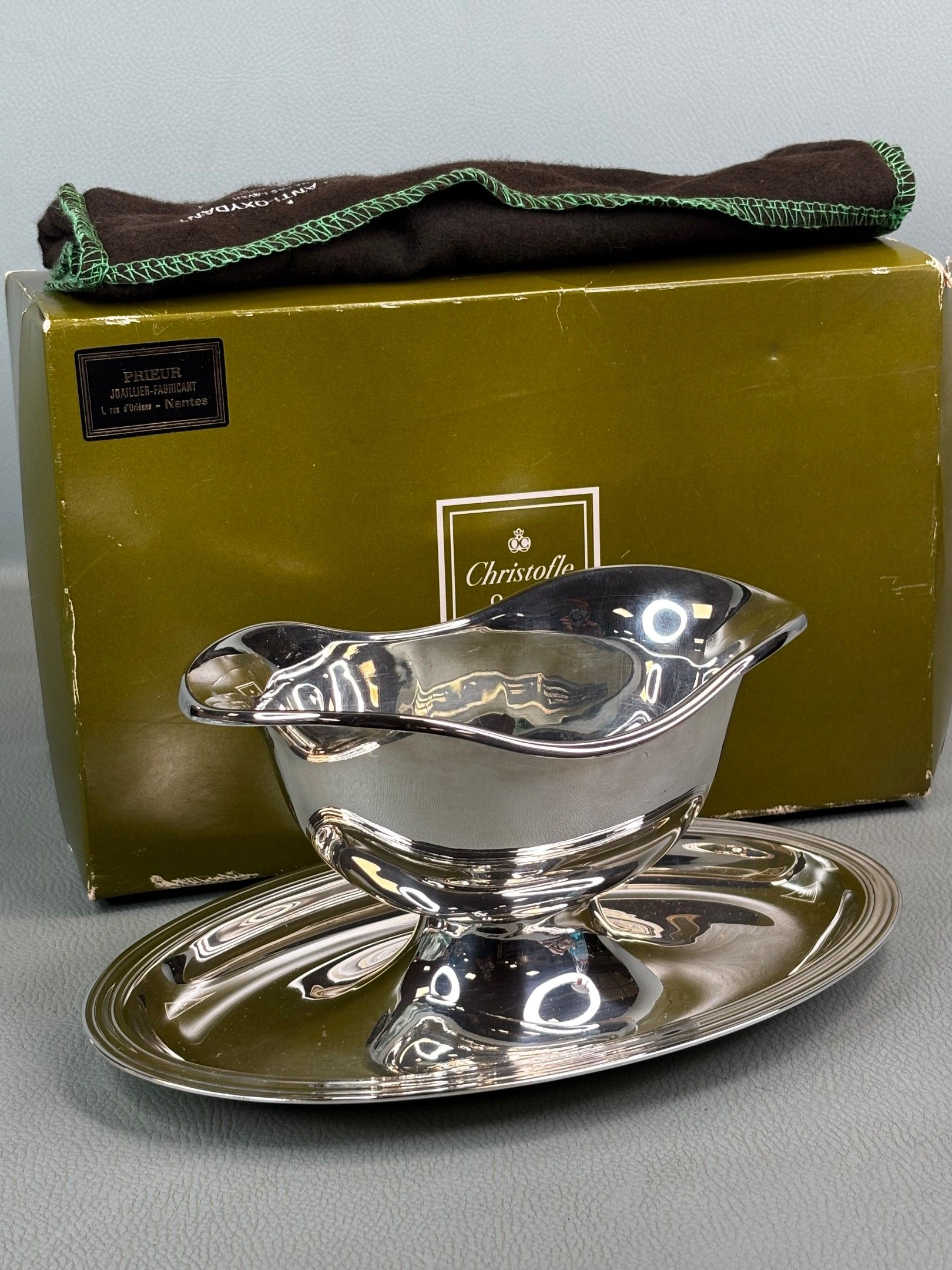 Sauce boat and its silver-plated metal stand; in its box