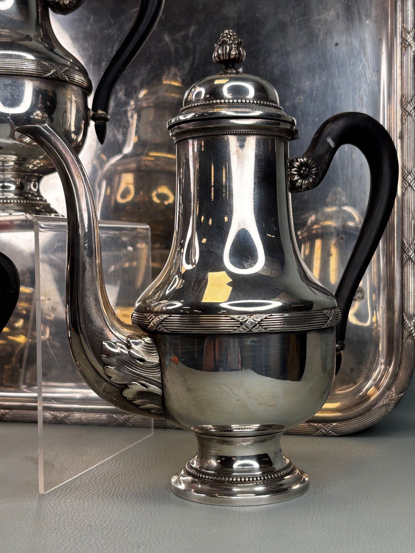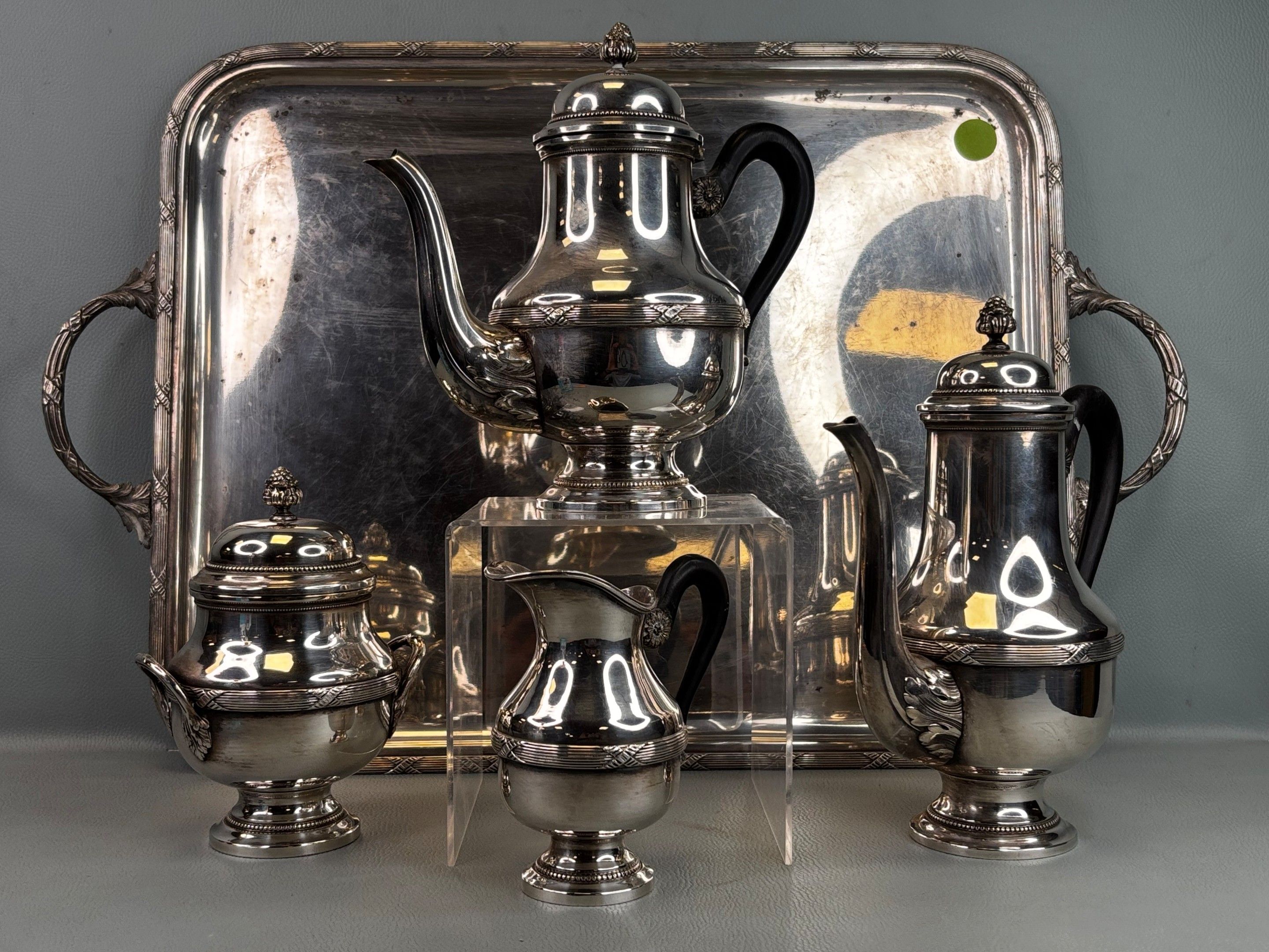 A Louis XVI style silver plated tea and coffee service with blackened wooden handles decorated with crossed ribbons, comprising a tray, two pourers, a milk jug and a covered sugar bowl. Used condition
