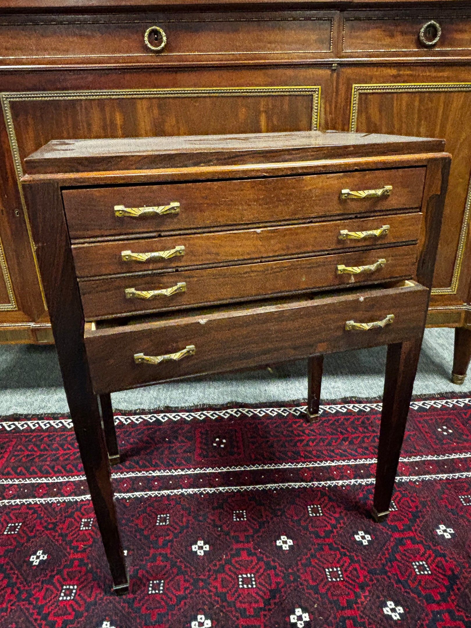A rosewood-veneered menagere cabinet opening to 4 drawers; bronze feet.