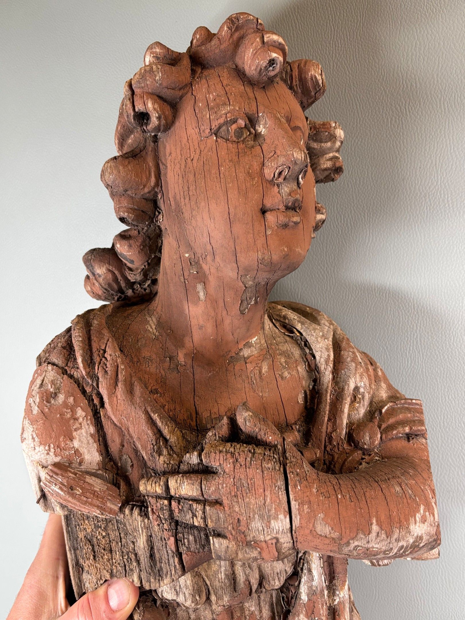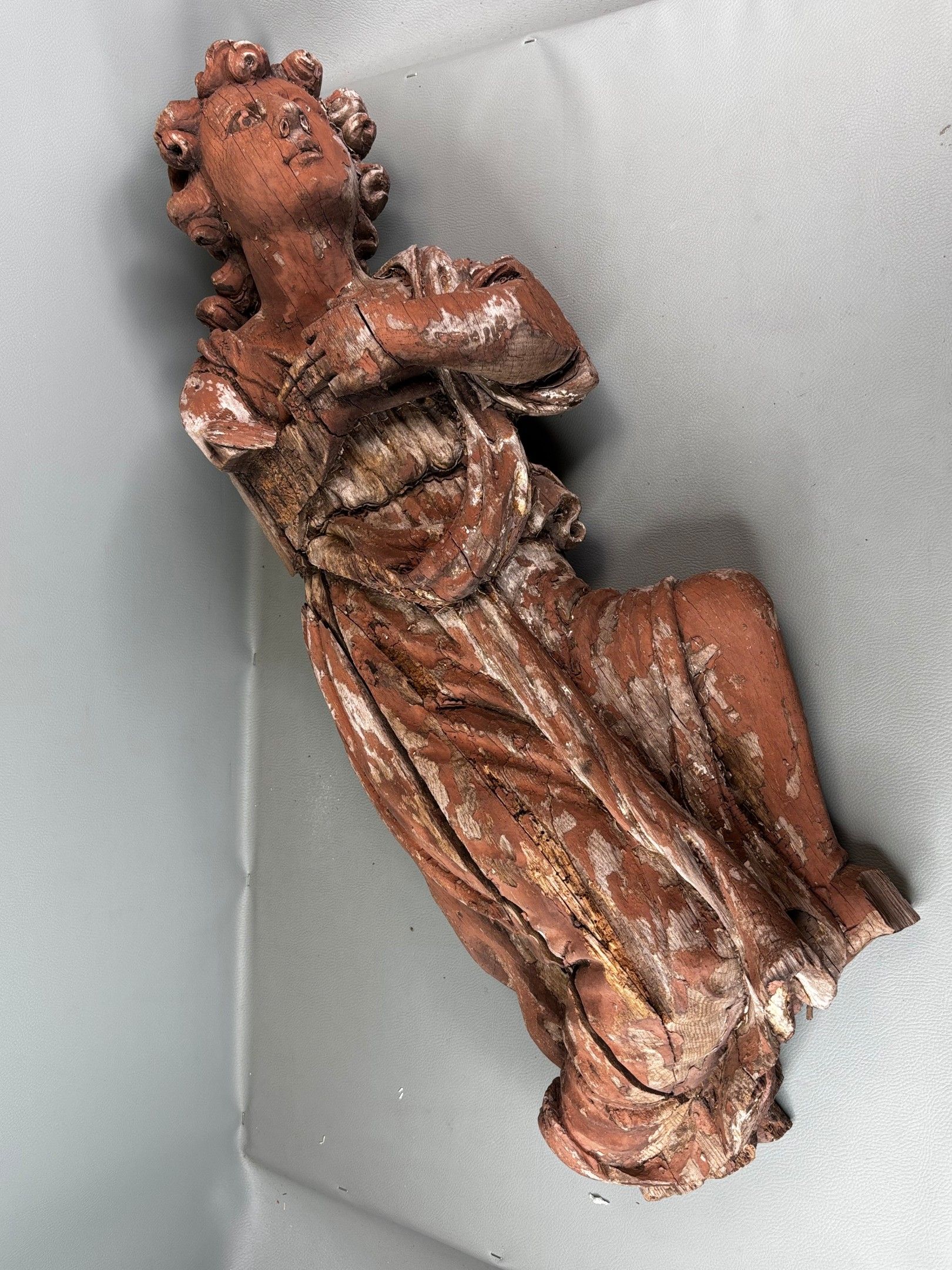 DRAPED FIGURE or SAINT Carved wooden wall group with traces …