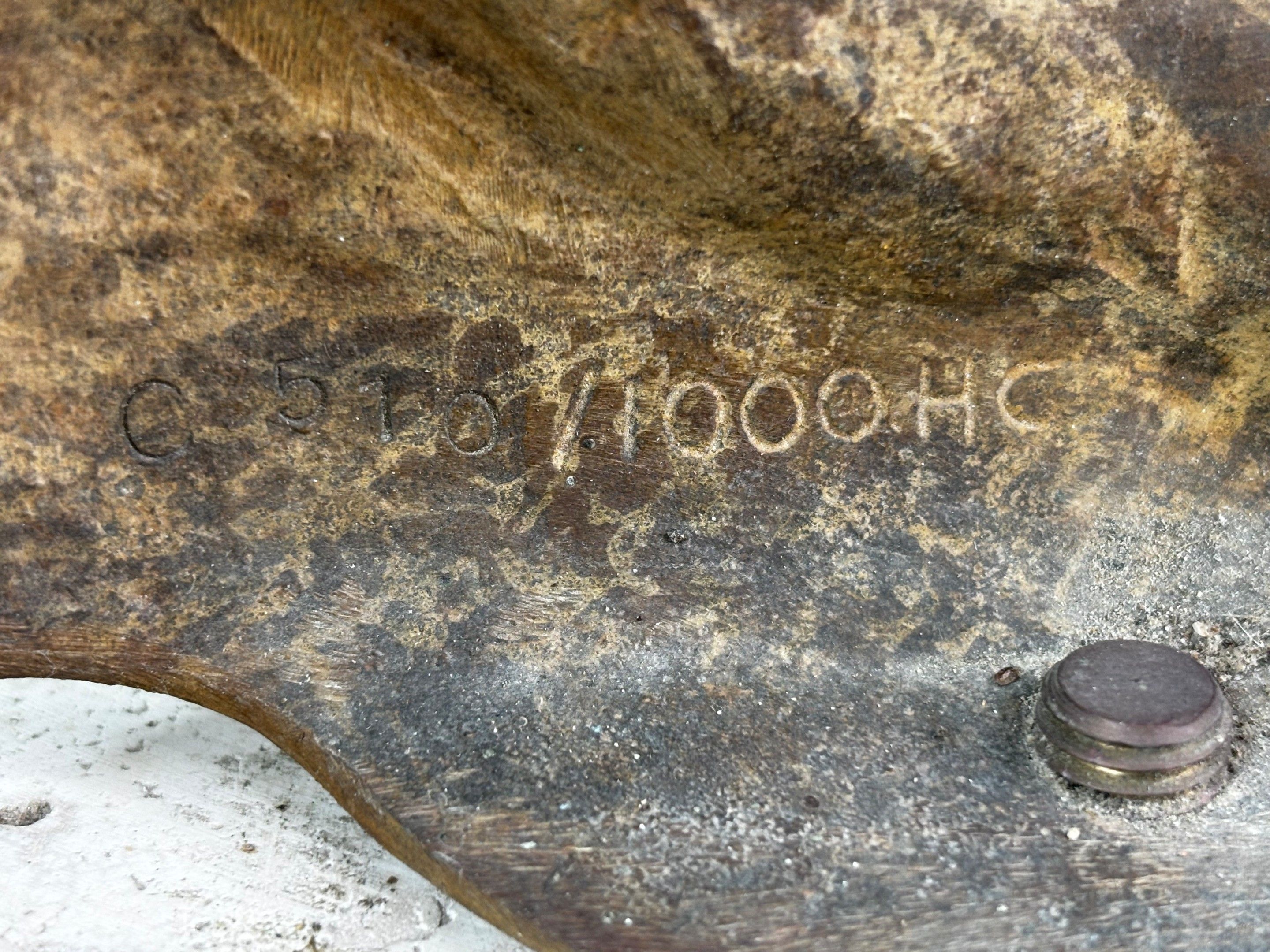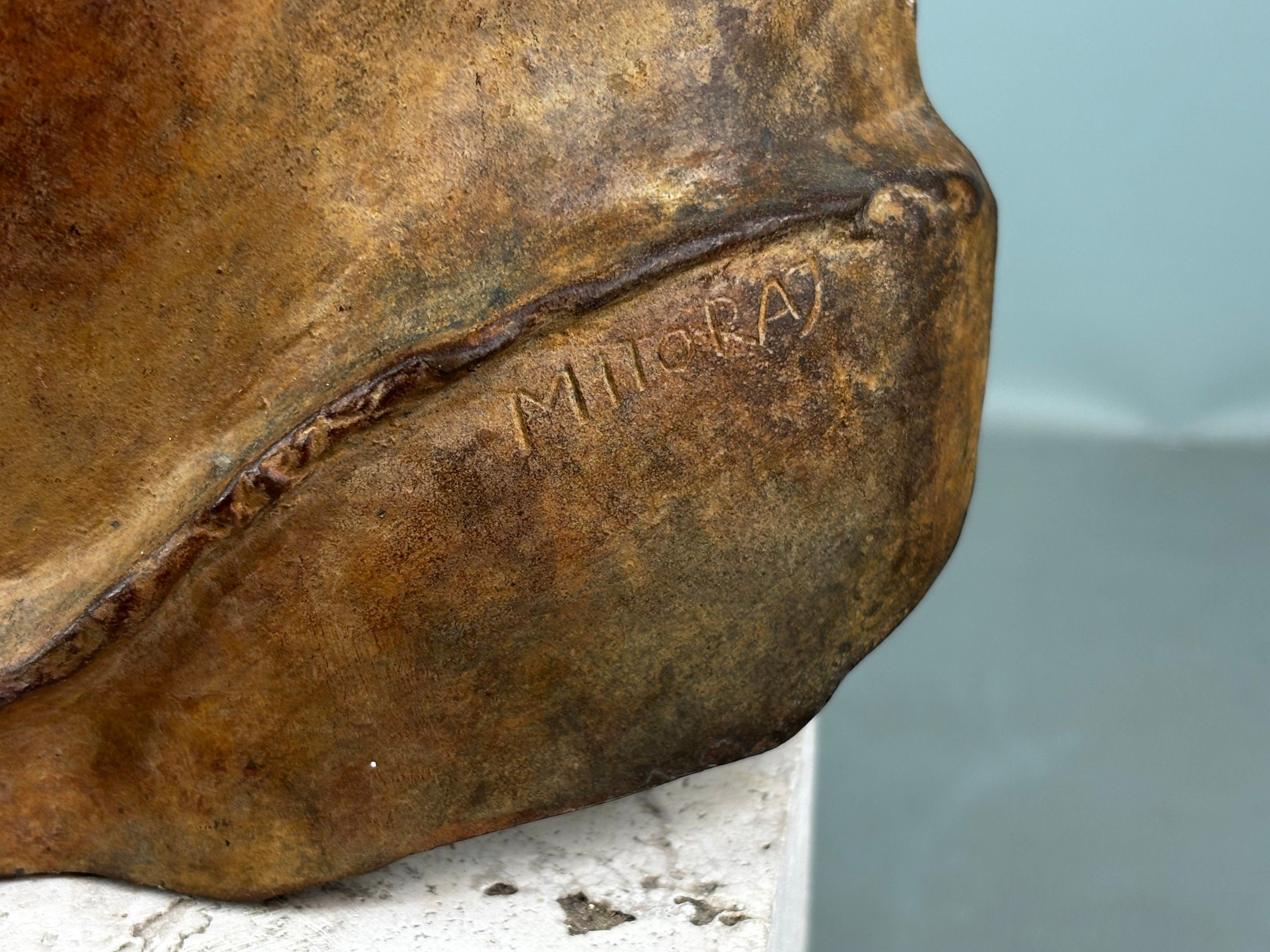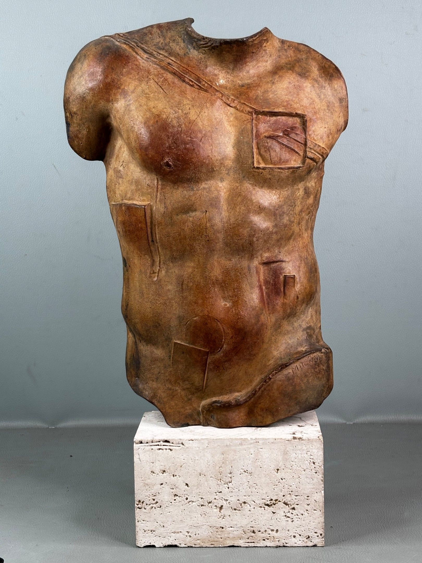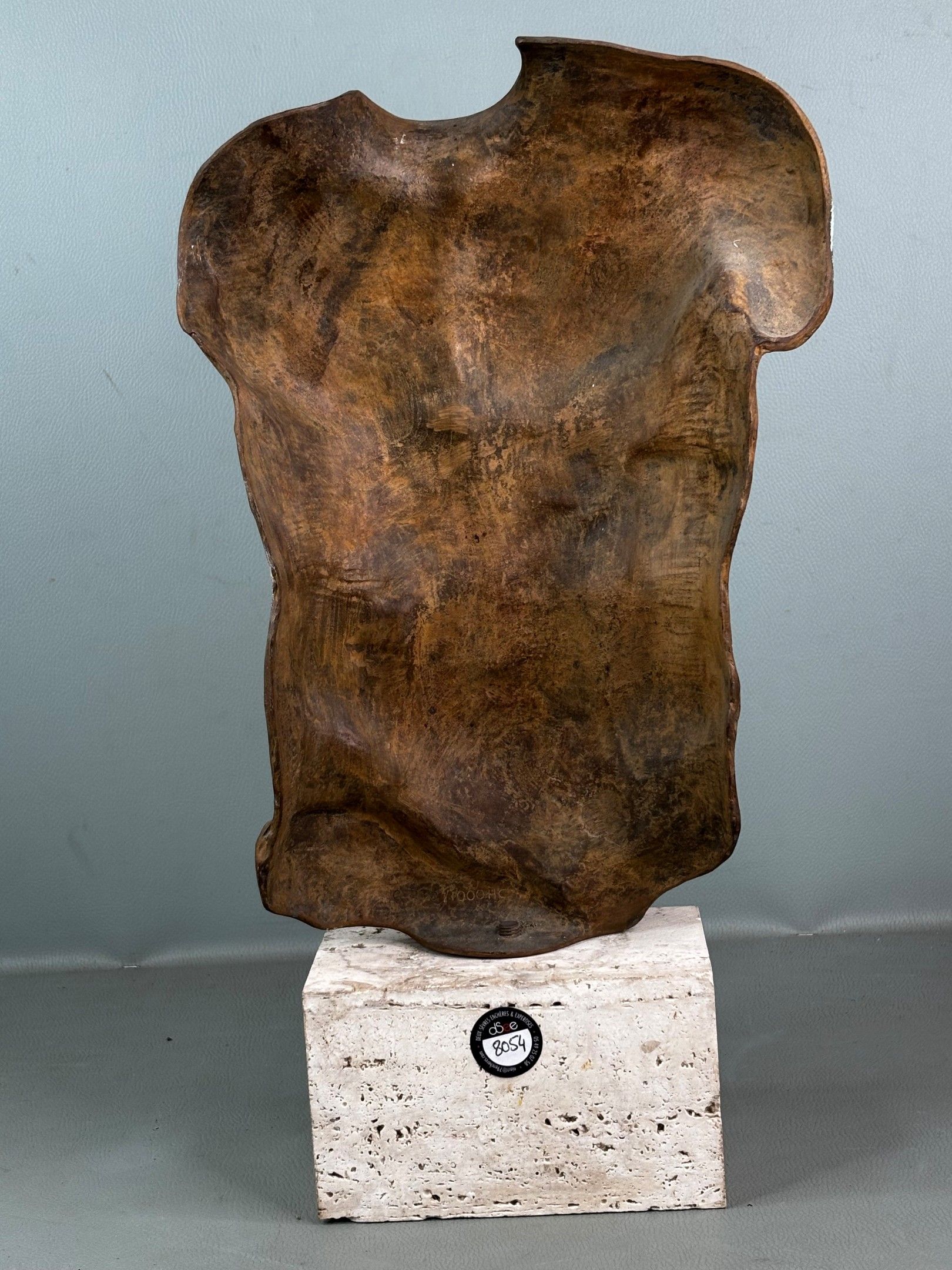 Subject in patinated bronze, signed and no. 510/1000; travertine base.
