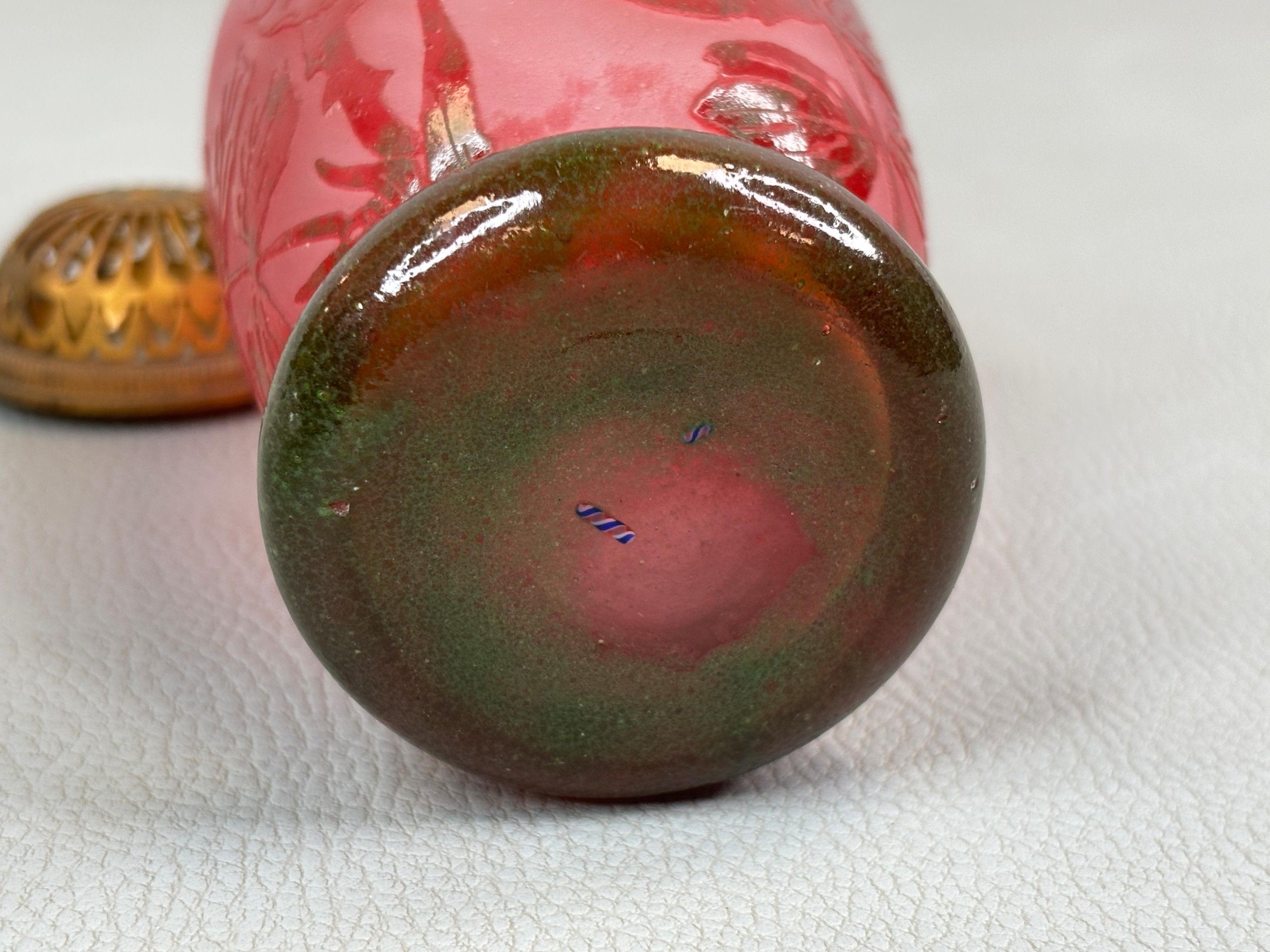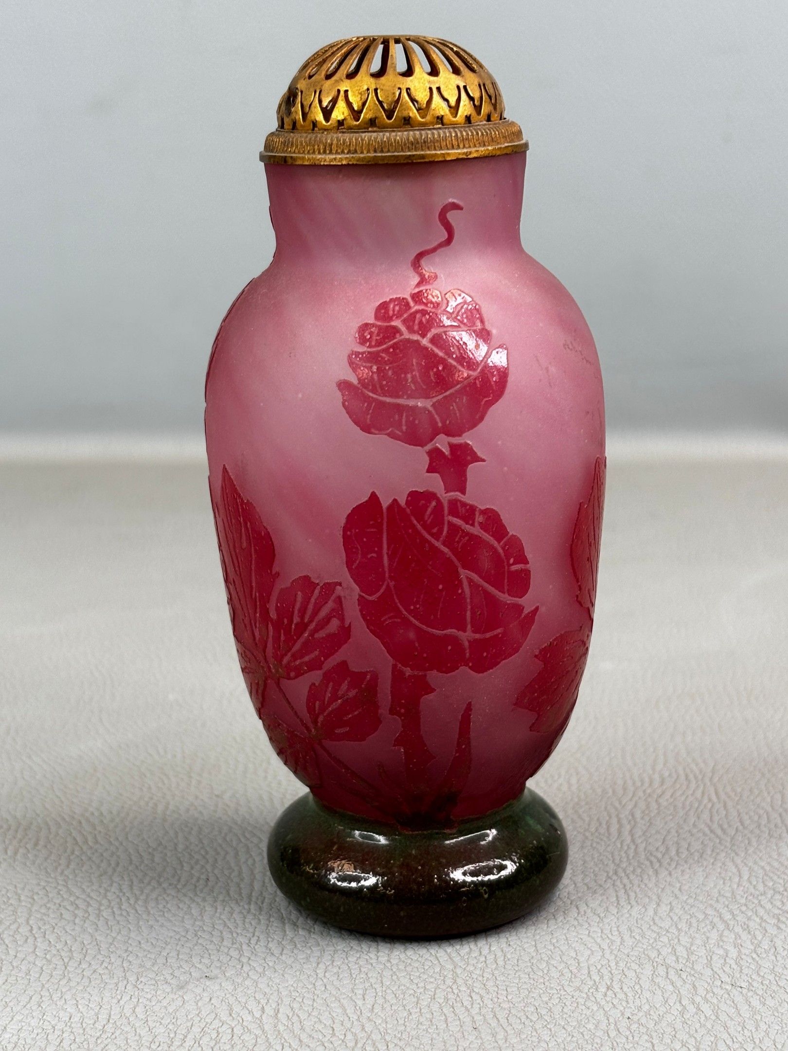 Small glass perfume burner with acid-etched floral design; gilded brass lid. Signed "berlingot".