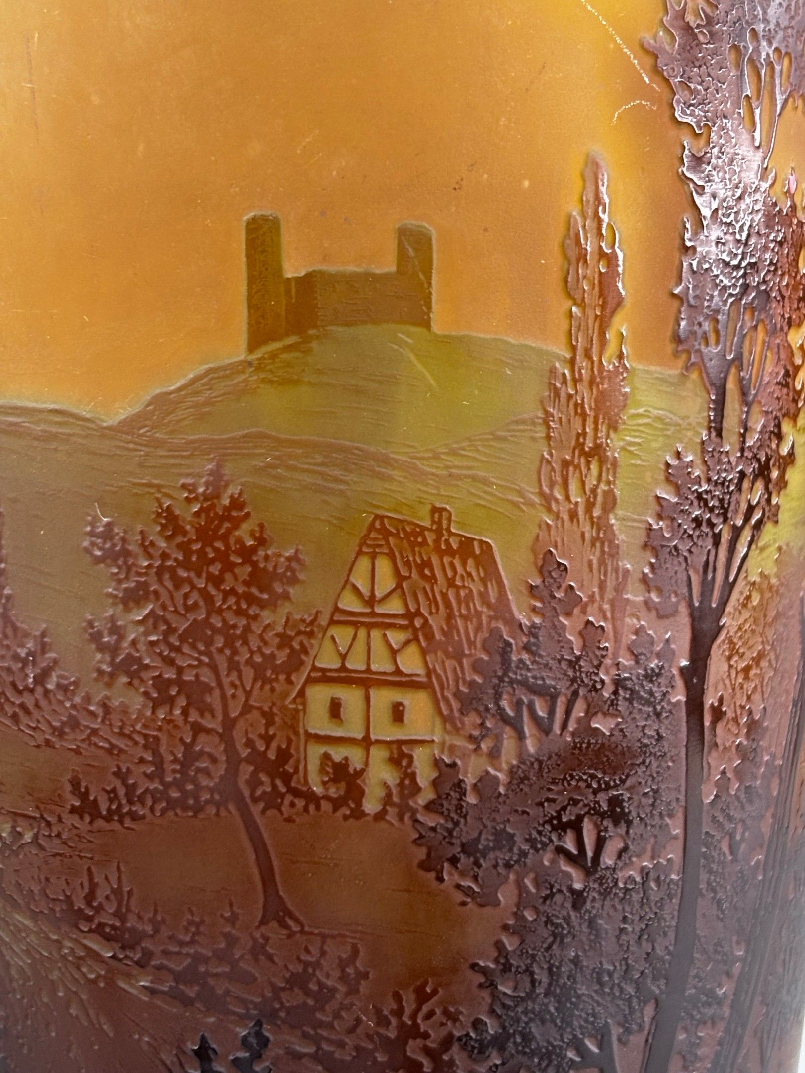 Glass vase with acid-etched decoration of a landscape of Alsace with the castle of Haut Andlau.