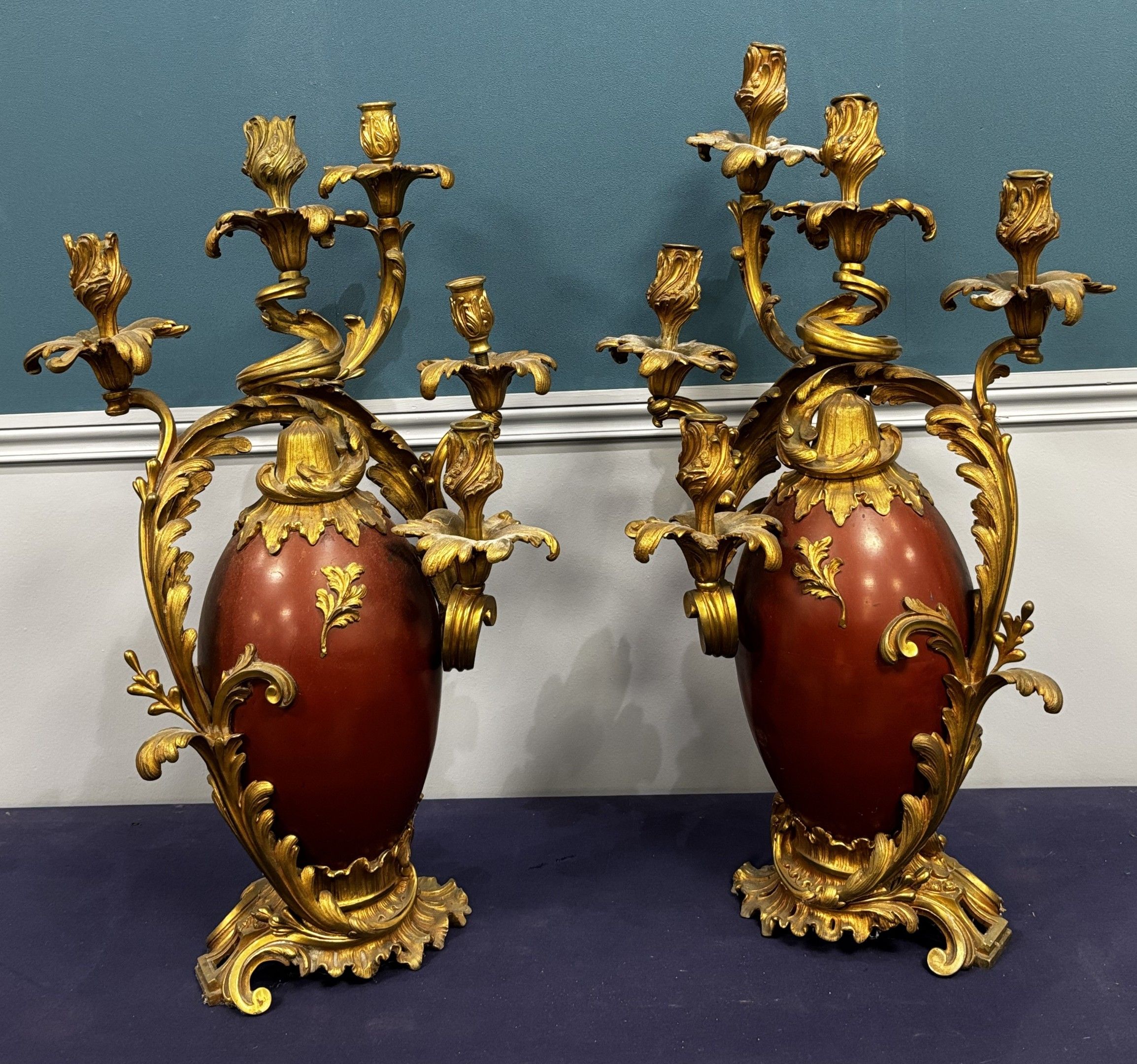 Premium Pair of bronze and red lacquered sheet metal candelabra with…