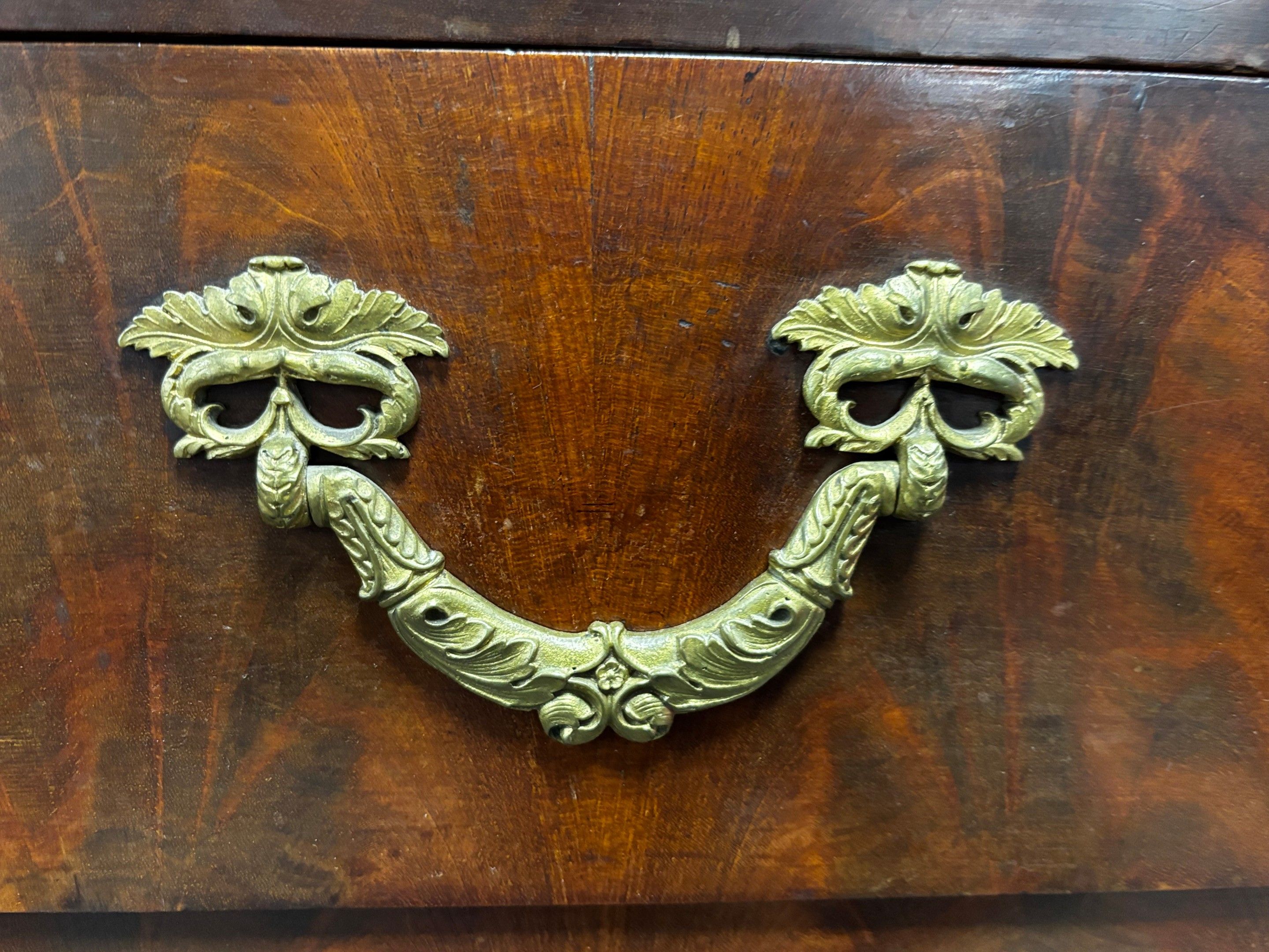 Mahogany veneered COMMODE opening to five drawers; bronze ha…
