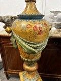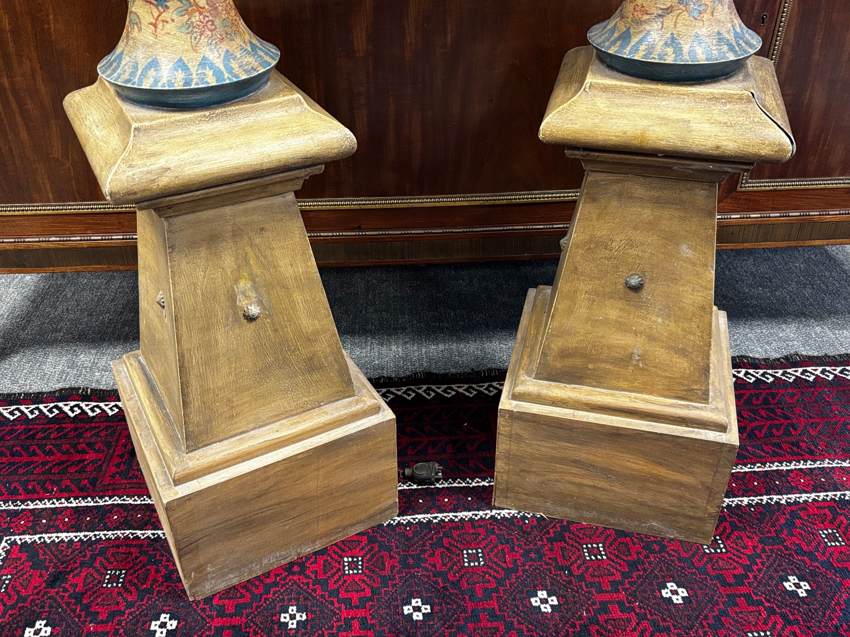 Pair of fire pots in repainted sheet metal; bases and counter-bases in faux-marble painted wood