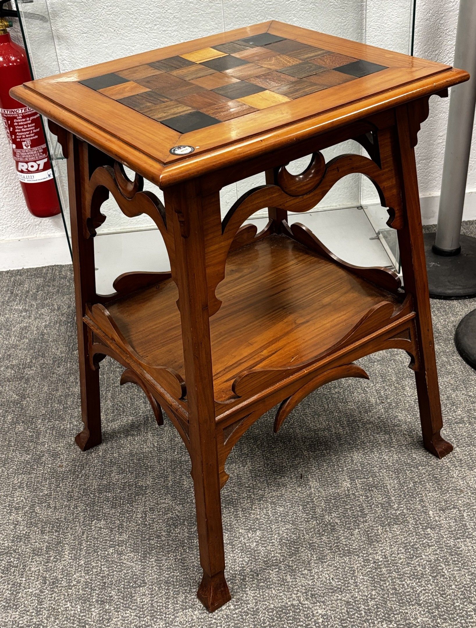 SELLET in natural wood with inlaid checkerboard and crescent motifs