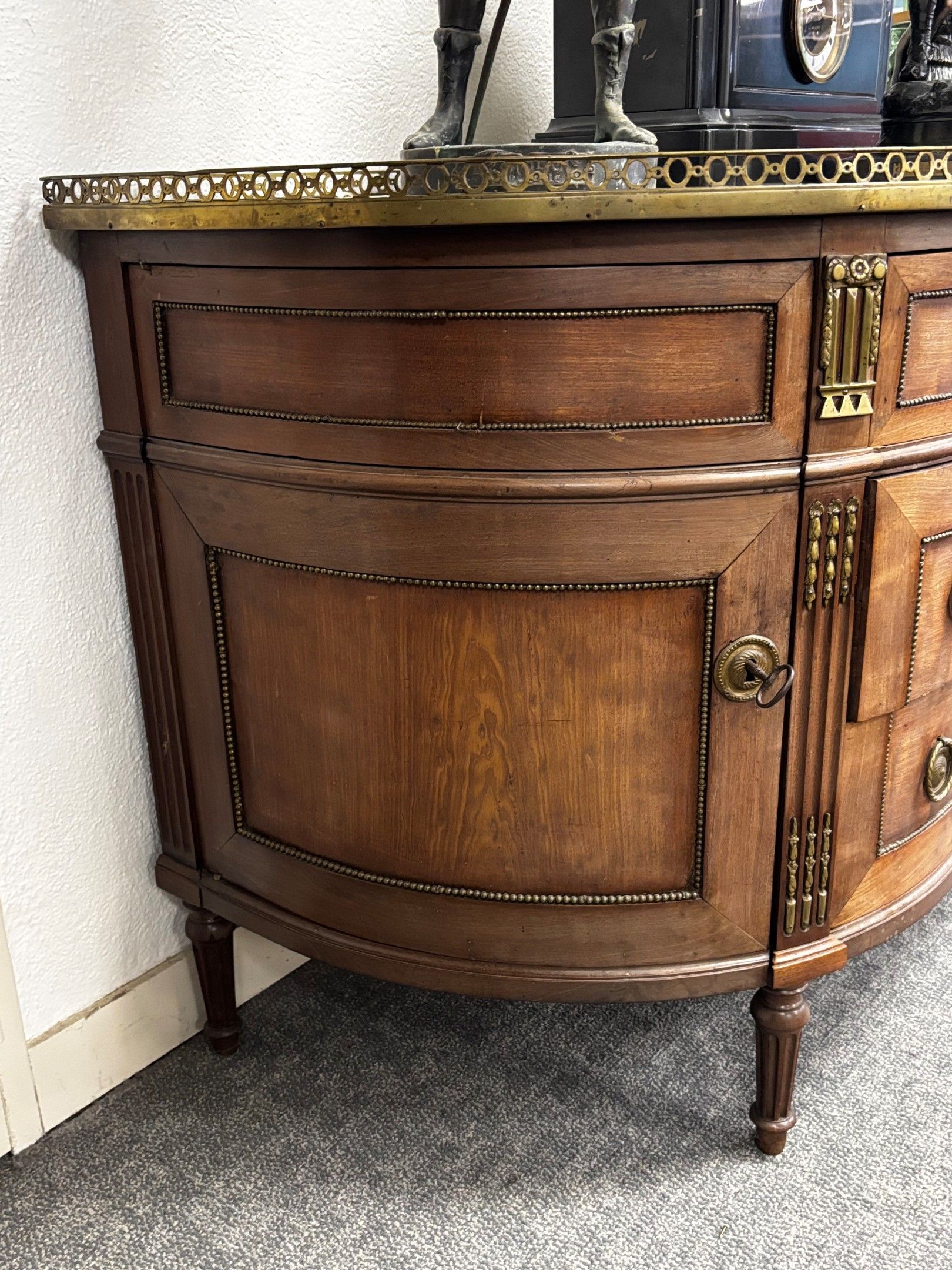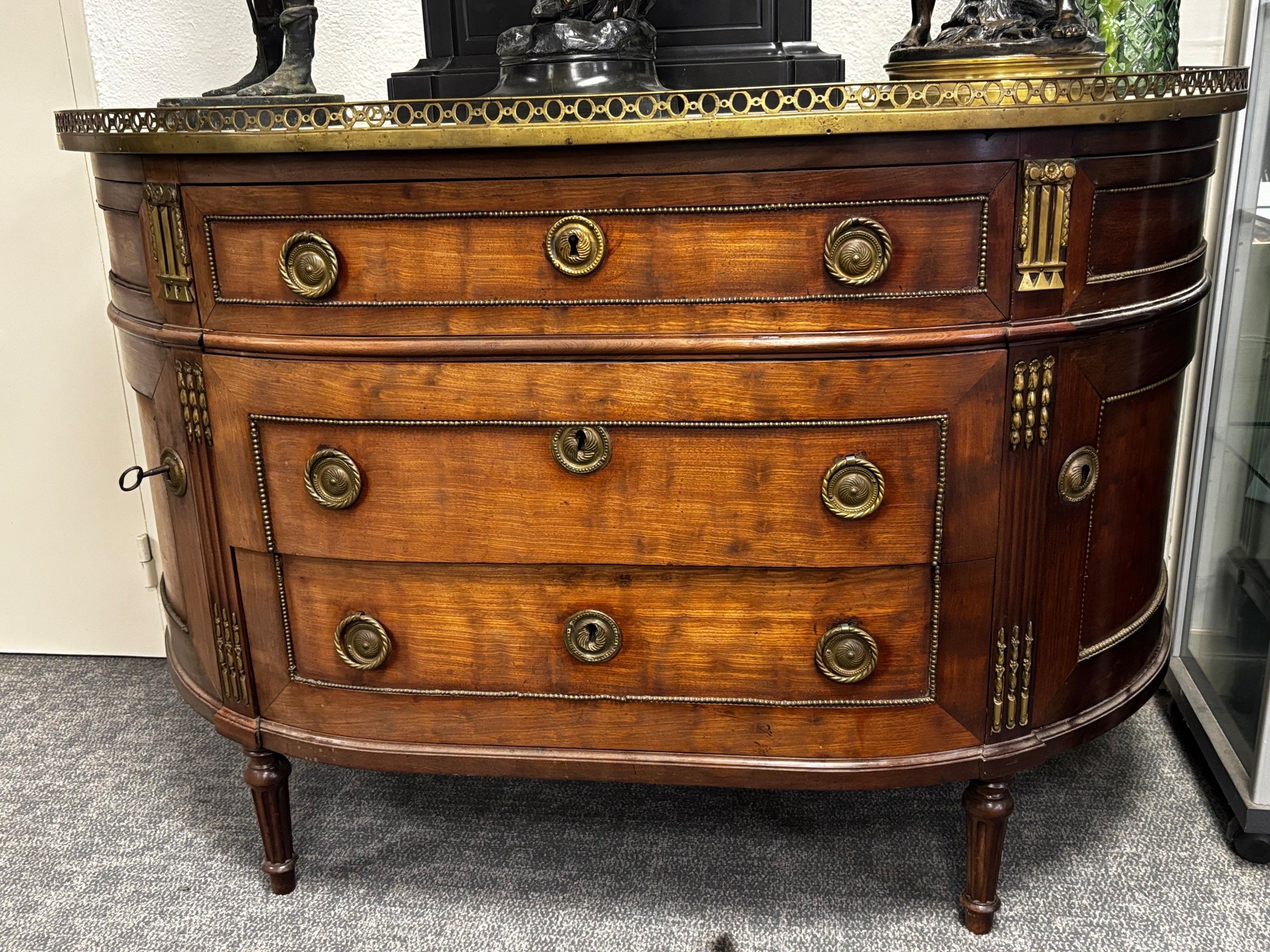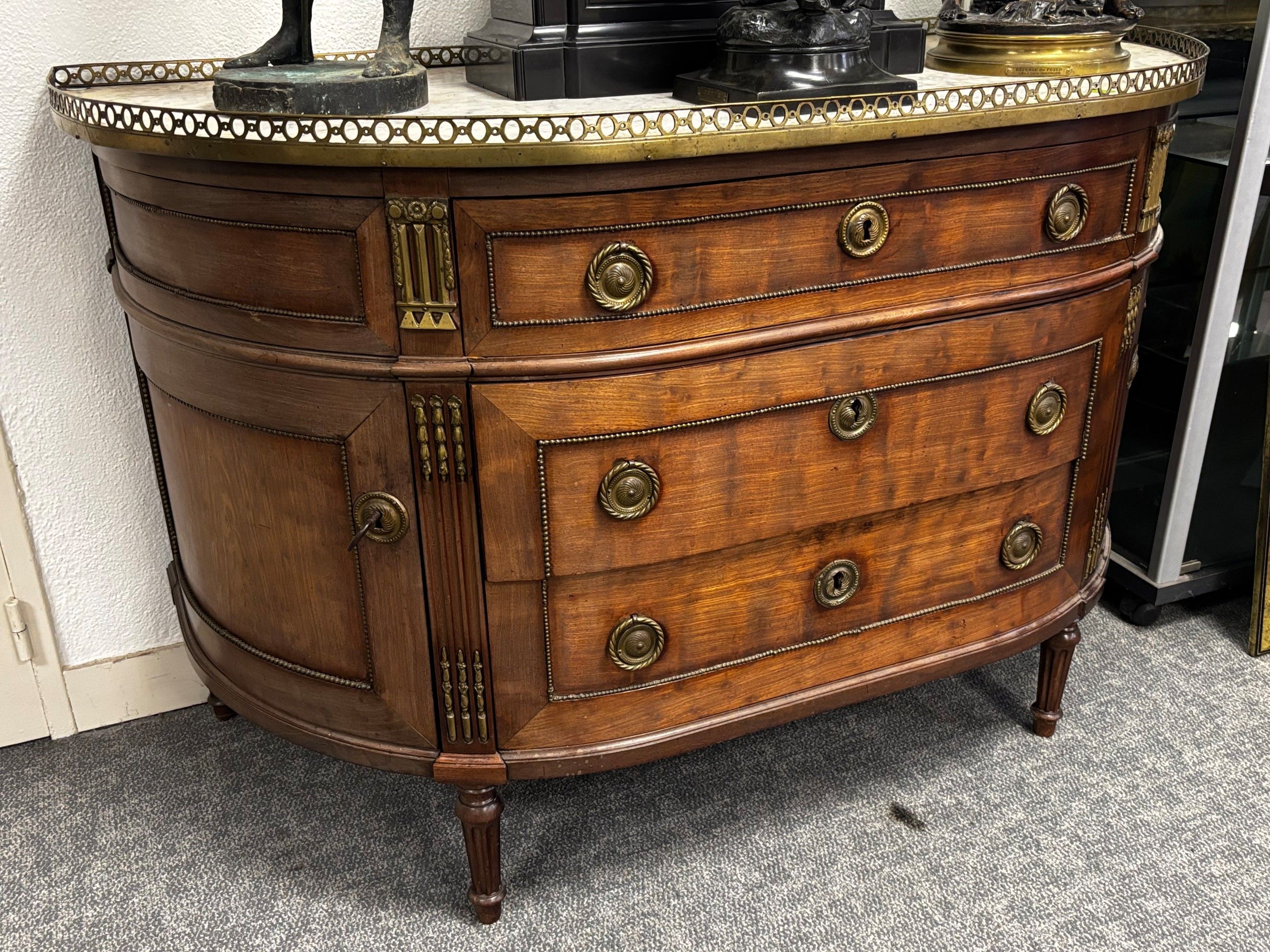 Mahogany and veneered half-moon COMMODE with white marble top and brass gallery
