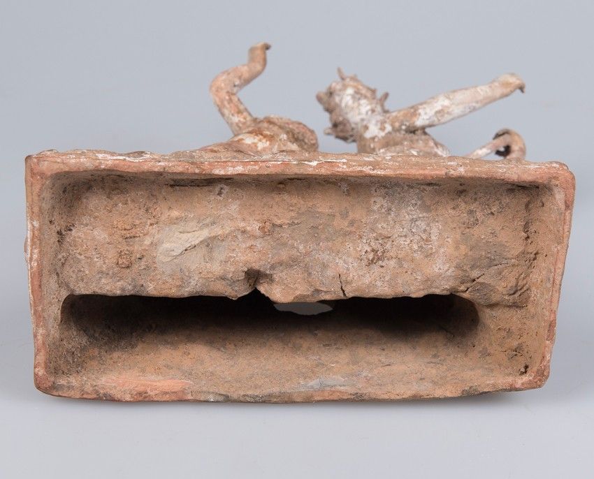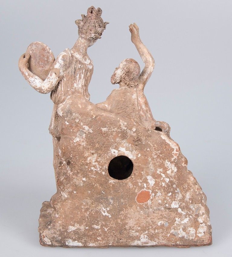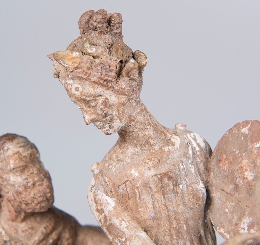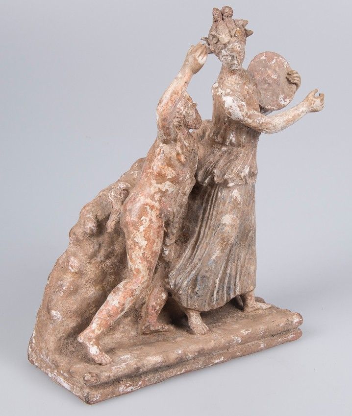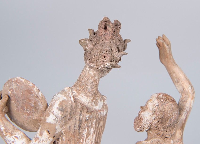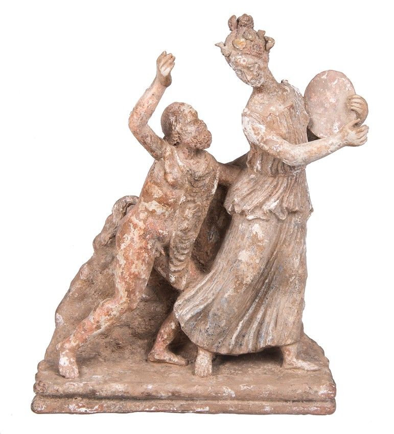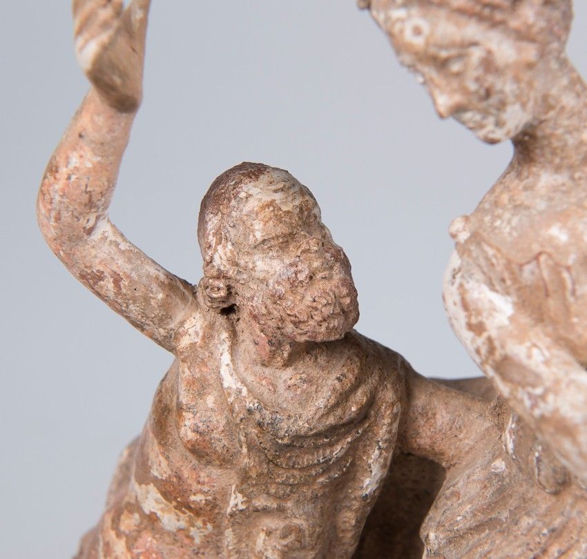 The maenad is dressed in a tunic with folds that masterfully mark the rhythm of the dance. The satyr, whose face constitutes a true portrait (comparable to representations of Socrates by Lysippos), is clothed in a finely detailed ram’s skin. In the Hellenistic period, it was quite characteristic for terracotta sculptures to portray the face of Silenus (a satyr) with the features of Socrates.
